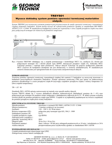 TRSYS01 Wysoce dokładny system pomiaru oporności termicznej materiałów stałych. System TRSYS01 jest terenowym systemem pomiarowym przeznaczonym do analiz oporności termicznej i transmitancji cieplnej elementów budynków. System moŜna uŜywać do wykonywania pomiarów zgodnie ze standardami ISO 9869 i ASTM C1155 / C1046. W standardowej konfiguracji system jest wyposaŜony w dwa czujniki przepływu ciepła oraz dwie pary połączonych termopar do róŜnicowych pomiarów temperatur. Rys. 1 System TRSYS01 składający się z zespołu pomiarowego i kontrolnego MCU (1), zasilacza (2), dwóch par połączonych termopar (4) i dwóch płytek typu HFP01 mierzących przepływ ciepła (5). Jednostka MCU wykonuje pomiary i zapisuje dane pomiarowe. Odczyt danych wykonuje się poprzez podłączenie jednostki MCU czasowo do komputera (komputer nie jest dostarczany w zestawie standardowym). W standardowym zestawie dostarczane jest oprogramowanie do sczytywania zarejestrowanych danych. WPROWADZENIE Terenowe pomiary oporności termicznej, transmitancji cieplnej lub wartości U budynków są zazwyczaj stosowane w badaniach poszczególnych elementów budynków. Pomiar oporności termicznej (TR) jest oparty na jednoczesnym pomiarze uśrednionego w czasie przepływu ciepła Φ (uŜywając czujników przepływu ciepła) i róŜnicy temperatur ∆T (dwa czujniki temperatury). TR = ∆T / Φ Standardy ISO i ASTM opisują zastosowanie tej metody oraz sposób analizy danych. System TRSYS składa się z wysoce dokładnych układów elektronicznych (dokładność pomiaru do 1 µV) oraz połączonych par termopar do pomiaru róŜnic temperatur z dokładnością całkowitą do 0,1oC. W skład systemu wchodzą równieŜ płytki do pomiaru przepływu ciepła typu HFP01. Czujniki te są najbardziej popularnymi na świecie czujnikami do pomiaru przepływu ciepła przez ściany budynków. SPECYFIKACJA SYSTEMU TRSYS01 Metoda pomiaru: określona w normach ISO 9869 i ASTM C1155 / C1046 Miejsca pomiarowe: 2 (moŜna zwiększyć na Ŝyczenie) Zasilanie: 110 – 220 V, 0,5 Watt (max) RóŜnica temperatur (∆T): połączone pary termopar typu KX, 584,3 : 1989 Dokładność pomiaru ∆T: 0,1oC Czujniki przepływu ciepła: typ HFP01 Zabezpieczenie czujników i jednostki kontrolnej MCU: IP63 Długość kabli: 20 m (3x) i 10 m (3x) Pojemność pamięci: dane z okresu >30 dni przy odstępach pomiarowych co 10 min. i uśrednianiu co 24 h Analiza danych: przeprowadzana przez uŜytkownika zgodnie ze standardami ISO i ASTM WYPOSAśENIE OPCJONALNE Czujnik promieniowania słonecznego typu LP02. Zintegrowany zestaw baterii zasilających. GEOMOR-TECHNIK Sp. z o.o., ul. Modra 30, 71-220 SZCZECIN Tel/fax: 91 482 60 87 E-Mail: [email protected] Internet: www.geomor.com.pl NIP 955-16-51-778 REGON: 810988668 Konto bankowe: 58124039721111000042522889 Sąd Rejonowy w Szczecinie, XVII Wydział Gospodarczy KRS nr: 0000034330, Kapitał zakładowy: 50 000,00 PLN