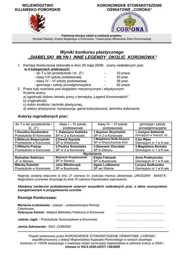 WOJEWÓDZTWO KUJAWSKO-POMORSKIE KORONOWSKIE STOWARZYSZENIE OŚWIATOWE „CORONA” Partnerzy biorący udział w realizacji projektu: Wydział Oświaty Urzędu Miejskiego w Koronowie, Towarzystwo Miłośników Ziemi Koronowskiej Wyniki konkursu plastycznego „DIABELSKI MŁYN I INNE LEGENDY OKOLIC KORONOWA” 1. Komisja Konkursowa dokonała w dniu 29 maja 2008r. oceny nadesłanych prac w 4 kategoriach wiekowych: - do 7-u lat (przedszkole i kl. „0”) 33 prace - klasy I-III szkoły podstawowej 50 prac - klasy IV – VI szkoły podstawowej 56 prac - gimnazja i szkoły ponadgimnazjalne 62 prace 2. Prace były oceniane pod względem merytorycznym i artystycznym. Kryteria oceny: a) zgodność doboru tematu pracy z tematyką „Legend Koronowskich”, b) oryginalność, c) dobór środków i techniki plastycznej, d) walory artystyczne: kompozycja, gama kolorystyczna, technika wykonania. Autorzy nagrodzonych prac: do 7-u lat (przedszkole i kl. „0”) 1.Karolina Sandomierz Przedszkole W Koronowie 2.Mateusz Boguczyński Przedszkole w Koronowie 3.Wiktoria Prekop Przedszkole w Koronowie Radosław Sabiniarz „0” w Sitowcu Mikołaj Sokalski Przedszkole w Koronowie klasy I – III szkoły podstawowej klasy IV – VI szkoły podstawowej 1. Katarzyna Koźlinka 1.Szymon Strychalski SP nr 2 w Koronowie SP nr 2 w Koronowie 2.Magdalena Rolle-Oszywa 2.Dawid Szpojda SP w Wierzchucinie Król. SP w Witoldowie 3.Paulina Ściesińska 3.Sławomir Zboralski SP nr 2 w Koronowie SP w Sitowcu Wyróżnienia Wojciech Krzyżanowski Edyta Fabiszak SP w Sitowcu SP w Buszkowie Julia Włodarczyk Agata Ludkiewicz SP w Buszkowie SP we Wtelnie gimnazja i szkoły ponadgimnazjalne 1.Justyna Stefaniak Gimnazjum w Wierzch. Kr. 2.Iza Wijas Gimnazjum nr 1 w K-wie 3.Magdalena Boińska Gimnazjum nr 1 w K-wie Anna Podwysocka Gimnazjum nr 1 w K-wie Lucyna Sadkowska Gimnazjum nr 1 w K-wie Nagrody zostaną wręczone w dniu 21 czerwca br. podczas imprezy plenerowej „URODZINY MIASTA”. Nagrodzeni uczniowie otrzymają do dnia 10 czerwca indywidualne zaproszenia. Składamy serdeczne podziękowanie autorom wszystkich nadesłanych prac, a także nauczycielom zaangażowanym w przygotowanie uczniów. Komisja Konkursowa: Marianna Łodziewska – plastyk – przewodnicząca Komisji Członkowie: Katarzyna Karwat - Miejska Biblioteka Publiczna w Koronowie ………………………………………. Jolanta Jagła – Przedszkole Samorządowe w Koronowie ………………………………………. Janina Zakrzewska - KSO „CORONA” ………………………………………. ………………………………………. Projekt realizowany przez KORONOWSKIE STOWARZYSZENIE OŚWIATOWE „CORONA”, współfinansowany z dotacji Województwa Kujawsko-Pomorskiego w ramach otwartego konkursu nr 1/2008 związanego z realizacją zadań samorządu województwa w zakresie kultury w 2008 r. Umowa nr KN.II.3020-UDOT-136/2008