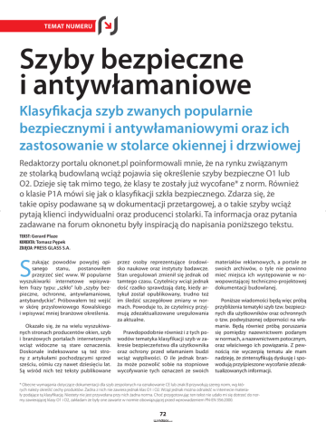 TEMAT NUMERU Szyby bezpieczne i antywłamaniowe Klasyfikacja szyb zwanych popularnie bezpiecznymi i antywłamaniowymi oraz ich zastosowanie w stolarce okiennej i drzwiowej Redaktorzy portalu oknonet.pl poinformowali mnie, że na rynku związanym ze stolarką budowlaną wciąż pojawia się określenie szyby bezpieczne O1 lub O2. Dzieje się tak mimo tego, że klasy te zostały już wycofane* z norm. Również o klasie P1A mówi się jak o klasyfikacji szkła bezpiecznego. Zdarza się, że takie opisy podawane są w dokumentacji przetargowej, a o takie szyby wciąż pytają klienci indywidualni oraz producenci stolarki. Ta informacja oraz pytania zadawane na forum oknonetu były inspiracją do napisania poniższego tekstu. TEKST: Gerard Plaze KOREKTA: Tomasz Pępek ZDJĘCIA: PRESS GLASS S.A. S zukając powodów powyżej opisanego stanu, postanowiłem przejrzeć sieć www. W popularne wyszukiwarki internetowe wpisywałem frazy typu: „szkło” lub „szyby bezpieczne, ochronne, antywłamaniowe, antybandyckie”. Próbowałem też wejść w skórę przysłowiowego Kowalskiego i wpisywać mniej branżowe określenia. Okazało się, że na wielu wyszukiwanych stronach producentów okien, szyb i branżowych portalach internetowych wciąż widoczne są stare oznaczenia. Doskonale indeksowane są też strony z artykułami pochodzącymi sprzed sześciu, ośmiu czy nawet dziesięciu lat. Są wśród nich też teksty publikowane przez osoby reprezentujące środowisko naukowe oraz instytuty badawcze. Stan uregulowań zmienił się jednak od tamtego czasu. Czytelnicy wciąż jednak dość rzadko sprawdzają datę, kiedy artykuł został opublikowany, trudno też im śledzić szczegółowe zmiany w normach. Powoduje to, że czytelnicy przyjmują zdezaktualizowane uregulowania za aktualne. Prawdopodobnie również i z tych powodów tematyka klasyfikacji szyb w zakresie bezpieczeństwa dla użytkownika oraz ochrony przed włamaniem budzi wciąż wątpliwości. O ile jednak branża może pozwolić sobie na stopniowe wycofywanie tych oznaczeń ze swoich materiałów reklamowych, a portale ze swoich archiwów, o tyle nie powinno mieć miejsca ich występowanie w nowopowstającej techniczno-projektowej dokumentacji budowlanej. Poniższe wiadomości będą więc próbą przybliżenia tematyki szyb tzw. bezpiecznych dla użytkowników oraz ochronnych o tzw. podwyższonej odporności na włamanie. Będą również próbą poruszania się pomiędzy nazewnictwem podanym w normach, a nazewnictwem potocznym, oraz właściwego ich powiązania. Z pewnością nie wyczerpią tematu ale mam nadzieję, że zintensyfikują dyskusję i spowodują przyśpieszone wycofanie zdezaktualizowanych informacji. * Obecne wymagania dotyczące dokumentacji dla szyb zespolonych na oznakowanie CE lub znak B przywołują szereg norm, wg których należy określić cechy produktów. Żadna z nich nie zawiera jednak klas O1 i O2. Wciąż jednak można odnaleźć w internecie materiały podające tą klasyfikację. Niestety nie jest przywołana przy nich żadna norma. Choć przygotowując ten tekst nie udało mi się dotrzeć do normy zawierającej klasy O1 i O2, zakładam że były one zawarte w normie obowiązującej przed wprowadzeniem PN-EN 356:2000. 72 SZKŁO Z pewnością nie można zacząć inaczej niż od podania źródeł, które będą wielokrotnie przytaczane, czyli obowiązującego na dzień 23 kwietnia 2012 roku stanu norm. Są to: 1. PN-EN 356:2000 Szkło w budownictwie – Szyby ochronne – Badania i klasyfikacja odporności na ręczny atak. Wprowadza: EN 356:1999 [IDT] 2. PN-EN 12600:2004 Szkło w budownictwie – Badanie wahadłem – Udarowa metoda badania i klasyfikacja szkła płaskiego. Wprowadza: EN 12600:2002 [IDT] 3. PN-EN ISO 12543-1:2011 Szkło w budownictwie – Szkło warstwowe i bezpieczne szkło warstwowe – Część 1: Definicje i opis części składowych (oryg.) Wprowadza: EN ISO 12543-1:2011 [IDT]. Zastępuje: PN-EN ISO 12543-1:2000 4. PN-EN ISO 12543-2:2011 Szkło w budownictwie – Szkło warstwowe i bezpieczne szkło warstwowe – Część 2: Bezpieczne szkło warstwowe (oryg.) Wprowadza: EN ISO 12543-2:2011 [IDT]. Zastępuje: PN-EN ISO 12543-2:2000 | PN-EN ISO 12543-2:2000/A1:2005. 5. PN-EN ISO 12543-3:2011 Szkło w budownictwie – Szkło warstwowe i bezpieczne szkło warstwowe – Część 3: Szkło warstwowe (oryg.) Wprowadza: EN ISO 12543-3:2011 [IDT]. Zastępuje: PN-EN ISO 12543-3:2000 6. PN-EN 12150-1:2002 Szkło w budownictwie – Termicznie hartowane bezpieczne szkło sodowo-wapniowokrzemianowe – Część 1: Definicje i opis Wprowadza: EN 12150-1:2000 [IDT] Zastępuje: PN-EN 12150-1:2002 7. PN-EN 12150-2:2006 Szkło w budownictwie – Termicznie hartowane bezpieczne szkło sodowo-wapniowo-krzemianowe – Część 2: Ocena zgodności wyrobu z normą Wprowadza: EN 12150-2:2004 [IDT] Zastępuje: PN-EN 12150-2:2005 8. PN-EN 1627:2011 Drzwi, okna, ściany osłonowe, kraty i żaluzje – Odporność na włamanie – Wymagania i klasyfikacja (oryg.) Wprowadza: EN 1627:2011 [IDT] Zastępuje: PN-ENV 1627:2006 Warto też określić co właściwie powinny oznaczać, używane przez branżę potoczne pojęcia „szyby bezpieczne” i „szyby antywłamaniowe” oraz jakiego rodzaju szyby mogą spełniać te funkcje. Szyby bezpieczne Określenie to – w rozumieniu potocznym stosowanym przez producentów stolarki okiennej i drzwiowej – przypisywane jest najczęściej szybom warstwowym, tzw. laminowanym, składającym się z dwóch tafli szkła o grubości 3 mm, przedzielonych (na trwale je łączącą) warstwą z folii PVB o grubości 0,38 mm. Skrócony zapis to VSG 33.1 - 6,4 mm. Ta konstrukcja przypisywana była również najczęściej do wycofanych klas O1 lub O2. Nazwa szyby bezpieczne obejmuje jednak dużo szerszy zakres produktów. Podawana jest w przytoczonych normach 3), 4), 5), 6) i 7). Dotyczy zarówno szkła warstwowego, w tym potocznie zwanego laminowanym, szkła warstwowego o właściwo