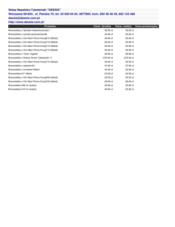 Sklep Nepalsko-Tybetański "DEESIS" Warszawa 00-834, ul. Pańska 75, tel. 22 620 03 04, 3977805. kom. 692 46 46 49, 602 133 466 [email protected] http://www.deesis.com.pl/ Produkty Cena (brutto) Cena (netto) Bransoletka z Symbol nieskończoności * 35.50 zł 35.50 zł Bransoletka z symbol pomyslnosci08 24.90 zł 24.90 zł Bransoletka z Om Mani Peme Hung510 (Metal) 29.90 zł 29.90 zł Bransoletka z Om Mani Peme Hung710 (Metal) 30.00 zł 30.00 zł Bransoletka z Om Mani Peme Hung712 (Metal) 30.00 zł 30.00 zł Bransoletka z Om Mani Peme Hung713 (Metal) 30.00 zł 30.00 zł Bransoletka z Tashi Tage02 29.90 zł 29.90 zł Bransoletka z Srebro Smok Tybetański 11 675.00 zł 675.00 zł Bransoletka z Om Mani Peme Hung712 (Metal) 30.00 zł 30.00 zł Bransoletka z sybolami01 37.90 zł 37.90 zł Bransoletka z smokami Metal* 23.50 zł 23.50 zł Bransoletka 611 Metal 24.95 zł 24.95 zł Bransoletka z Om Mani Peme Hung509 (Metal) 25.50 zł 25.50 zł Bransoletka z Om Mani Peme Hung723 (Metal) 29.00 zł 29.00 zł Bransoletka 506 (3 metalu) 25.90 zł 25.90 zł Bransoletka 510 (3 metalu) 25.90 zł 25.90 zł Cena promocyjna