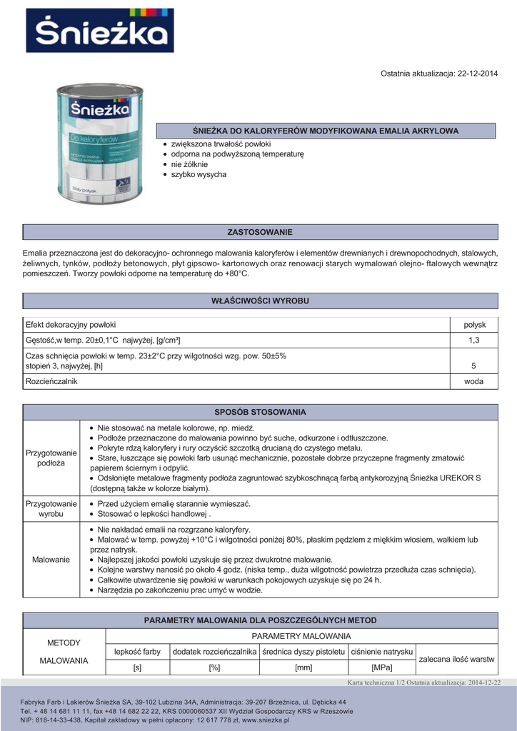 Ostatnia aktualizacja: 22-12-2014 ŚNIEŻKA_DO_KALORYFERÓW_MODYFIKOWANA_EMALIA_AKRYLOWA ŚNIEŻKA DO KALORYFERÓW MODYFIKOWANA EMALIA AKRYLOWA zwiększona trwałość powłoki odporna na podwyższoną temperaturę nie żółknie szybko wysycha ZASTOSOWANIE Emalia przeznaczona jest do dekoracyjno ochronnego malowania kaloryferów i elementów drewnianych i drewnopochodnych, stalowych, żeliwnych, tynków, podłoży betonowych, płyt gipsowo kartonowych oraz renowacji starych wymalowań olejno ftalowych wewnątrz pomieszczeń. Tworzy powłoki odporne na temperaturę do +80°C. WŁAŚCIWOŚCI WYROBU Efekt dekoracyjny powłoki połysk Gęstość,w temp. 20±0,1°C najwyżej, [g/cm³] 1,3 Czas schnięcia powłoki w temp. 23±2°C przy wilgotności wzg. pow. 50±5% stopień 3, najwyżej, [h] 5 Rozcieńczalnik woda SPOSÓB STOSOWANIA Przygotowanie podłoża Przygotowanie wyrobu Malowanie Nie stosować na metale kolorowe, np. miedź. Podłoże przeznaczone do malowania powinno być suche, odkurzone i odtłuszczone. Pokryte rdzą kaloryfery i rury oczyścić szczotką drucianą do czystego metalu. Stare, łuszczące się powłoki farb usunąć mechanicznie, pozostałe dobrze przyczepne fragmenty zmatowić papierem ściernym i odpylić. Odsłonięte metalowe fragmenty podłoża zagruntować szybkoschnącą farbą antykorozyjną Śnieżka UREKOR S (dostępną także w kolorze białym). Przed użyciem emalię starannie wymieszać. Stosować o lepkości handlowej . Nie nakładać emalii na rozgrzane kaloryfery. Malować w temp. powyżej +10°C i wilgotności poniżej 80%, płaskim pędzlem z miękkim włosiem, wałkiem lub przez natrysk. Najlepszej jakości powłoki uzyskuje się przez dwukrotne malowanie. Kolejne warstwy nanosić po około 4 godz. (niska temp., duża wilgotność powietrza przedłuża czas schnięcia). Całkowite utwardzenie się powłoki w warunkach pokojowych uzyskuje się po 24 h. Narzędzia po zakończeniu prac umyć w wodzie. PARAMETRY MALOWANIA DLA POSZCZEGÓLNYCH METOD PARAMETRY MALOWANIA METODY lepkość farby MALOWANIA [s] dodatek rozcieńczalnika średnica dyszy pistoletu ciśnienie natrysku [%] [mm] zalecana ilość warstw [MPa] Karta techniczna 1/2 Ostatnia aktualizacja: 2014-12-22 Fabryka Farb i Lakierów Śnieżka SA, 39102 Lubzina 34A, Administracja: 39207 Brzeźnica, ul. Dębicka 44 Tel. + 48 14 681 11 11, fax +48 14 682 22 22, KRS 0000060537 XII Wydział Gospodarczy KRS w Rzeszowie NIP: 8181433438, Kapitał zakładowy w pełni opłacony: 12 617 778 zł, www.sniezka.pl Pędzel, wałek postać handlowa - - - 1-2 Natrysk pneumatyczny 25÷30 do 20 1,4÷2 0,25÷0,5 1-2 0,26 21 1-2 Natrysk postać handlowa hydrodynamiczny* ŚNIEŻKA_DO_KALORYFERÓW_MODYFIKOWANA_EMALIA_AKRYLOWA * natrysk wykonany na urządzeniach firmy Graco, model 395 ST PRO OKRES PRZYDATNOŚCI 48 miesięcy od daty produkcji WYDAJNOŚĆ do 10m²/L przy jednokrotnym malowaniu KOLORYSTYKA biały, LZO Limit zawartości LZO (kat. A/d/FW), 130 g/l (2010); produkt zawiera max 130g/l. NORMY, BADANIA I ATESTY Atest PZH: HK/B/1151/02/2005 PN-C 81907:2003 Rodzaj III WSKAZÓWKI BHP I PPOŻ Zawiera 1,2-benzoizotiazol-3(2H)-on, mieszanina: 5-chloro-2-metylo-4-izotiazol-3-onu [WE 247-500-7] i 2-metylo-2H -izotiazol-3-onu [WE 2202396] (3:1). Może powodować wystąpienie reakcji alergicznej. W razie konieczności zasięgnięcia porady lekarza należy pokazać pojemnik lub etykietę. Chronić przed dziećmi. Przed użyciem przeczytać etykietę. Zawartość/pojemnik usuwać zgodnie z obowiązującymi przepisami. UWAGA! Informacje zawarte w karcie technicznej mają na celu zapewnienie optymalnego wykorzystania produktu, jednak nie są podstawą do odpowiedzialności prawnej Producenta, gdyż warunki wykonawstwa pozostają poza jego kontrolą. Wszelka ingerencja w skład produktu jest niedopuszczalna i może w znaczny sposób obniżyć jakość stosowanego materiału. W przypadku połączenia z wyrobami innych Producentów nie ponosimy żadnej odpowiedzialności. Przedstawione powyżej informacje podane zostały w dobrej wierze, według aktualnego stanu wiedzy i doświadczenia praktycznego. Producent zastrzega sobie prawo do zmiany treści w kolejnych edycjach bez wcześniejszego informowania o tym fakcie odbiorców. Karta techniczna 2/2 Ostatnia aktualizacja: 2014-12-22 Fabryka Farb i Lakierów Śnieżka SA, 39102 Lubzina 34A, Administracja: 39207 Brzeźnica, ul. Dębicka 44 Tel. + 48 14 681 11 11, fax +48 14 682 22 22, KRS 0000060537 XII Wydział Gospodarczy KRS w Rzeszowie NIP: 8181433438, Kapitał zakładowy w pełni opłacony: 12 617 778 zł, www.sniezka.pl