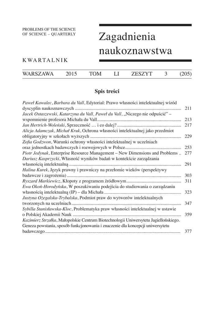 PROBLEMS OF THE SCIENCE OF SCIENCE – QUARTERLY Zagadnienia naukoznawstwa K WA R T A L N I K WARSZAWA 2015 TOM LI ZESZYT 3 (205) Spis treści Paweł Kawalec, Barbara du Vall, Edytorial: Prawo własności intelektualnej wśród dyscyplin naukoznawczych ........................................................................................... Jacek Ostaszewski, Katarzyna du Vall, Paweł du Vall, „Niczego nie odpuścić” – wspomnienie profesora Michała du Vall........................................................................ Jan Hertrich-Woleński, Sprzeczność … i co dalej? ....................................................... Alicja Adamczak, Michał Kruk, Ochrona własności intelektualnej jako przedmiot obligatoryjny w szkołach wyższych .............................................................................. Zofia Godzwon, Warunki ochrony własności intelektualnej w uczelniach oraz jednostkach badawczych i rozwojowych w Polsce................................................ Piotr Jedynak, Enterprise Resource Management – New Dimensions and Problems .. Dariusz Kasprzycki, Własność wyników badań w kontekście zarządzania własnością intelektualną ................................................................................................ Halina Kurek, Język prawny i prawniczy na przełomie wieków (perspektywy badawcze i zagrożenia) .................................................................................................. Ryszard Markiewicz, Kłopoty z programem źródłowym ............................................... Ewa Okoń-Horodyńska, W poszukiwaniu podejścia do studiowania o zarządzaniu własnością intelektualną (IP) – dla Michała .................................................................. Justyna Ożegalska-Trybalska, Podmiot praw do wytworów intelektualnych tworzonych na uczelniach .............................................................................................. Sybilla Stanisławska-Kloc, Problematyka praw własności intelektualnej w ustawie o Polskiej Akademii Nauk ............................................................................................. Kazimierz Strzałka, Małopolskie Centrum Biotechnologii Uniwersytetu Jagiellońskiego. Geneza powstania, sposób funkcjonowania i znaczenie dla koncepcji uniwersytetu badawczego .............................................................................................................................. 211 213 217 229 253 277 291 303 311 323 347 359 377 Contents Paweł Kawalec, Barbara du Vall, Editorial: Intellectual Property Law Among the Science of Science disciplines ................................................................................. Jacek Ostaszewski, Katarzyna du Vall, Paweł du Vall, “Nothing to Let Go Of” – The Memory of Professor Michal du Vall .................................................................. Jan Hertrich-Woleński, Contradiction … and what then? ............................................. Alicja Adamczak, Michał Kruk, “Protection of the intellectual property” as an obligatory course at universities ........................................................................... Zofia Godzwon, Conditions of Intellectual Property Protection at Universities and Research and Development Units in Poland ........................................................... Piotr Jedynak, Enterprise Resource Management – New Dimensions and Problems .. Dariusz Kasprzycki, Ownership of research results in context of the management of intellectual property ................................................................................................... Halina Kurek, Legal language and language of the law at the turn of centuries (research perspectives and threats) ................................................................................ Ryszard Markiewicz, Problems with the source code .................................................... Ewa Okoń-Horodyńska, In search of attitude to studying management of intellectual property (IP) – for Michał .............................................................................................. Justyna Ożegalska-Trybalska, An entity entitled to rights to intellectual creations generated at universities ................................................................................................. Sybilla Stanisławska-Kloc, Intellectual property law issues in the Act on the Polish Academy of Science ...................................................................................................... Kazimierz Strzałka, Malopolska Centre of Biotechnology of the Jagiellonian University. Origin, mode of functioning and relevance for the concept of research University....................................................................................................................... 211 213 217 229 253 277 291 303 311 323 347 359 377