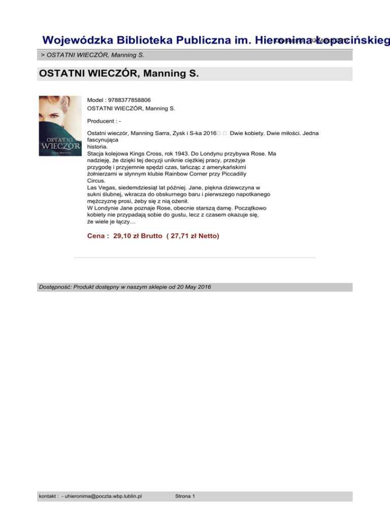 Utworzono : 02Łopacińskieg March 2017 Wojewódzka Biblioteka Publiczna im. Hieronima > OSTATNI WIECZÓR, Manning S. OSTATNI WIECZÓR, Manning S. Model : 9788377858806 OSTATNI WIECZÓR, Manning S. Producent : Ostatni wieczór, Manning Sarra, Zysk i S-ka 2016�� Dwie kobiety. Dwie miłości. Jedna fascynująca historia. Stacja kolejowa Kings Cross, rok 1943. Do Londynu przybywa Rose. Ma nadzieję, że dzięki tej decyzji uniknie ciężkiej pracy, przeżyje przygodę i przyjemnie spędzi czas, tańcząc z amerykańskimi żołnierzami w słynnym klubie Rainbow Corner przy Piccadilly Circus. Las Vegas, siedemdziesiąt lat później. Jane, piękna dziewczyna w sukni ślubnej, wkracza do obskurnego baru i pierwszego napotkanego mężczyznę prosi, żeby się z nią ożenił. W Londynie Jane poznaje Rose, obecnie starszą damę. Początkowo kobiety nie przypadają sobie do gustu, lecz z czasem okazuje się, że wiele je łączy… Cena : 29,10 zł Brutto ( 27,71 zł Netto) Dostępność: Produkt dostępny w naszym sklepie od 20 May 2016 kontakt : - [email protected] Strona 1