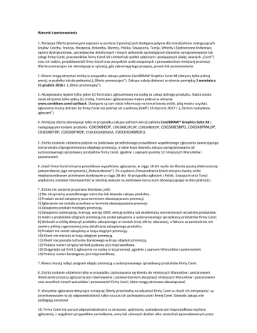 Warunki i postanowienia 1. Niniejsza Oferta promocyjna (opisana w punkcie 2 poniżej) jest dostępna jedynie dla mieszkańców następujących krajów: Czechy, Francja, Hiszpania, Holandia, Niemcy, Polska, Szwajcaria, Turcja, Włochy i Zjednoczone Królestwo, oprócz dystrybutorów, sprzedawców detalicznych i innych jednostek sprzedających dowolne oprogramowanie lub usługi firmy Corel, pracowników firmy Corel UK Limited lub spółek zależnych i powiązanych (dalej zwanych „Corel”) oraz ich rodzin, przedstawicieli firmy Corel oraz wszystkich osób związanych z prowadzeniem niniejszej promocji. Oferta promocyjna nie obowiązuje w sytuacji, gdy zabraniają tego przepisy, prawo lub postanowienia. 2. Klienci mogą otrzymać zniżkę w przypadku zakupu pakietu CorelDRAW Graphics Suite X8 (dotyczy tylko pełnej wersji, w pudełku lub do pobrania) („Oferta promocyjna”). Zakupu należy dokonać w okresie pomiędzy 1 września a 31 grudnia 2016 r. („Okres promocyjny”). 3. Akceptowany będzie tylko jeden (1) formularz zgłoszeniowy na osobę za zakup jednego produktu. Każda osoba może otrzymać tylko jedną (1) zniżkę. Formularz zgłoszeniowy można pobrać w witrynie www.coreldraw.com/cashback. Dostępne są tam także informacje na temat kwoty zniżki, jaką można uzyskać. Zgłoszenia muszą dotrzeć do firmy Corel nie później niż o północy (GMT) 14 stycznia 2017 r. („Termin nadsyłania zgłoszeń”). 4. Niniejsza oferta obowiązuje tylko w przypadku zakupu pełnych wersji pakietu CorelDRAW® Graphics Suite X8 z następującymi kodami produktu: CDGSX8IEDP, CDGSX8CZPLDP, CDGSX8DEDP, CDGSX8ESBPD, CDGSX8FRNLDP, CDGSX8ITDP, CDGSX8TRDP, ESDCDGSX8EMEA, ESDCDGSX8ROEU. 5. Zniżka zostanie udzielona jedynie na podstawie przedłożonego prawidłowo wypełnionego zgłoszenia zawierającego kod produktu Oprogramowania objętego promocją, a także kopii dowodu zakupu oprogramowania od autoryzowanego sprzedawcy produktów firmy Corel, zgodnie z zapisami punktu 12 niniejszych Warunków i postanowień. 6. Jeżeli firma Corel otrzyma prawidłowo wypełnione zgłoszenie, w ciągu 10 dni wyśle do klienta pocztą elektroniczną potwierdzenie jego otrzymania („Potwierdzenie”). Po uzyskaniu Potwierdzenia klient otrzyma kwotę zniżki międzynarodowym przelewem bankowym w ciągu 28 dni. W przypadku zgłoszeń z Polski, Szwajcarii oraz Turcji wypłacona zostanie równowartość w lokalnej walucie na podstawie kursu euro obowiązującego w dniu płatności. 7. Zniżka nie zostanie przyznana klientowi, jeśli: 1) Nie otrzymamy prawidłowego rachunku lub dowodu zakupu produktu. 2) Produkt został zakupiony poza terminem obowiązywania promocji. 3) Zgłoszenie nie zostało przesłane w terminie obowiązywania promocji. 4) Zakupiono produkt nieobjęty promocją. 5) Zakupiono subskrypcję, licencję, wersję OEM, wersję próbną lub akademicką wymienionych wcześniej produktów. 6) Jeden z produktów objętych promocją nie został zakupiony u autoryzowanego sprzedawcy produktów firmy Corel. 8) Wniosek o zniżkę dotyczył produktu zakupionego w ramach innej oferty rabatowej, a faktura za zamówienie nie zawiera pełnej sugerowanej ceny detalicznej zakupionego produktu. 9) Produkt nie został zakupiony w kraju objętym promocją. 10) Klient nie mieszka w kraju objętym promocją. 11) Klient nie posiada rachunku bankowego w kraju objętym promocją. 12) Podany numer seryjny lub kod paskowy jest nieprawidłowy. 13) Osiągnięto już limit 1 zgłoszenia na osobę w tej promocji, zgodnie z zapisami Warunków i postanowień. 14) Podany numer katalogowy jest nieprawidłowy. 7. Klienci muszą nabyć program objęty promocją u autoryzowanego sprzedawcy produktów firmy Corel. 8. Zniżka zostanie udzielona tylko w przypadku zastosowania się klienta do niniejszych Warunków i postanowień. Ukończenie procesu zgłoszenia jest równoważne z potwierdzeniem akceptacji niniejszych Warunków i postanowień oraz wszelkich innych warunków i postanowień firmy Corel, które mogą okresowo obowiązywać. 9. Wszystkie zgłoszenia dotyczące niniejszej Oferty przechodzą na własność firmy Corel w chwili ich otrzymania i są przechowywane na jej odpowiedzialność tylko na czas ich zachowania przez firmę Corel. Dowody zakupu nie podlegają zwrotowi. 10. Firma Corel nie ponosi odpowiedzialności za utracone, spóźnione, uszkodzone ani nieprawidłowo wysłane zgłoszenia, z wyjątkiem przypadków zaniedbania, winy lub celowych działań albo zaniechań spowodowanych przez firmę Corel lub jej agentów. Firma Corel nie ponosi odpowiedzialności za jakiekolwiek awarie techniczne, sprzętowe, programowe, dotyczące serwerów czy witryn internetowych ani za żadne inne uszkodzenia. 11. Firma Corel zastrzega sobie prawo do zmiany, uzupełnienia lub zakończenia Oferty promocyjnej bez uprzedzenia. 12. Formularze zgłoszeniowe dotyczące tej oferty należy przesyłać na adres [email protected]. © 2016 Corel Corporation. Wszelkie prawa zastrzeżone. Corel, CorelDRAW i logo Corel są znakami towarowymi lub zastrzeżonymi znakami towarowymi firmy Corel Corporation i/lub jej firm zależnych zarejestrowanymi w Kanadzie, USA i/lub innych krajach.