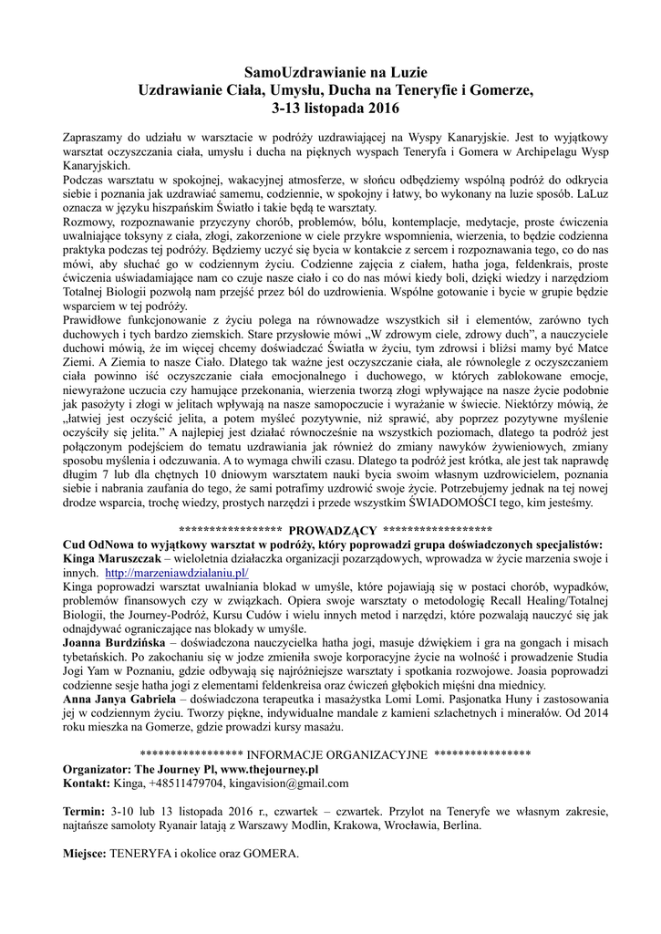 SamoUzdrawianie na Luzie Uzdrawianie Ciała, Umysłu, Ducha na Teneryfie i Gomerze, 3-13 listopada 2016 Zapraszamy do udziału w warsztacie w podróży uzdrawiającej na Wyspy Kanaryjskie. Jest to wyjątkowy warsztat oczyszczania ciała, umysłu i ducha na pięknych wyspach Teneryfa i Gomera w Archipelagu Wysp Kanaryjskich. Podczas warsztatu w spokojnej, wakacyjnej atmosferze, w słońcu odbędziemy wspólną podróż do odkrycia siebie i poznania jak uzdrawiać samemu, codziennie, w spokojny i łatwy, bo wykonany na luzie sposób. LaLuz oznacza w języku hiszpańskim Światło i takie będą te warsztaty. Rozmowy, rozpoznawanie przyczyny chorób, problemów, bólu, kontemplacje, medytacje, proste ćwiczenia uwalniające toksyny z ciała, złogi, zakorzenione w ciele przykre wspomnienia, wierzenia, to będzie codzienna praktyka podczas tej podróży. Będziemy uczyć się bycia w kontakcie z sercem i rozpoznawania tego, co do nas mówi, aby słuchać go w codziennym życiu. Codzienne zajęcia z ciałem, hatha joga, feldenkrais, proste ćwiczenia uświadamiające nam co czuje nasze ciało i co do nas mówi kiedy boli, dzięki wiedzy i narzędziom Totalnej Biologii pozwolą nam przejść przez ból do uzdrowienia. Wspólne gotowanie i bycie w grupie będzie wsparciem w tej podróży. Prawidłowe funkcjonowanie z życiu polega na równowadze wszystkich sił i elementów, zarówno tych duchowych i tych bardzo ziemskich. Stare przysłowie mówi „W zdrowym ciele, zdrowy duch”, a nauczyciele duchowi mówią, że im więcej chcemy doświadczać Światła w życiu, tym zdrowsi i bliżsi mamy być Matce Ziemi. A Ziemia to nasze Ciało. Dlatego tak ważne jest oczyszczanie ciała, ale równolegle z oczyszczaniem ciała powinno iść oczyszczanie ciała emocjonalnego i duchowego, w których zablokowane emocje, niewyrażone uczucia czy hamujące przekonania, wierzenia tworzą złogi wpływające na nasze życie podobnie jak pasożyty i złogi w jelitach wpływają na nasze samopoczucie i wyrażanie w świecie. Niektórzy mówią, że „łatwiej jest oczyścić jelita, a potem myśleć pozytywnie, niż sprawić, aby poprzez pozytywne myślenie oczyściły się jelita.” A najlepiej jest działać równocześnie na wszystkich poziomach, dlatego ta podróż jest połączonym podejściem do tematu uzdrawiania jak również do zmiany nawyków żywieniowych, zmiany sposobu myślenia i odczuwania. A to wymaga chwili czasu. Dlatego ta podróż jest krótka, ale jest tak naprawdę długim 7 lub dla chętnych 10 dniowym warsztatem nauki bycia swoim własnym uzdrowicielem, poznania siebie i nabrania zaufania do tego, że sami potrafimy uzdrowić swoje życie. Potrzebujemy jednak na tej nowej drodze wsparcia, trochę wiedzy, prostych narzędzi i przede wszystkim ŚWIADOMOŚCI tego, kim jesteśmy. ***************** PROWADZĄCY ****************** Cud OdNowa to wyjątkowy warsztat w podróży, który poprowadzi grupa doświadczonych specjalistów: Kinga Maruszczak – wieloletnia działaczka organizacji pozarządowych, wprowadza w życie marzenia swoje i innych. http://marzeniawdzialaniu.pl/ Kinga poprowadzi warsztat uwalniania blokad w umyśle, które pojawiają się w postaci chorób, wypadków, problemów finansowych czy w związkach. Opiera swoje warsztaty o metodologię Recall Healing/Totalnej Biologii, the Journey-Podróż, Kursu Cudów i wielu innych metod i narzędzi, które pozwalają nauczyć się jak odnajdywać ograniczające nas blokady w umyśle. Joanna Burdzińska – doświadczona nauczycielka hatha jogi, masuje dźwiękiem i gra na gongach i misach tybetańskich. Po zakochaniu się w jodze zmieniła swoje korporacyjne życie na wolność i prowadzenie Studia Jogi Yam w Poznaniu, gdzie odbywają się najróżniejsze warsztaty i spotkania rozwojowe. Joasia poprowadzi codzienne sesje hatha jogi z elementami feldenkreisa oraz ćwiczeń głębokich mięśni dna miednicy. Anna Janya Gabriela – doświadczona terapeutka i masażystka Lomi Lomi. Pasjonatka Huny i zastosowania jej w codziennym życiu. Tworzy piękne, indywidualne mandale z kamieni szlachetnych i minerałów. Od 2014 roku mieszka na Gomerze, gdzie prowadzi kursy masażu. ***************** INFORMACJE ORGANIZACYJNE **************** Organizator: The Journey Pl, www.thejourney.pl Kontakt: Kinga, +48511479704, [email protected] Termin: 3-10 lub 13 listopada 2016 r., czwartek – czwartek. Przylot na Teneryfe we własnym zakresie, najtańsze samoloty Ryanair latają z Warszawy Modlin, Krakowa, Wrocławia, Berlina. Miejsce: TENERYFA i okolice oraz GOMERA. Stacjonować będziemy na Teneryfie w Playa Paraiso, w apartamencie z widokiem na ocean. Obok jest piękny ośrodek Christofforo oraz Ośrodek Buddyjski Dodgdzen. Spędzimy też 2 dni na Gomerze. Miejsca sprzyjają odosobnieniu i uzdrawianiu, dzięki skromnym, ale wygodnym warunkom. Prosimy o zabranie wygodnych rzeczy, na spacery po okolicznych górach oraz ćwiczeń hatha yogi, ale również na kolacje w lokalnych restauracjach. Koszt: Koszt udziału w warsztacie to 2350 złotych za 7 dni, 2500 zł za 10 dni. Koszt lotu na Teneryfę każdy opłaca samodzielnie. Grupa jest niewielka i warunki rodzinne. Serdecznie zapraszamy Kinga i Asia