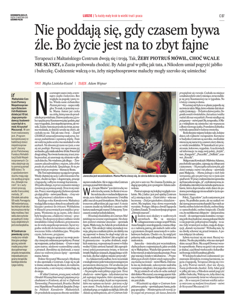 LUDZIE | Tu każdy mały krok to wielki trud i praca DZIENNIKPOLSKI24.PL PIĄTEK 23 WRZEŚNIA 2016 C 07 DZIENNIK POLSKI Nie poddają się, gdy czasem bywa źle. Bo życie jest na to zbyt fajne Terapeuci z Maltańskiego Centrum dwoją się i troją. Tak, ŻEBY PIOTRUŚ MÓWIŁ, CHOĆ WCALE NIE SŁYSZY, a Zuzia próbowała chodzić. By Adaś grał w piłkę jak tata, a Nikodem umiał pogryźć jabłko i bułeczkę. Codziennie walczą o to, żeby niepełnosprawne maluchy mogły szeroko się uśmiechać TEKST Majka Lisińska-Kozioł | ZDJĘCIE Adam Wojnar Maltańskie Centrum Pomocy Niepełnosprawnym Dzieciom i Ich Rodzinom działa już 10 lat. Jego pomysłodawcą i budowniczym był dr n. med. Krzysztof Moczurad. W centrum realizowany jest „Program kompleksowej rehabilitacji dzieci niepełnosprawnych” zlecony przez Państwowy Fundusz Rehabilitacji Osób Niepełnosprawnych. Co roku obejmuje się tu pomocą ponad 600 dzieci. Te z upośledzeniem słuchu mają zajęcia według programu „Dźwięki marzeń”, te z autyzmem pracują wedle francuskiej metody „3i”. Ośrodek zatrudnia 101 osób. Pomaga tu 180 wolontariuszy, bez których tak skuteczna praca nie byłaby możliwa. I bez wielu darczyńców prywatnych i instytucji, dzięki którym jest ona bezpłatna. W Centrum zapewnia się: opiekę medyczno-rehabilitacyjno-pedagogiczną, autorski model pracy interdyscyplinarnego zespołu terapeutów, indywidualne programy terapii dla każdego dziecka i jego rodziny. N a zewnątrz szaro i mży, a wewnątrz ciepło i kolorowo. Bez względu na pogodę i porę roku. Winda sunie cichuteńko Poziom pierwszy – szepce miły głos. To znak, że jesteśmy u celu. Mama Antosi już czeka na córkę, którą rano do przedszkola przywiózł tata. Dziewczynka ma , roku i spędza przy Kasztanowej pięć godzin, pięć razy w tygodniu. Jest niepełnosprawna, ale wesoła. Zanim Antosia przyszła na świat, jej mama wiedziała, że dziecko urodzi się chore, ale czekała na nie. Tak jak tata i brat. – Zespół CHARGE oznaczał poważną wadę serca, rozszczep podniebienia i szpotawą stópkę. Tosia nie widzi na jedno oczko i ma niedosłuch w obu uszkach. Nie dawano jej szans na życie, a ona się nie poddaje. Pierwszy raz operowano jej serduszko, gdy miała zaledwie 8 dni. Potem był drugi zabieg. Na równie konieczny, trzeci, trzeba poczekać, aż unormuje się ciśnienie w płucach dziecka. Nie wiadomo, jak długo. – Tymczasem zdecydowaliśmy z mężem, żeby córka poszła do przedszkola. Specjalnego, bo tu poznaje świat po swojemu – tłumaczy Beata. Dla Tosi najważniejsze są zajęcia w grupie. Wtedy chętniej się uczy. Lubi ćwiczenia w basenie, chodzi na hipo- i dogoterapię, pracuje z logopedą i odbywa treningi karmienia. – Wszystko dlatego, że przez szesnaście miesięcy żywiono ją za pomocą sondy. Teraz to się zmienia. Praca z neurologopedą i fachowa stymulacja dają efekty – mówi pani Beata. – A my wiemy, jak pracować z dzieckiem w domu. Każdego roku Kawalerowie Maltańscy wydają kilka tysięcy złotych na zabawki edukacyjne i pomoce do ćwiczeń. Wykładzina w klasach i pracowniach jest miękka i przyjazna. Wymienia się ją często, żeby dzieci były bezpieczne, a bakterie i wirusy – przeciwnie. Do dyspozycji dzieci oddano wózki inwalidzkie różnej wielkości, przystosowane do wielu niepełnosprawności. Są też wygodne stoliczki do karmienia i zabawy, nowoczesne łóżka rehabilitacyjne. Wszystko czyste, kolorowe, przyjazne. Rodzice mogą tu spojrzeć na swoje pociechy z innej niż codzienna perspektywy. Poznać się wzajemnie, zyskać dystans. – Gram w tutejszym teatrze, niedawno wystawiliśmy sztukę o piratach. Bawiliśmy się doskonale, a nasze dzieci na widowni jeszcze lepiej – opowiada mama Antosi. Doktor Krzysztof Moczurad z błyskiem w oku opowiada o Centrum. Czuje się tu jak w domu uśmiecha się do dzieci, do rodziców, do personelu, a oni wszyscy uśmiechają się do niego. – W skład Centrum, proszę pani, wchodzi Ośrodek Wczesnej Interwencji z pięcioma przychodniami w Krakowie, ale też w: Dąbrowie Tarnowskiej, Proszowicach, Brzesku i Bochni oraz Niepubliczne Przedszkole Specjalne Związku Polskich Kawalerów Maltańskich. Do przedszkola uczęszcza obecnie sześćdzie- Janeczka jest wcześniakiem. Mama Marta cieszy się, że córcia dobrze się rozwija sięcioro maluchów. Ale w ciągu roku Centrum pomaga ponad dzieciom. „Grupie Misiów” jest dziś trochę wesoło i trochę sennie, bo Benio trwa sobie na leżaczku w melancholijnym nastroju, za to Adaś tryska humorem. Uwielbia piłki i ma ich tu pod dostatkiem. Może będzie trenerem piłkarskim jak jego tato? A może z czasem znudzi się futbolem i zacznie robić karierę naukową jak mama? Zobaczymy. Tymczasem został przedszkolakiem. – Wcześniej chodziliśmy do Centrum Maltańskiego na wczesne wspomaganie. Nie chciałam synkowi zmieniać otoczenia – opowiada Agata. Miała rację, bo Adaś do przedszkola aż się rwie. Tylu atrakcji i takiej stymulacji rozwoju, jaką ma u maltańczyków, nie dałoby mu się zapewnić w domu bo skąd wziąć tyle zabawek, maskotek, klocków? Jak urządzić salki gimnastyczne – tu pełne drabinek, miękkich materacy, wyposażonych nawet w łóżko wodne? Gdzie zawiesić hamak? Jak zaprojektować pokój poznawania świata, w którym światło błądzi po ścianach, drgają lśniące srebrne kule, słychać odgłosy miasta i przyrody? A o Adasia trzeba zadbać, bo to wcześniak z wodogłowiem i pokrwotocznym mózgowym porażeniem dziecięcym. Od urodzenia jest pod opieką Hospicjum Domowego Alma Spei. – Na początku walczyliśmy o jego życie. Teraz chodzi o to – mówi Agata – żeby dostarczać mu jak najwięcej impulsów, które stymulują rozwój. I to się nam udaje, bo jak na rozpoznanie, które ma wpisane na karcie – jest teraz w fajnym stanie. Trochę bałam się dużych przedszkolnych grup, ze względu na infekcje, które dla Adasia są