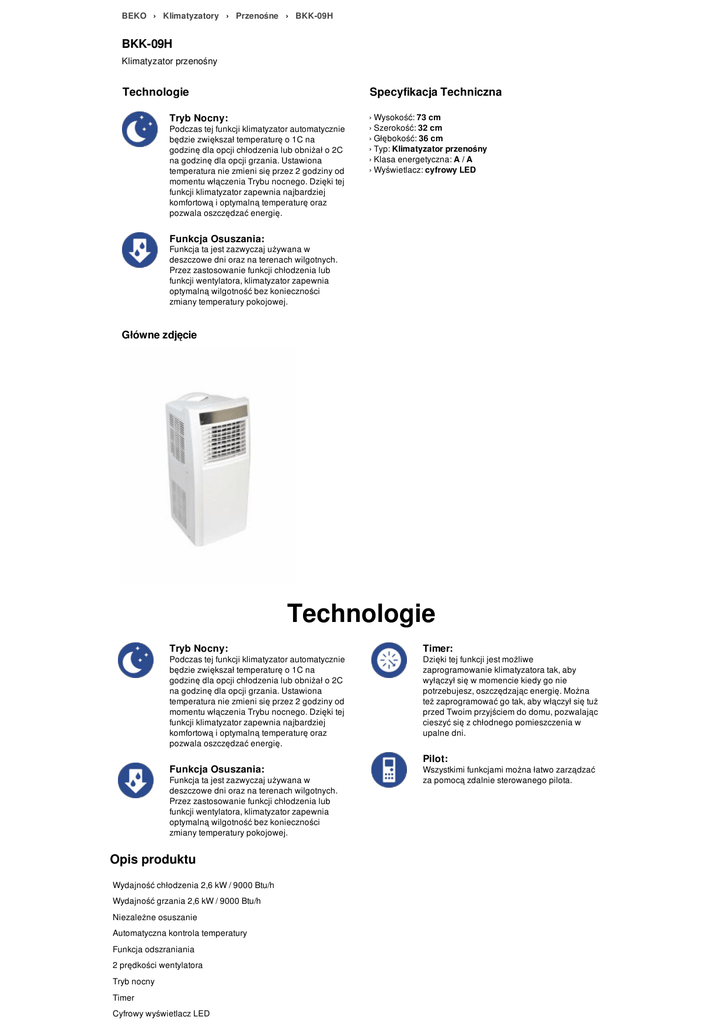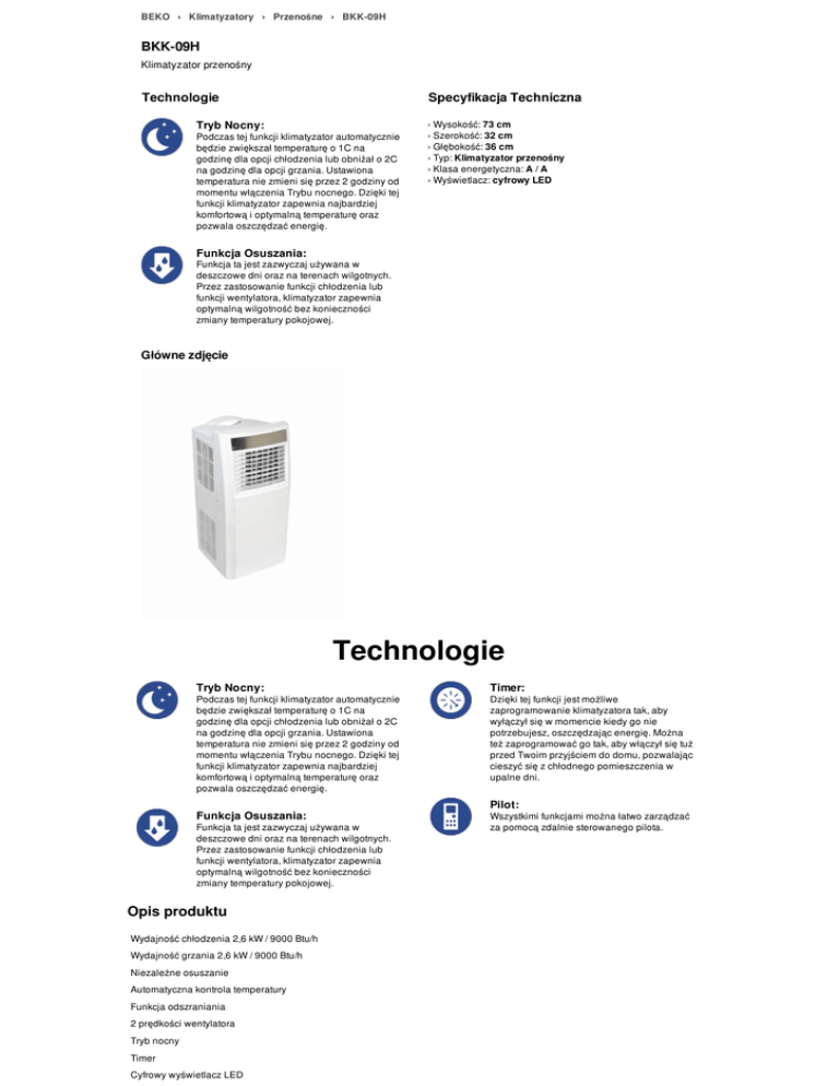 BEKO › Klimatyzatory › Przenośne › BKK-09H BKK-09H Klimatyzator przenośny Technologie Specyfikacja Techniczna Tryb Nocny: Podczas tej funkcji klimatyzator automatycznie będzie zwiększał temperaturę o 1C na godzinę dla opcji chłodzenia lub obniżał o 2C na godzinę dla opcji grzania. Ustawiona temperatura nie zmieni się przez 2 godziny od momentu włączenia Trybu nocnego. Dzięki tej funkcji klimatyzator zapewnia najbardziej komfortową i optymalną temperaturę oraz pozwala oszczędzać energię. › Wysokość: 73 cm › Szerokość: 32 cm › Głębokość: 36 cm › Typ: Klimatyzator przenośny › Klasa energetyczna: A / A › Wyświetlacz: cyfrowy LED Funkcja Osuszania: Funkcja ta jest zazwyczaj używana w deszczowe dni oraz na terenach wilgotnych. Przez zastosowanie funkcji chłodzenia lub funkcji wentylatora, klimatyzator zapewnia optymalną wilgotność bez konieczności zmiany temperatury pokojowej. Główne zdjęcie Technologie Tryb Nocny: Podczas tej funkcji klimatyzator automatycznie będzie zwiększał temperaturę o 1C na godzinę dla opcji chłodzenia lub obniżał o 2C na godzinę dla opcji grzania. Ustawiona temperatura nie zmieni się przez 2 godziny od momentu włączenia Trybu nocnego. Dzięki tej funkcji klimatyzator zapewnia najbardziej komfortową i optymalną temperaturę oraz pozwala oszczędzać energię. Funkcja Osuszania: Funkcja ta jest zazwyczaj używana w deszczowe dni oraz na terenach wilgotnych. Przez zastosowanie funkcji chłodzenia lub funkcji wentylatora, klimatyzator zapewnia optymalną wilgotność bez konieczności zmiany temperatury pokojowej. Opis produktu Wydajność chłodzenia 2,6 kW / 9000 Btu/h Wydajność grzania 2,6 kW / 9000 Btu/h Niezależne osuszanie Automatyczna kontrola temperatury Funkcja odszraniania 2 prędkości wentylatora Tryb nocny Timer Cyfrowy wyświetlacz LED Timer: Dzięki tej funkcji jest możliwe zaprogramowanie klimatyzatora tak, aby wyłączył się w momencie kiedy go nie potrzebujesz, oszczędzając energię. Można też zaprogramować go tak, aby włączył się tuż przed Twoim przyjściem do domu, pozwalając cieszyć się z chłodnego pomieszczenia w upalne dni. Pilot: Wszystkimi funkcjami można łatwo zarządzać za pomocą zdalnie sterowanego pilota. Bezprzewodowy pilot Czynnik chłodniczy - R410 a Klasa energetyczna chłodzenia A Klasa energetyczna grzania A Poziom głośności: 56 dB (j. wew.) Specyfikacja techniczna Model: BKK-09H Wydajność Chłodzenie: 2640 Btu/h Chłodzenie: 9000 W Grzanie: 2640 Btu/h Grzanie: W Specyfikacja Elektryczna Pobór mocy - Chłodzenie: 900 W Pobór mocy - Grzanie: 4,2 W Natężenie - Chłodzenie: 4A Natężenie - Grzanie: Pompa ciepła A Typ Grzania: 230 / 50 Napięcie/Częstotliwość: V/Hz Parametry Klasa Energetyczna - Chłodzenie: A Klasa energetyczna - Grzanie: 2,83 Efektywność energetyczna - Chłodzenie: 2,8 W/W Efektywność energetyczna - Grzanie: 56 W/W Poziom hałasu Nie J. wewn. (mała prędkość): - dB Poziom hałasu Nie J. zewn. (mała prędkość): Tak dB Funkcja osuszania: 0,9 Zdolność osuszania: - l/h Przyłącza rur - Ciecz: - mm Przyłącza rur - Gaz: mm Funkcje Czynnik chłodniczy: 1 Liczba jednostek wewnętrznych: Nie System oczyszczania powietrza Activion: Nie Aktywny filtr węglowy: Nie Filtr przeciwbakteryjny: Nie Automatyczne oczyszczanie: Nie Szybkie chłodzenie: Nie Szybkie grzanie: Nie Zaawansowana funkcja Auto Swing: Nie Automatyczny nawiew góra-dół: Nie Automatyczny nawiew w lewo-prawo: Nie Automatyczna zmiana trybu pracy: Nie Hotstart: Nie Antykorozyjna obudowa: Nie Automatyczny restart: Nie Funkcja oszczędzania energii: Nie Tryb minimalnego zużycia energii: Tak Tryb nocny: Tak Timer: Tak Cyfrowy wyświetlacz: Tak Bezprzewodowy pilot: Tak Automatyczna kontrola temperatury: rotacyjny Typ kompresora: Tak Funkcja odszraniania: 2 Prędkości wentylatora: Wymiary Jednostka wewnętrzna (SZxWxG): - mm Jednostka zewnętrzna (SZxWxG): mm Waga Jednostka wewnętrzna: - kg Jednostka zewnętrzna: kg Informacje produktowe zawarte na stronie internetowej mają charakter poglądowy i mogą odbiegać od rzeczywistości | Informacje o plikach cookies projekt i realizacja 4 All Multimedia