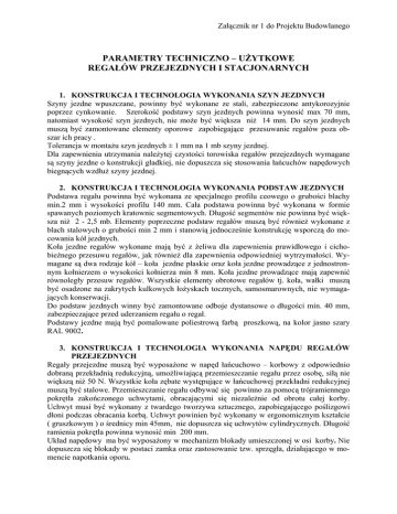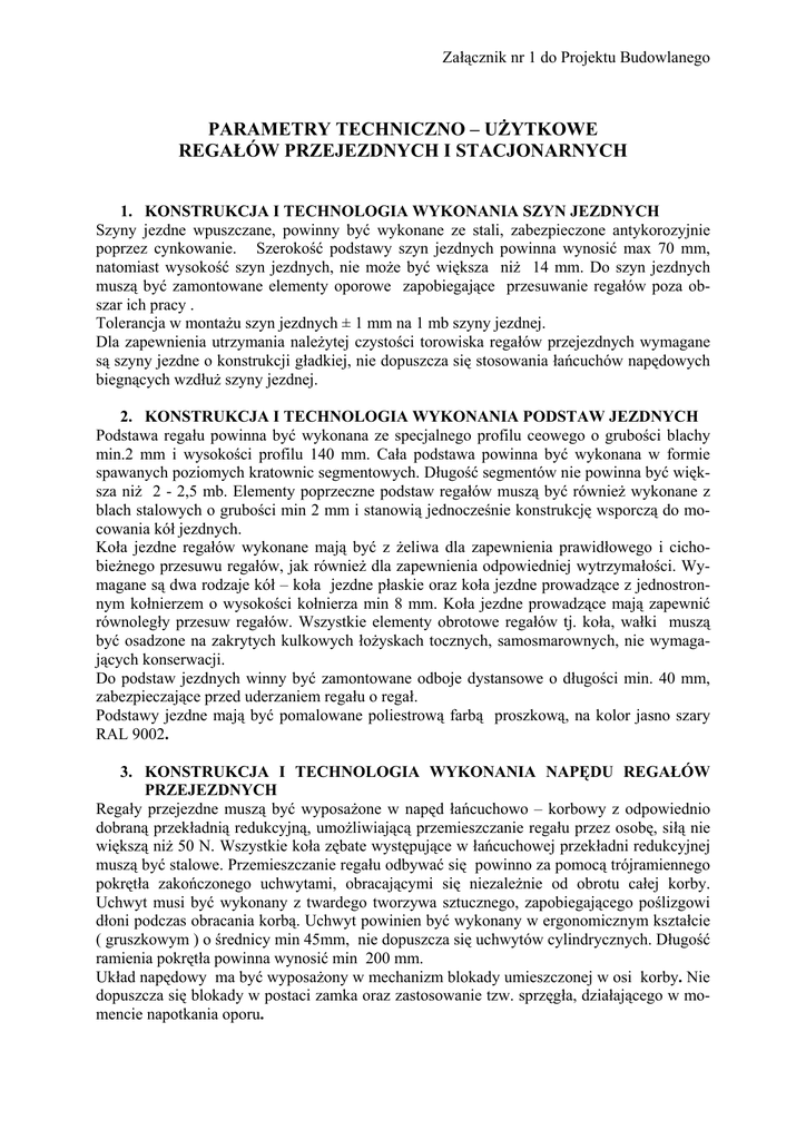Załącznik nr 1 do Projektu Budowlanego PARAMETRY TECHNICZNO – UśYTKOWE REGAŁÓW PRZEJEZDNYCH I STACJONARNYCH 1. KONSTRUKCJA I TECHNOLOGIA WYKONANIA SZYN JEZDNYCH Szyny jezdne wpuszczane, powinny być wykonane ze stali, zabezpieczone antykorozyjnie poprzez cynkowanie. Szerokość podstawy szyn jezdnych powinna wynosić max 70 mm, natomiast wysokość szyn jezdnych, nie moŜe być większa niŜ 14 mm. Do szyn jezdnych muszą być zamontowane elementy oporowe zapobiegające przesuwanie regałów poza obszar ich pracy . Tolerancja w montaŜu szyn jezdnych ± 1 mm na 1 mb szyny jezdnej. Dla zapewnienia utrzymania naleŜytej czystości torowiska regałów przejezdnych wymagane są szyny jezdne o konstrukcji gładkiej, nie dopuszcza się stosowania łańcuchów napędowych biegnących wzdłuŜ szyny jezdnej. 2. KONSTRUKCJA I TECHNOLOGIA WYKONANIA PODSTAW JEZDNYCH Podstawa regału powinna być wykonana ze specjalnego profilu ceowego o grubości blachy min.2 mm i wysokości profilu 140 mm. Cała podstawa powinna być wykonana w formie spawanych poziomych kratownic segmentowych. Długość segmentów nie powinna być większa niŜ 2 - 2,5 mb. Elementy poprzeczne podstaw regałów muszą być równieŜ wykonane z blach stalowych o grubości min 2 mm i stanowią jednocześnie konstrukcję wsporczą do mocowania kół jezdnych. Koła jezdne regałów wykonane mają być z Ŝeliwa dla zapewnienia prawidłowego i cichobieŜnego przesuwu regałów, jak równieŜ dla zapewnienia odpowiedniej wytrzymałości. Wymagane są dwa rodzaje kół – koła jezdne płaskie oraz koła jezdne prowadzące z jednostronnym kołnierzem o wysokości kołnierza min 8 mm. Koła jezdne prowadzące mają zapewnić równoległy przesuw regałów. Wszystkie elementy obrotowe regałów tj. koła, wałki muszą być osadzone na zakrytych kulkowych łoŜyskach tocznych, samosmarownych, nie wymagających konserwacji. Do podstaw jezdnych winny być zamontowane odboje dystansowe o długości min. 40 mm, zabezpieczające przed uderzaniem regału o regał. Podstawy jezdne mają być pomalowane poliestrową farbą proszkową, na kolor jasno szary RAL 9002. 3. KONSTRUKCJA I TECHNOLOGIA WYKONANIA NAPĘDU REGAŁÓW PRZEJEZDNYCH Regały przejezdne muszą być wyposaŜone w napęd łańcuchowo – korbowy z odpowiednio dobraną przekładnią redukcyjną, umoŜliwiającą przemieszczanie regału przez osobę, siłą nie większą niŜ 50 N. Wszystkie koła zębate występujące w łańcuchowej przekładni redukcyjnej muszą być stalowe. Przemieszczanie regału odbywać się powinno za pomocą trójramiennego pokrętła zakończonego uchwytami, obracającymi się niezaleŜnie od obrotu całej korby. Uchwyt musi być wykonany z twardego tworzywa sztucznego, zapobiegającego poślizgowi dłoni podczas obracania korbą. Uchwyt powinien być wykonany w ergonomicznym kształcie ( gruszkowym ) o średnicy min 45mm, nie dopuszcza się uchwytów cylindrycznych. Długość ramienia pokrętła powinna wynosić min 200 mm. Układ napędowy ma być wyposaŜony w mechanizm blokady umieszczonej w osi korby. Nie dopuszcza się blokady w postaci zamka oraz zastosowanie tzw. sprzęgła, działającego w momencie napotkania oporu. Załącznik nr 1 do Projektu Budowlanego Dla zapewnienia równoległego przesuwu regałów, przesuwających się na min 3 szynach, napęd na koła musi być przenoszony z wózka jezdnego umieszczonego najbliŜej środka regałów na pozostałe koła napędowe przednie i tylne (napęd centralny). Nie dopuszcza się zastosowania rozwiązań, w których napęd przekazywany jest na koło zębate zazębiające się z łańcuchem umieszczonym w torze. Mechanizm napędowy zakryty poprzez pełny panel frontowy wykonany z jednolitej blachy zimnowalcowanej i malowanej proszkowo. 4. KONSTRUKCJA I TECHNOLOGIA WYKONANIA ŚCIAN BOCZNYCH Ściana boczna regału ma być wykonana z jednego formatu blachy stalowej zimnowalcowanej, w kształcie dwóch prostokątnych półzamkniętych profili zimno giętych o wymiarach min. 25x40 mm, połączonych ze sobą pełną ścianą. Dwa boki profili stanowią wspólny element profili i wypełnienia ściany. Szerokość ścian bocznych 350 mm, tj. taka jak szerokość półek W profilach wykonane wycięcia na zaczepy półek. Zaczepy wykonane z ocynkowanej blachy o grubości min. 3 mm. Ze względu na rodzaj przechowywanych materiałów winien zostać zachowany warunek dowolnej zmiany rozstawu półek co 30 mm, bez konieczności uŜycia narzędzi. Ściany boczne muszą być w sposób trwały połączone z podstawą jezdną regału tj. za pomocą połączeń śrubowych, nie dopuszcza się łączenia zatrzaskowego. Dodatkowo dla zapewnienia sztywności całej konstrukcji ściany boczne regału winny być połączone poprzez stęŜenia krzyŜowe oraz półkę górną regału, która to musi być przykręcana na stałe. Ściany boczne pomalowane poliestrową farbą proszkową, na kolor jasno szary RAL 9002. Malowanie ścian po wykonaniu wszystkich otworów. 5. KONSTRUKCJA I TECHNOLOGIA WYKONANIA PÓŁEK Półki wykonane ze stali zimnowalcowanej i pomalowane poliestrową farbą proszkową, na kolor jasno szary RAL 9002, trzykrotnie gięte na swej dłuŜszej krawędzi oraz dwukrotnie na krótszej, w celu zapewnienia odpowiedniej wytrzymałości i nie występowania ostrych krawędzi. Na krótszym boku półki wykonane specjalne wycięcia – otwory do mocowania zaczepów. Dla zapewnienia wytrzymałości 100 kg/mb półki powinny posiadać specjalne wzmocnienie w kształcie ceownika „kapeluszowego”. Wzmocnienie to powinno być w sposób trwały połączone z półką poprzez zastosowanie zgrzewu punktowego co 15 cm. Wysokość wzmocnienia powinna być dostosowana do grubości półki. Elementem zabezpieczającym przed przesunięciem się układanych dokumentów na sąsiednią półkę powinna być ruchoma, łatwo demontowana metalowa listwa o wysokość 30 mm mocowana do półki za pomocą specjalnych zaczepów