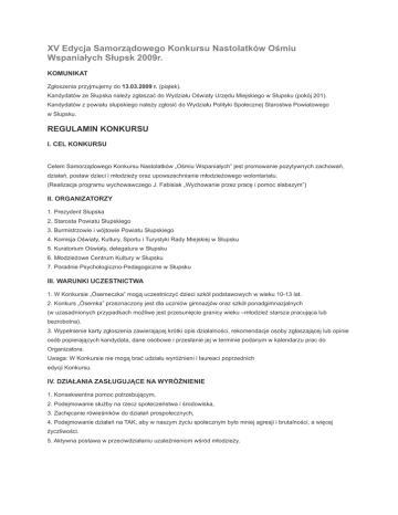 XV Edycja Samorządowego Konkursu Nastolatków Ośmiu Wspaniałych Słupsk 2009r. KOMUNIKAT Zgłoszenia przyjmujemy do 13.03.2009 r. (piątek). Kandydatów ze Słupska należy zgłaszać do Wydziału Oświaty Urzędu Miejskiego w Słupsku (pokój 201). Kandydatów z powiatu słupskiego należy zgłosić do Wydziału Polityki Społecznej Starostwa Powiatowego w Słupsku. REGULAMIN KONKURSU I. CEL KONKURSU Celem Samorządowego Konkursu Nastolatków „Ośmiu Wspaniałych” jest promowanie pozytywnych zachowań, działań, postaw dzieci i młodzieży oraz upowszechnianie młodzieżowego wolontariatu. (Realizacja programu wychowawczego J. Fabisiak „Wychowanie przez pracę i pomoc słabszym”) II. ORGANIZATORZY 1. Prezydent Słupska 2. Starosta Powiatu Słupskiego 3. Burmistrzowie i wójtowie Powiatu Słupskiego 4. Komisja Oświaty, Kultury, Sportu i Turystyki Rady Miejskiej w Słupsku 5. Kuratorium Oświaty, delegatura w Słupsku 6. Młodzieżowe Centrum Kultury w Słupsku 7. Poradnie Psychologiczno-Pedagogiczne w Słupsku III. WARUNKI UCZESTNICTWA 1. W Konkursie „Ósemeczka” mogą uczestniczyć dzieci szkół podstawowych w wieku 10-13 lat. 2. Konkurs „Ósemka” przeznaczony jest dla uczniów gimnazjów oraz szkół ponadgimnazjalnych (w uzasadnionych przypadkach możliwe jest przesunięcie granicy wieku –młodzież starsza pracująca lub bezrobotna). 3. Wypełnienie karty zgłoszenia zawierającej krótki opis działalności, rekomendacje osoby zgłaszającej lub opinie osób popierających kandydata, dane osobowe i przesłanie jej w terminie podanym w kalendarzu prac do Organizatora. Uwaga: W Konkursie nie mogą brać udziału wyróżnieni i laureaci poprzednich edycji Konkursu. IV. DZIAŁANIA ZASŁUGUJĄCE NA WYRÓŻNIENIE 1. Konsekwentna pomoc potrzebującym, 2. Podejmowanie służby na rzecz społeczeństwa i środowiska, 3. Zachęcanie rówieśników do działań prospołecznych, 4. Podejmowanie działań na TAK, aby w naszym życiu społecznym było mniej agresji i brutalności, a więcej życzliwości. 5. Aktywna postawa w przeciwdziałaniu uzależnieniom wśród młodzieży. V. KRYTERIA OCENY KANDYDATÓW Kryterium pracy 1. Konsekwencja w realizacji podjętych prac, 2. Zaangażowanie i wysiłek w osiągnięciu celu, 3. Pozytywny efekt społeczny, 4. Wzorowotwórczy charakter działań, 5. Wytrwałość w pokonywaniu trudności, 6. Motywy działania, 7. Minimum 1 rok pracy wolontariackiej. Kryterium postawy Integralnym warunkiem pozytywnej kwalifikacji kandydata jest nienaganna postawa w życiu codziennym (m.in.: wysoka kultura osobista, brak nałogów). Przedstawione kryteria mają charakter pomocniczy i są jednym z elementów oceny kandydata. VI. PRZEBIEG KONKURSU Konkurs przeprowadzany jest w dwóch etapach. 1. I etap – na szczeblu lokalnym 2. II etap – na szczeblu ogólnopolskim - Ze względu na trudność oceny oraz niemożność zastosowania jednolitego systemu kryteriów Jury, zarówno podczas eliminacji lokalnych jak i ogólnopolskich zastrzega sobie prawo przeprowadzania indywidualnych rozmów z uczestnikami. - Do eliminacji ogólnopolskich zgłaszana jest 1 osoba spośród laureatów lokalnych. - Jury powoływane przez Fundację „Świat na Tak” wyłania „Ośmiu Wspaniałych Polski”. - Zarówno podczas eliminacji lokalnych jak i ogólnopolskich Jury może przyznać równorzędne wyróżnienia kilku uczestnikom bez wskazywania laureatów. * KALENDARZ PRAC OGÓLNOPOLSKIEGO KOMITETU ORGANIZACYJNEGO KONKURSU „OŚMIU WSPANIAŁYCH” XV EDYCJA OGÓLNOPOLSKA 2009 28.01.2009 – 13.03.2009 – ETAP GMINNO-POWIATOWY – promocja konkursu, popularyzacja założeń. 13.03.2009 r. (piątek) Zgłaszanie kandydatów. Materiały dotyczące kandydatów ze Słupska należy zgłaszać do Wydziału Oświaty Urzędu Miejskiego w Słupsku (pokój 201). Materiały dotyczące pozostałych kandydatów organizatorzy gminni wyślą do Wydziału Polityki Społecznej Powiatu Słupskiego. Zgłoszenie winno zawierać 2 zdjęcia, opinię każdego laureata – nie więcej niż 70 słów – charakterystykę ze wskazaniem jego niezwykłości na tle rówieśników, wymienienie pól aktywności, potwierdzenie aktywności przez środowisko, w którym kandydat działa.. 17.03.2009 godz. 9.00 - posiedzenie Komisji Konkursu godz. 11.00 - rozmowy z nominowanymi do tytułu „Wspaniałego” (młodzież z terenu) godz. 12.30 - rozmowy z nominowanymi do tytułu „Wspaniałego” (młodzież ze Słupska) (Rozmowy odbywają się w Młodzieżowym Centrum Kultury, al. 3 Maja 22, Słupsk) 30.03.2009 - zakończenie etapu powiatowego i podanie laureatów do ogólnej wiadomości .Wytypowanie reprezentanta do eliminacji ogólnopolskich. 17-18.04.2009 - eliminacje ogólnopolskie 5 – 7.06.2009 - Wielka Gala kończąca XV Ogólnopolską Edycję Konkursu w Poznaniu. Ogólnopolski Komitet Organizacyjny Konkursu „ Ośmiu Wspaniałych „ Fundacja „ Świat na Tak „ Al.J.Ch.Szucha 27, 00-580 Warszawa tel/fax: 0 22 629 35 75, 629 63 34