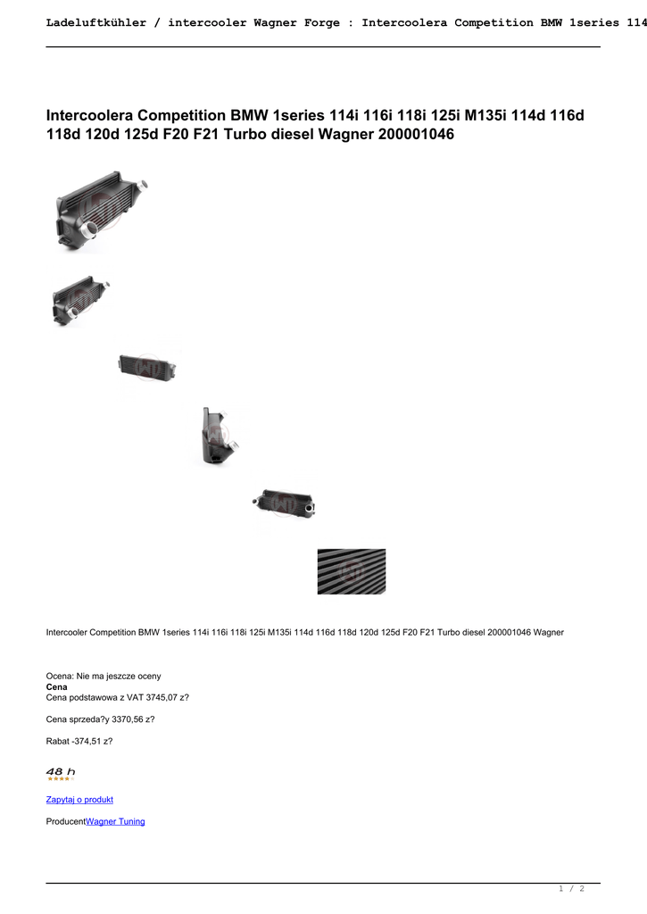 Ladeluftkühler / intercooler Wagner Forge : Intercoolera Competition BMW 1series 114 Intercoolera Competition BMW 1series 114i 116i 118i 125i M135i 114d 116d 118d 120d 125d F20 F21 Turbo diesel Wagner 200001046 Intercooler Competition BMW 1series 114i 116i 118i 125i M135i 114d 116d 118d 120d 125d F20 F21 Turbo diesel 200001046 Wagner Ocena: Nie ma jeszcze oceny Cena Cena podstawowa z VAT 3745,07 z? Cena sprzeda?y 3370,56 z? Rabat -374,51 z? Zapytaj o produkt ProducentWagner Tuning 1 / 2 Ladeluftkühler / intercooler Wagner Forge : Intercoolera Competition BMW 1series 114 Opis Stepped Competition Intercooler Core. Size 520 x 210 x130, 11.752cm³ Volume (OEM 510x130x110mm, 7293cm³ Volume). Approx. 85% bigger surface over OEM IC. CAD / FEM optimized Aluminum Cast Endtanks. Plug & Play Installation using the stock plumming, no cutting or bumper removal required. Weight 6,6kg Including TÜV certificate! The BMW EVO I Competition Intercooler-Kit from Wagner Tuning fits plug and play to: • BMW 114i F20 / F21 75KW/102PS (2012+) • BMW 116i F20 / F21 100KW/136PS (2011+) • BMW 118i F20 / F21 125KW/170PS (2011+) • BMW 125i F20 / F21 160KW/218PS (2012+) • BMW M135i(x) F20 / F21 235KW/320PS (2011+) • BMW 114d F20 / F21 70KW/95PS (2012+) • BMW 116d F20 / F21 85KW/116PS (2011+) • BMW 118d(x) F20 / F21 105KW/143PS (2011+) • BMW 120d(x) F20 / F21 135KW/184PS (2011+) • BMW 125d F20 / F21 160KW/218PS (2012+) • BMW 220i F22 / F23 135KW/184PS (2014+) • BMW 228i(x) F22 / F23 180KW/245PS (2014+) • BMW M235i(x) F22/F23 240KW/326PS (2014+) • BMW 218d F22 / F23 103KW/143PS (2014+) • BMW 220d(x) F22 / F23 135KW/184PS (2014+) • BMW 225d F22 / F23 160KW/218PS (2014+) • BMW 316i F30 / F31 / F34 100KW/136PS (2011+) • BMW 320i(x) F30 / F31 / F34 135KW/184PS (2011+) • BMW 328i(x) F30 / F31 / F34 180KW/245PS (2011+) • BMW 335i(x) F30 / F31 / F34 235KW/320PS (2011+) • BMW 316d F30 / F31 / F34 85KW/116PS (2012+) • BMW 318d(x) F30 / F31 / F34 105KW/143PS (2012+) • BMW 320d(x) F30 / F31 / F34 135KW/184PS (2011+) • BMW 325d F30 / F31 / F34 160KW/218PS (2013+) • BMW 330d(x) F30 / F31 / F34 190KW/258PS (2012+) • BMW 335d(x) F30 / F31 / F34 230KW/313PS (2013+) • BMW 420i(x) F32 / F33 / F36 135KW/184PS (2013+) • BMW 428i(x) F32 / F33 / F36 180KW/245PS (2013+) • BMW 435i(x) F32 / F33 / F36 225KW/306PS (2013+) • BMW 420d(x) F32 / F33 / F36 135KW/184PS (2013+) • BMW 425d F32 / F33 / F36 160KW/218PS (2014+) • BMW 430d(x) F32 / F33 / F36 190KW/258PS (2013+) • BMW 435d(x) F32 / F33 / F36 230KW/313PS (2013+) Packing List: 1 Intercooler 1 Mounting material 1 Installation instruction 1 TÜV certificate 2 / 2 Powered by TCPDF (www.tcpdf.org)