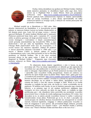 Osobą z którą chciałabym się spotkać jest Michael Jordan. Gdybym miała mnóstwo pieniędzy to chciałabym kupić sobie jego dom, który mieści się w Highland Park w stanie Illinois. Dom jest przepiękny (zobaczcie sami: http://www.youtube.com/watch?v=Twe7CIM347E). Pewnie gdybym była zainteresowana kupnem to chętnie oprowadziłby mnie po swojej rezydencji, a przy okazji opowiedziałby mi kilka ciekawych historii ze swojego życia, o których nie można przeczytać tak po prostu w Internecie. Michael urodził się w Brooklynie w 1963 roku. Jako dziecko interesował się baseballem, a w koszykówkę grywał jedynie ze starszym bratem Larrym na boisku zbudowanym za ich domem przez ojca. Larry był od niego wyższy i zawsze ogrywał Michaela. W szkole średniej Michael grał w juniorach. Ponieważ podziwiał brata który grał z numerem 45 i uważał siebie za połowę gorszego od niego przybrał numer 23. Dzięki swoim treningom i wytrwałości w latach osiemdziesiątych został gwiazdą amerykańskiej ligi koszykówki NBA, a jego skuteczność i styl gry stały się legendarne. Swoją drużynę Chicago Bulls poprowadził wiele razy do zwycięstwa, a na swoim koncie ma mnóstwo rekordów. Zdobył 69 punktów w meczu przeciwko drużynie Cleveland w 1990 roku, a po meczu z Boston Celtics w którym zdobył 63 punkty w fenomenalnym stylu, Larry Bird stwierdził że był to Pan Bóg przebrany za Michela Jordana: "He is the most exciting, awesome player in the game today. I think it's just God disguised as Michael Jordan.". Fragmenty jego wyczynów możemy zobaczyć na filmie: http://www.youtube.com/watch? v=Nln3jrIq8SI . Po obejrzeniu domu chętnie zagrałabym z nim w kosza, na jego prywatnej sali. Przy tej okazji zapytałabym co skłoniło go tak naprawdę do wycofania się z gry praktycznie w szczycie jego kariery w 1993 roku. Bardzo mnie to intryguje. Zaprosiłabym go do Polski ponieważ ma tutaj wielu fanów i sprawiłby nam wszystkim wielką przyjemność. Jestem też ciekawa czy sprawiła mu sporo frajdy praca na planie filmu "Space Jam", gdzie grał wraz z rysunkowymi postaciami: http://www.youtube.com/watch?v=G4E2eJkoRPo Pewnie nie było to łatwe zadanie i uważam że wykazał się sporym poczuciem humoru decydując się na udział w takim filmie. Spytałabym także, czy czasem nie marzy o tym aby znowu wystąpić w lidze. Wiem że to trochę nierealne ze względu na jego wiek, ale myslę że i teraz wyróżniałby się na parkiecie. W każdym razie myślę, że jest to bardziej marzenie jego wiernych kibiców, a ja pomimo tego że nie miałam możliwości oglądania jego wystepów na żywo zaliczam się także do jego fanek, ze względu na jego perfekcyjną grę i siłę charakteru która pozwoliła mu przełamać wszystkie przeciwności losu w drodze do tytułu najlepszego koszykarza XX wieku. Jest dowodem na to, że należy przede wszystkim wierzyć w siebie i realizować konsekwentnie swoje plany. Podziwiam go za to, że choć z początku nie został przyjęty do szkolnej drużyny koszykówki nie zrezygnował ze swoich marzeń, trenował regularnie, osiągając w efekcie praktycznie wszystko co było do osiągnięcia w tym sporcie. Jak powiedział Magic Johnson, gwiazda utytułowanej drużyny Los Angeles Lakers - jest Michael Jordan a później reszta z nas "There's Michael Jordan and then there is the rest of us.".