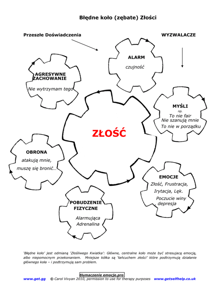 Błędne koło zę a e Złości Przeszłe Doświadczenia WYZWALACZE ALARM czujność AGRESYWNE ZACHOWANIE ie wytrzymam tego MYŚLI np ZŁOŚĆ o nie air ie szanują mnie o nie w porządku OBRONA atakują mnie, muszę się bronić… EMOC E Złość, Frustracja, Irytacja, ęk. POB DZENIE IZYCZNE oczucie winy , depresja Alarmująca Adrenalina ‘Błędne koło’ jest odmianą ‘Złośliwego Kwiatka’: Główne, centralne koło może być stresujacą emocją, albo niepomocnym przekonaniem. Mniejsze kółka są ‘ła cuc em złości’ które podtrzymują działanie głównego koła – i podtrzymują sam problem. www.get.gg tłumaczenie em c e © Carol Vivyan 2010, permission to use for therapy purposes www.getselfhelp.co.uk Złość jest bardzo energetyzującą i motywującą emocją. Jest naturalną i normalną odpowiedzią na poczucie zagrożenia, albo poczucie, że coś jest nie fair, niesprawiedliwe. Czasami mamy rację, że myślimy i reagujemy w ten sposób. Nasza reakcja może być odpowiednia i zdrowa. Na przykład, widzimy, że ktoś popełnia przestępstwo, ktoś jest zaatakowany, możemy instynktownie zareagować i natychmiast ruszyć, by udzielić pomocy osobie, która została zaatakowana i powstrzymać sprawcę. Jednakże, są takie sytuacje, może z powodu naszych przeszłych doświadcze , otoczenia, d więku, sposobu w jaki ktoś na nas patrzy, sposobu w jaki ktoś, coś mówi; gest – cokolwiek – uruchamia tą reakcję. ożemy le interpretować sytuację i wierzyć, że inni nas atakują, krytykują, próbują zranić, co uruchamia błędne koło złości. ożemy się przyzwyczaić do reagowania w taki sposób, i może być trudno zmienić to przyzwyczajenie. o błędne koło złości jest jednak procesem, a procesy możemy przełamywać, szczególnie w miejscach gdzie myślimy i działamy: możemy się nauczyć myśleć i zachowywać się inaczej. ALARM: cz noś uper-skaner ustawiony na wysoką czujność, alarmujący przy wywołujących złość sytuacjach. Możemy się nauczyć, być świadomymi tej czujności, i zmniejszać ją. MYŚLI W tym interpretacje (tendencja do dodawania znaczenia do sytuacji, czy interakcji z innymi). ostrzeganie niesprawiedliwości lub złych zamiarów. rzykładowe myśli/interpretacje: o nie fair, Jestem le traktowana ny, jestem nieszanowana ny, inni są le traktowani, oni się mylą, Jestem atakowana ny, nie godzę sie na to, krytykują mnie. ogą być też myśli, katastroficzne o tym co może się stać, które wywołują lęk. Użyj STOPP: STOP, Teraz we oddec , Obserwuj – na co reaguję? o myślę i czuję o mnie w tej sytuacji uwiera? Perspektywa: Zdystansuj się i spójrz z szerszej perspektywy, czy to akt, czy przekonanie? zy jest inny sposób spojrzenia na to ? zy dobrze odczytuję sytuację ? ak ważne jest to teraz, a jak ważne będzie za miesięcy akiej rady udzieliłabyś, udzieliłbyś komuś innemu przyjacielowi ? Praktykuj to, co działa – zrób najlepszą rzecz, dla ciebie, dla innyc , dla tej sytuacji. o byłoby najbardziej pomocne? (we pod uwagę zarówno krótko jak i długoterminowe konsekwencje) EMOC E Złość, wściekłość, frustracja, irytacja, lęk? Depresja, poczucie winy, wstyd może pojawić się w efekcie błędnego koła złości, szczególnie jako konsekwencja zachowa impulsywnych powodowanych złością IZYCZNE POB DZENIE Adrenalina jest systemem alarmowym organizmu. nergetyzuje i motywuje nasze ciało, tak że jesteśmy gotowi, albo mamy przymus poradzenia sobie z sytuacją w sposób agresywny. STOPP we oddec . kup się na oddyc aniu, możesz wyobrazić sobie, że masz balonik w brzuc u nadmuc ujesz balon wdyc ając powietrze na wdec u , i opróżniasz na wydec u. OBRONA Automatyczna reakcja kiedy wierzymy, że ktoś nam grozi, nas krytykuje, czy atakuje nas w jakiś sposób. STOPP! eraz we oddec , Obserwuj, erspektywa, Praktykuj co działa. AGRESYWNE ZACHOWANIE nergetyzująca i motywująca reakcja fizyczna, oznacza, że bardziej prawdopodobne jest, że zareagujemy fizycznie. odniesiony głos, sarkazm, krzyk, ostry ton, put down, krytyka, konfrontacja, ton głosu, ekspresje mimiczne, zaciśnięte zęby, robienie hałasu, tupanie, chęć uderzenia , przemoc, bójka, zranienie innych lub siebie inne destrukcyjne zachowania alkohol, narkotyki STOPP we oddec . raktykuj co działa: o jest dla mnie najlepsze i najbardziej konstruktywne w tej sytuacji ak mogę zmienić swoją nawykową reakcję ? o, by najbardziej pomogło? o mam zrobić, żeby potem być zadowolną nym z tego co zrobiłam em? (czasami to po prostu usunięcie się z sytuacji i powrót, kiedy odzyskasz spokój). www.get.gg © Carol Vivyan 2010, permission to use for therapy purposes www.getselfhelp.co.uk ZŁOŚĆ Myśli o nie air nni e mnie tra tuj ie o i na to. u i broni Reakcja ciała Adrenalina – i yc ny y tem a armo y - ner ia by a c y /ucie a . re je t yco ana innyc nar i iero ana o nyc mi ni, by pom c nam a c y , a bo uciec anej ytuacj W Z Z oim cie e mo e au a y : r y pie one bicie erca yb y o ec , u no , ci anie ar e api cie mi niac , b , tr ienie or co, ocenie i a roty o y, ie yra ne i enie oty e br uc u, c p j cia o toa ety Wi a c ujno – u anie niebe piec e t a mpu b i ania i o te o, co na o ci ia a yśle ia a co rea uj ? o mi na epn o na o ci ? a bar o je t to r ec y i cie a ne o po ie ia by to na ten temat ? y rea uj na miernie? y moja rea cja je t proporcjona na to un u o a t ? uj , e je tem tra to ana/ny nie air , a e mo e nie ta i by y e interpretuj ytuacj ? y to a t c y opinia? o naj ep e o mo tej ytuacji robi ? amiar tej o oby ia a ac a ia We o ec . ej – a bo nie b i aj i o r a o ci r b naj ep r ec – naj ep a mnie, a innyc naj ep tej ytuacji. ie y poc uje po j, je i to na a ma en , r b co po ojny, nie a re y ny ty o aserty ny po b y a ie… Wi ua i uj iebie, ra c /ra ce o obie t ytuacj po ojny, nie a re y ny, ty o a erty ny po b, t ry u ni pra a i opinie y t ic o b aan a o anyc izua izu nie ie i a u, lub zie n 