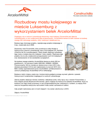 Rozbudowy mostu kolejowego w mieście Luksemburg z wykorzystaniem belek ArcelorMittal Znajdujący się w centrum Luksemburga dwutorowy most kolejowy Pulvermühle jest obecnie rozbudowywany w celu zwiększenia jego przepustowości. ArcelorMittal dostarcza belki stalowe na budowę nowego 242 metrowego wiaduktu, który zaoferuje 2 dodatkowe tory. Budowa tego złożonego projektu, największego projektu kolejowego w kraju, rozpoczęła się w 2009. Dwutorowy most Puvermühle, który przekracza rzekę Alzette w historycznym centrum Luksemburga, łączy linie kolejowe CFL Northern (Chemins de Fer luxembourgeois). Nowy projekt obejmuje rozbudowę tego mostu o kolejne dwa tory kolejowe i nowy wiadukt. Realizacja tego projektu ma na celu zwiększenie przepustowości tych linii kolejowych oraz dostosowanie ich do standardów europejskich. Na budowę nowego wiaduktu ArcelorMittal dostarcza około 200 ton powlekanych, 16-metrowych belek HEB1000, HEB600 i HEB300. Pierwsza partia 160 ton została już dostarczona w lutym 2014 roku, dostawa pozostałych 40 ton jest zaplanowana na styczeń 2015 roku. Belki zostały wyprodukowane przez ArcelorMittal i prefabrykowane w centrum prefabrykacji ArcelorMittal CP3 w Differdange. Budowa w takim miejscu wiąże się z koniecznością podjęcia szeregu wyzwań, głównie z powodu historycznych fundamentów znajdujących w centrum Luksemburga. Zakres projektu obejmuje również rozbiórkę i odbudowę tunelu, który łączy się z mostem Pulvermühle, a który biegnie poniżej Boulevard d'Avranches, gdzie znajduje się historyczna siedziba ArcelorMittal. Ruch na bulwarze nie mógł zostać przerwany w celu przeprowadzenia prac związanych z tunelem, co więcej XVIIIwieczna hiszpańska wieżyczka nad tunelem miała zostać zachowana w całości. Cały projekt realizowany jest w trzech etapach i ma zostać zakończony w 2019. Zdjęcia: ArcelorMittal Copyright © 2014 Constructalia. All rights reserved