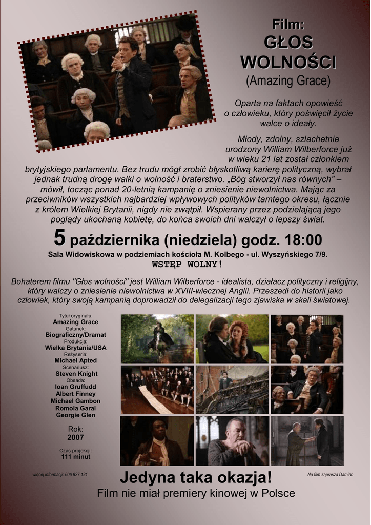 Film: GŁOS WOLNOŚCI (Amazing Grace) Oparta na faktach opowieść o człowieku, który poświęcił życie walce o ideały. Młody, zdolny, szlachetnie urodzony William Wilberforce już w wieku 21 lat został członkiem brytyjskiego parlamentu. Bez trudu mógł zrobić błyskotliwą karierę polityczną, wybrał jednak trudną drogę walki o wolność i braterstwo. „Bóg stworzył nas równych” – mówił, tocząc ponad 20-letnią kampanię o zniesienie niewolnictwa. Mając za przeciwników wszystkich najbardziej wpływowych polityków tamtego okresu, łącznie z królem Wielkiej Brytanii, nigdy nie zwątpił. Wspierany przez podzielającą jego poglądy ukochaną kobietę, do końca swoich dni walczył o lepszy świat. 5 października (niedziela) godz. 18:00 Sala Widowiskowa w podziemiach kościoła M. Kolbego - ul. Wyszyńskiego 7/9. WSTĘP WOLNY! Bohaterem filmu "Głos wolności" jest William Wilberforce - idealista, działacz polityczny i religijny, który walczy o zniesienie niewolnictwa w XVIII-wiecznej Anglii. Przeszedł do historii jako człowiek, który swoją kampanią doprowadził do delegalizacji tego zjawiska w skali światowej. Tytuł oryginału: Amazing Grace Gatunek: Biograficzny/Dramat Produkcja: Wielka Brytania/USA Reżyseria: Michael Apted Scenariusz: Steven Knight Obsada: Ioan Gruffudd Albert Finney Michael Gambon Romola Garai Georgie Glen Rok: 2007 Czas projekcji: 111 minut więcej informacji: 606 927 121 Jedyna taka okazja! Film nie miał premiery kinowej w Polsce Na film zaprasza Damian