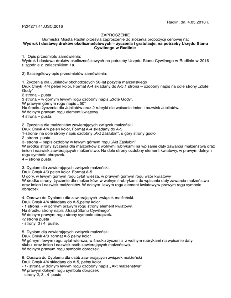Radlin, dn. 4.05.2016 r. PZP.271.41.USC.2016 ZAPROSZENIE Burmistrz Miasta Radlin przesyła zaproszenie do złożenia propozycji cenowej na: Wydruk i dostawę druków okolicznościowych – życzenia i gratulacje, na potrzeby Urzędu Stanu Cywilnego w Radlinie 1. Opis przedmiotu zamówienia: Wydruk i dostawa druków okolicznościowych na potrzeby Urzędu Stanu Cywilnego w Radlinie w 2016 r. zgodnie z załącznikiem 1a. 2) Szczegółowy opis przedmiotów zamówienia: 1. Życzenia dla Jubilatów obchodzących 50-lat pożycia małżeńskiego Druk Cmyk 4/4 pełen kolor, Format A-4 składany do A-5.1 strona – ozdobny napis na dole strony „Złote Gody” 2 strona – pusta 3 strona – w górnym lewym rogu ozdobny napis „Złote Gody”. W prawym górnym rogu napis „ 50” Na środku życzenia dla Jubilatów oraz 2 rubryki dla wpisania imion i nazwisk Jubilatów. W dolnym prawym rogu element kwiatowy. 4 strona – pusta. 2. Życzenia dla małżonków zawierających związek małżeński Druk Cmyk 4/4 pełen kolor, Format A-4 składany do A-5 1-strona- na dole strony napis ozdobny „Akt Zaślubin”, u góry strony godło 2- strona pusta 3- strona – napis ozdobny w lewym górnym rogu „Akt Zaślubin” W środku strony życzenia dla małżonków z wolnymi rubrykami na wpisanie daty zawarcia małżeństwa oraz imion i nazwisk zawierających małżeństwo. Na dole strony ozdobny element kwiatowy, w prawym dolnym rogu symbole obrączek. 4 – strona pusta. 3. Dyplom dla zawierających związek małżeński. Druk Cmyk 4/0 pełen kolor. Format A-5 U góry, w lewym górnym rogu cytat wiesza, w prawym górnym rogu wzór kwiatowy W środku strony życzenie dla małżonków, w wolnymi rubrykami do wpisania daty zawarcia małżeństwa oraz imion i nazwisk małżonków. W dolnym lewym rogu element kwiatowy,w prawym rogu symbole obrączek 4. Oprawa do Dyplomu dla zawierających związek małżeński. Druk Cmyk 4/4 składany do A-5,pełny kolor. - 1 strona - w górnym prawym rogu strony element kwiatowy, Na środku strony napis „Urząd Stanu Cywilnego” W dolnym prawym rogu strony symbole obrączek. -2 strona pusta - strony 3 i 4 puste. 5. Dyplom dla zawierających związek małżeński Druk Cmyk 4/0 format A-5 pełny kolor W górnym lewym rogu cytat wiersza, w środku życzenia z wolnym rubrykami na wpisanie daty ślubu oraz imion i nazwisk osób zawierających małżeństwo. W dolnym prawym rogu symbole obrączek. 6. Oprawa do Dyplomu dla osób zawierających związek małżeński Druk Cmyk 4/4 składany do A-5, pełny kolor. - 1- strona w dolnym lewym rogu ozdobny napis „ Akt małżeństwa” W prawym dolnym rogu symbole obrączek - strony 2, 3 , 4 puste 7. Dyplom do życzeń dla Jubilatów z okazji rocznicy ślubu Druk Cmyk 4/0 format A-5 pełny kolor Na środku strony życzenia, u góry motyw kwiatowy a po niżej napis „Dostojnym Jubilatom Państwu ...” Na samym dole symbole obrączek. 8. Oprawa do dyplomu do życzeń dla Jubilatów z okazji rocznicy ślubu Druk Cmyk 4/4 Format składany do A-5 pełny kolor Na 1 stronie ozdobny napis „Urząd Stanu Cywilnego”, pod napisem godło U góry strony motyw kwiatowy Strony 2, 3, 4 puste. 9. Dyplom dla Panów obchodzących rocznicę urodzin Druk Cmyk 4/0 format A -4 pełny kolor U góry napis „Szanownemu Jubilatowi Panu ...” Po środku życzenia z wykropkowanym miejscem do wpisania określonej rocznicy urodzin (np. 90, 95 itd.) W prawym dolnym rogu motyw kwiatowy (róża). 10. Oprawa do dyplomu dla Panów obchodzących rocznicę urodzin Druk Cmyk 4/0 Format A-4 pełny kolor Na 1 stronie ozdobny napis „W dniu Urodzin” W lewym dolnym rogu motywy kwiatowe W górnym lewym rogu dyplomu i dolnym prawym rogu Dyplomu elementy ozdobne. Strony 2, 3, 4 puste. 11. Dyplom dla Pań obchodzących rocznicę urodzin Druk Cmyk 4/0 format A -4 pełny kolor U góry napis „Dostojnej Jubilatce Pani ...” Po środku życzenia z wykropkowanym miejscem do wpisania określonej rocznicy urodzin (np. 90, 95 itd.) W prawym dolnym rogu motyw kwiatowy. Na samej górze również motyw kwiatowy. 12. Oprawa do dyplomu dla Pań obchodzących rocznicę urodzin Druk Cmyk 4/0 Format A-4 pełny kolor Na 1 stronie ozdobny napis „W dniu Urodzin” W lewym dolnym rogu motywy kwiatowe W górnym lewym rogu dyplomu i na dole Dyplomu elementy kwiatowe. Strony 2, 3, 4 puste. 2. Miejsce dostaw: Urząd Stanu Cywilnego w Radlinie – pok. 306 Urzędu Miasta Radlin ul. Rymera 15 44-310 Radlin 3. Termin płatności: 30 dni od dnia wystawienia faktury. 4. Termin realizacji zamówienia: 21 dni od dnia zawarcia umowy. 5. Propozycję należy złożyć w Urzędzie Miasta Radlin do dnia 11 maja 2016 r. do godz. 11.00. a) fax nr 32 4590205 b) e:mail [email protected] c) pisemnie na adres: Urząd Miasta Radlin, ul. Rymera 15, 44-310 Radlin (kancelaria) 6. Kompletna propozycja cenowa zawiera: a) wypełniony druk propozycji cenowej (wzór zał nr 1 a); b) aktualny odpis z właściwego rejestru (dostarcza wybrany wykonawca przed zawarciem umowy) 7. W załączeniu przesyłam wzór umowy (zał. nr 2), celem zapoznania się i zaakceptowania. 8. Osoba do kontaktu/osoba odpowiedzialna Beata Dziwisz – nr tel. 32 4590224, e-mail [email protected] .................................................................... (podpis osoby upoważnionej z UM Radlin) Wzór zał. Nr 1 do zaproszenia nazwa firmy/podmiotu : ............................................................................................................... .................................................................................................................................................... adres : ................................................................................................................................................ kod, miejscowość, ulica, województwo Numer telefonu : …..........................................................................................................................