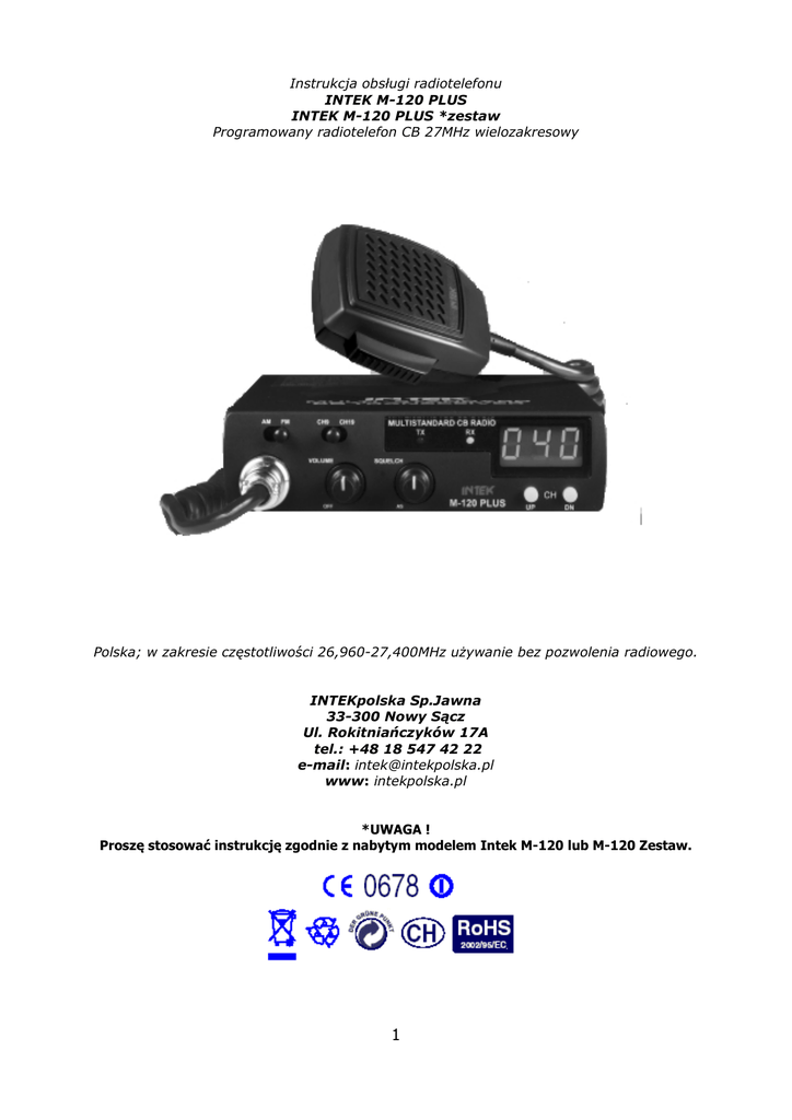 Instrukcja obsługi radiotelefonu INTEK M-120 PLUS INTEK M-120 PLUS *zestaw Programowany radiotelefon CB 27MHz wielozakresowy Polska; w zakresie częstotliwości 26,960-27,400MHz używanie bez pozwolenia radiowego. INTEKpolska Sp.Jawna 33-300 Nowy Sącz Ul. Rokitniańczyków 17A tel.: +48 18 547 42 22 e-mail: [email protected] www: intekpolska.pl *UWAGA ! Proszę stosować instrukcję zgodnie z nabytym modelem Intek M-120 lub M-120 Zestaw. 1 Deklaracja Zgodności Producenta (tłumaczenie) Certyfikat EC potwierdzający Zgodność (do Dyrektyw EC 99/5-89/336-93/68-73/23) W przedstawionej Deklaracji poświadczamy , że produkt jak niżej: Radiotelefon: INTEK M-120 PLUS Spełnia zasadnicze wymagania techniczne stosowane do tego rodzaju produktów i jest zgodny z Dyrektywami EC: 73/23/EEC, 89/336/EEC i 99/5/EC. Rodzaj produktu: radiotelefon przewoźny CB Szczegóły odnośnie zastosowanych norm: EN 300 433-1/-2, EN 300 135-1/-2 EN 301 489-1, EN 301 489-13 EN 60065 Producent: INTEK S.R.L , VIA G.Marconi 16, 20090 SEGRATE Milano ITALY, tel: 0039 02 26950451 fax: 0039 02 26952185 e-mail [email protected] Jednostka notyfikowana wykonująca powyższe badania: EMCCert Dr.Rasek Boelwiese 5, 91320 Ebermannstadt GERMANY Numer Identyfikacyjny : 0678 Osoba kontaktowa : Armando Zanni tel: 0039-02-26950451 fax: 0039 02 26952185 e-mail [email protected] Deklarację podpisano w Segrate 23.05.2008 przez : Generalny Manager: dr. Vittorio Zanetti Zastosowanie urządzenia INTEK M120 PLUS: Austria, Belgia, Czechy, Dania, Finlandia, Francja, Niemcy, Grecja, Islandia, Irlandia, Włochy, Luksemburg, Holandia, Polska, Portugalia, Hiszpania, Szwecja, Szwajcaria, Słowacja, Wielka Brytania, Turcja, (Norwegia) UWAGA ! Jest wskazane aby uważnie przeczytać niniejszą instrukcje obsługi przed użyciem produktu. To zabezpieczy użytkownika przed nieprawidłowym zabronionym w danym kraju używaniem radiotelefonu i uniemożliwi zakłócanie pracy innych użytkowników lub serwisów radiowych. 2 Spis treści – Wstęp - Zawartość pudełka Spis Treści Deklaracja zgodności, Uwagi ...................................... ..................................... 2 Panel przedni ................................................................................................. 4 Panel tylni ..................................................................................................... 5 Instalacja jednostki głównej ............................................................................. 6 Instalacja anteny ............................................................................................ 6 Tabela dostępnych częstotliwości ...................................................................... 8 Wybór częstotliwości / Programowanie .............................................................. 9 Ważne Informacje dla użytkownika ................................................................. 10 Dane Techniczne .......................................................................................... 11 UWAGA ! Przed użyciem sprawdź czy radio jest ustawione na częstotliwość zgodną z pozwoleniem na używanie w danym kraju. Jeśli nie koniecznie je przeprogramuj zgodnie z instrukcją zawartą poniżej. Ten radiotelefon jest ustawiony na polski band PL. Gratulujemy! Zakupu i wyboru najnowszej generacji radiotelefonu CB INTEK. Zawiera on kilka nowoczesnych funkcji i wobec tego jest definitywnie konieczne przeczytanie instrukcji obsługi przed jego użyciem. Ustawienie i użytkowanie radiotelefonu zgodnie z instrukcją zapewni jego kilkuletnie bezawaryjne działanie. INTEK jest zaangażowany nieustannie w dostarczenie najnowszej generacji urządzeń wysokiej jakości zgodnie z życzeniami klientów i ciągle jest otwarty na komentarze ze strony użytkowników. INTEK M120 PLUS jest najnowszym rozwiązaniem hardwaerowym i programowym w tej klasie urządzeń. Zawiera specjalny wielostandardowy procesor do ustawiania zakresów częstotliwości zgodnie z normami różnych państw UE. Dlatego produkt ten może być używany na terenie całej Unii Europejskiej z zastrzeżeniem państw nie ujętych w tabeli gdzie regulacje prawne są inne. Zakupione radio jest ustawione na polski band PL. Zawartość pudełka Proszę sprawdzić czy w pudełku znajdują się następujące części: - radiotelefon CB - uchwyt do zamontowania w samochodzie, śruby - kabel zasilający z bezpiecznikiem i wtykiem do - uchwyt na mikrofon zapalniczki - antena magnetyczna bat + podstawa z kablem - mikrofon z kablem 3 Opis przełączników i gałek – Ustawianie Panel przedni 1. Przełącznik modulacji AM/FM. Przełącznik modulacji AM/FM zarówno w TX jak i RX, jeśli żądana modulacja jest udostępniona w ramach zaprogramowanej częstotliwości pasma. 2. Przełącznik szybkiego dostępu do kanałów alarmowych 9/19. Przycisk szybkiego dostępu kanałów alarmowych CH9 oraz CH19 w zaprogramowanym paśmie kanału. Przełączanie go powoduje przełączenie pracy między kanałami CH9, CH19 i normalną pracą radiotelefonu w centralnym położeniu przełącznika. 3. Wskaźnik TX (nadawania). Czerwona dioda LED sygnalizuje świeceniem funkcję nadawania. 4. Wskaźnik RX (odbioru). Zielona dioda LED sygnalizuje świeceniem funkcję odbioru. 5. Wyświetlacz LED. Duży, trzycyfrowy wyświetlacz LED wskazuje na kanał pracy i lub wyświetla kod ID wybranego pasma. 6. Przycisk DN (Down). Przycisk pozwala na wprowadzanie niższych kanałów. Przytrzymanie go powoduje, szybkie 'przewijanie' kanałów w dół. 7. Przycisk UP (Up). Przycisk pozwala na wprowadzanie wyższych kanałów. Przytrzymanie go powoduje, szybkie 'przewijanie' kanałów w górę. 4 Opis przełączników i gałek – Ustawianie 8. Pokrętło regulacji AS/SQUELCH. Regulacja manualna (Squelch) umożliwia wyciszenie zakłóceń tła odbiornika. Przekręcaj gałkę SQL w prawo, aż do zaniknięcia zakłóceń pochodzących z tła. Ustaw gałkę Sqelch w pozycji skrajnej lewo w