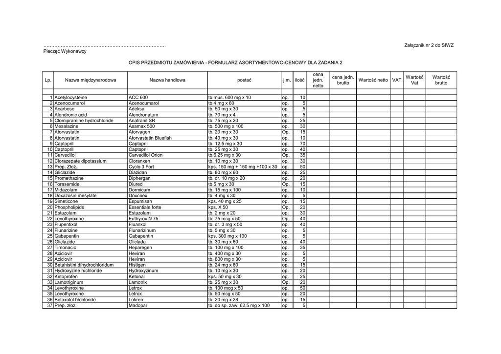…………………………………………………………………… Pieczęć Wykonawcy Załącznik nr 2 do SIWZ OPIS PRZEDMIOTU ZAMÓWIENIA - FORMULARZ ASORTYMENTOWO-CENOWY DLA ZADANIA 2 Lp. 1 2 3 4 5 6 7 8 9 10 11 12 13 14 15 16 17 18 19 20 21 22 23 24 25 26 27 28 29 30 31 32 33 34 35 36 37 Nazwa międzynarodowa Acetylocysteine Acenocumarol Acarbose Alendronic acid Clomipramine hydrochloride Mesalazine Atorvastatin Atorvastatin Captopril Captopril Carvedilol Clorazepate dipotassium Prep. Złoż.. Gliclazide Promethazine Torasemide Midazolam Doxazosin mesylate Simeticone Phospholipids Estazolam Levothyroxine Flupentixol Flunarizine Gabapentin Gliclazide Timonacic Aciclovir Aciclovir Betahistini dihydrochloridum Hydroxyzine h/chloride Ketoprofen Lamotriginum Levothyroxine Levothyroxine Betaxolol h/chloride Prep. złoż. Nazwa handlowa ACC 600 Acenocumarol Adeksa Alendronatum Anafranil SR Asamax 500 Atorvagen Atorvastatin Bluefish Captopril Captopril Carvedilol Orion Cloranxen Cyclo 3 Fort Diazidan Diphergan Diured Dormicum Doxonex Espumisan Essentiale forte Estazolam Euthyrox N 75 Fluanxol Flunarizinum Gabapentin Gliclada Heparegen Heviran Heviran Histigen Hydroxyzinum Ketonal Lamotrix Letrox Letrox Lokren Madopar postać tb mus. 600 mg x 10 tb 4 mg x 60 tb. 50 mg x 30 tb. 70 mg x 4 tb. 75 mg x 20 tb. 500 mg x 100 tb. 20 mg x 30 tb. 40 mg x 30 tb. 12,5 mg x 30 tb. 25 mg x 30 tb.6,25 mg x 30 tb. 10 mg x 30 kps. 150 mg + 150 mg +100 x 30 tb. 80 mg x 60 tb. dr. 10 mg x 20 tb.5 mg x 30 tb. 15 mg x 100 tb. 4 mg x 30 kps. 40 mg x 25 kps. X 50 tb. 2 mg x 20 tb. 75 mcg x 50 tb. dr. 3 mg x 50 tb. 5 mg x 30 kps. 300 mg x 100 tb. 30 mg x 60 tb. 100 mg x 100 tb. 400 mg x 30 tb. 800 mg x 30 tb. 24 mg x 60 tb. 10 mg x 30 kps. 50 mg x 30 tb. 25 mg x 30 tb. 100 mcg x 50 tb. 50 mcg x 50 tb. 20 mg x 28 tb. do sp. zaw. 62,5 mg x 100 j.m. ilość op. op. op. op. op. op. Op. op. op. op. Op. op. op. op. op. Op. op. op. op. Op. op. Op. op. op. op. op. op. op. op. op. op. op. Op. op. op. op. op 10 5 5 5 25 30 15 10 70 40 35 30 50 25 20 15 10 5 15 20 30 40 40 5 5 40 35 5 5 15 20 25 20 50 20 15 5 cena jedn. netto cena jedn. Wartość Wartość netto VAT brutto Vat Wartość brutto 38 39 40 41 42 43 44 45 46 47 48 49 50 51 52 53 54 55 56 57 58 59 60 61 62 63 64 65 66 67 68 69 70 71 72 73 74 75 76 77 78 79 80 81 82 83 Prep. złoż. Madopar Prep. złoż. Madopar Prep. złoż. Madopar Prep. złoż. Madopar Prep. złoż. Madopar Prep. złoż. Madopar HBS Piracetam Memotropil Thiamazole Metizol Metronidazole Metronidazol Budesonide Miflonide Budesonide Miflonide Memantine h/chloride Nemdatine Memantine h/chloride Nemdatine Nifuroxazide Nifuroksazyd Diclofenac sodium Olfen SR 75 Diclofenac sodium Olfen UNO Pancreatin Pangrol Diosmin Pelethrocin Tramadol h/chloride Poltram retard 100 Perindopril arginine Prestarium Perindopril arginine Prestarium Pridinol Pridinol Propranolol h/chloride Propranolol Prep. złoż. Rutinoscorbin Prep. złoż. Sebidin Simvastatin Simvastatin Simvastatin Simvasterol Prep. złoż. Sinemet CR Metformin h/chloride Siofor 1000 Metformin h/chloride Siofor 500 Buspirone h/chlor. Spamilan Buspirone h/chlor. Spamilan Tiotropium bromide Spiriva Tiotropium bromide Spiriva Sulfasalazine Sulfasalazin EN Finasteride Symasteride Tamsulosin Symlosin SR Carvedilol Symprend Prep. złoż. Thiocodin Propylthiouracil Thyrosan Tramadol h/chlor,Paracetamoltb. 37,5 Tramapar mg + 325 mg x 60 Valsartan Valsartan 123 ratio Mebendazole Vermox Vinpocetine Vinpoton Rivaroxaban Xarelto Ondansetron Zofran kps. 62,5 mg x 100 kps. 125 mg x 100 tb. do sp.zaw. 125 mg x 100. tb. 250 mg x 100 kps. 250 mg x 100 kps. 125 mg x 100 tb. 1200 mg x 60 tb. 5 mg x 50 tb. 250 mg x 20 kps. 200 mcg x 60 kps. 400 mcg x 60 tb. 10 mg x 56 tb. 20 mg x 56 tb. 100 mg x 24 tb. 75 mg x 30 tb. 150 mg x 30 kps.25 000 j x 20 tb. x 30 tb. 100 mg x 50 tb. 5 mg x 30 tb 10 mg x 30 tb. 5 mg x 50 tb. 40 mg x 50 tb. x 90 tb. do ssania x 20 tb. 40 mg x 28 tb. 20 mg x 28 tb. 200mg/50 mg x 100 tb. 1000 mg x 30 tb. 500 mg x30 tb. 5 mg x 60 tb. 10 mg x 60 kps. 18 mcg x 30 kps. 18 mcg x 30 +Handi Haler tb. 500 mg x 50 tb. 5 mg x 30 kps. 0,4 mg x 30 tb. 25 mg x 30 tb. x 10 tb. 50 mg x 90 tb. 160 mg x 28 tb. 100 mg x 6 tb. 5 mg x 50 tb. 20 mg x 28 tb. 4 mg x 10 op. op. op. op. op. op. op. op. op. op. op. op. Op. op. Op. Op. op op. Op. op. op. Op. op. op. op. op op. op. Op. op. op. op op. op. op. op. op. op. op. op. op. op. op. op. Op. op. 10 10 3 3 5 5 60 5 30 60 5 15 10 40 20 15 45 220 40 70 20 300 30 30 90 40 40 20 10 70 10 35 30 5 5 20 90 10 5 5 25 30 5 180 5 3 84 85 86 87 88 89 90 91 92 93 94 95 96 97 98 99 100 101 102 103 104 105 106 107 108 109 110 111 112 113 114 115 116 117 118 119 120 121 122 123 124 125 126 127 128 129 Epinephrine Biperiden Amantadine Amiodarone Atropine Metoprolol Calcium lactate gluconate Suxamethonium chloride Clonazepam Zuclopenthixol Zuclopenthixol decanoate Medroxyprogesterone acetate Dexamethasone sod.phosph. Digoxin Norepinephrine Lidocaine Metoclopramide h/chloride Naloxone Sodium bicarbonate Sodium chloride Nimodipine Drotaverine Papaverine Antazoline Propranolol Ciprofloxacin h/chloride Paracetamol Alfalipoic acid Clorazepate dipotassium Aciclovir Doxycycline Adrenalina Akineton Amantix Amiokordin Atropinum sulf. Betaloc Calcium Polfa Chlorsuccyllin Clonazepamum Clopixol Acuphase Clopixol Depot Depo Provera Dexaven Digoxin Dopaminum h/chlor Glucosum Heparinum Humulin N Ins. Actrapid Ins. Insulatard Ins. Mixtard 30 P Insul. Mixtard 50 Insul. Novorapid Levonor Lignocainum h/chlor. Metoclopramidum Naloxonum Natrium bicarbonicum Natrium chloratum Nimotop S No - Spa Papaverinum h/chlor. Paski test Accu- Chek active gluc. Paski Test. One-Touch Select Paski Ascensia Entrust Paski IXELL Paski Optium XIDO Phenazolinum Propranolol Proxacin Sinebriv Thiogamma Turbo Set Tranxene Woda do wstrzyk. Baxter Aciclovir Doxycyclinum amp. 1 mg 1 ml x 10 amp. 5 mg 1 ml x 5 fl.. 200 mg 500 ml x 10 amp. 150 mg 3 ml x 5 amp. 1 mg 1 ml x 10 am