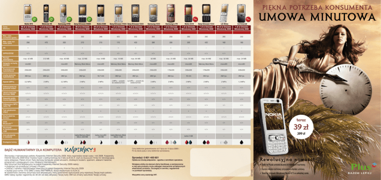 PIĘKNA POTRZEBA KONSUMENTA UMOWA MINUTOWA + Nokia N73 Cena telefonu Motorola V8 Samsung U700 Sony Ericsson K660i Nokia 6300 Sony Ericsson W880i Sony Ericsson K800i Samsung D900i Samsung L170 Nokia 5310 Sony Ericsson K550i LG Shine LG Emerald 39 zł w Umowie Minutowej 4000 1 zł w Umowie Minutowej 4000 1 zł w Umowie Minutowej 4000 49 zł w Umowie Minutowej 3000 29 zł w Umowie Minutowej 3000 1 zł w Umowie Minutowej 4000 1 zł w Umowie Minutowej 4000 1 zł w Umowie Minutowej 3000 1 zł w Umowie Minutowej 4000 1 zł w Umowie Minutowej 4000 1 zł w Umowie Minutowej 3000 49 zł w Umowie Minutowej 3000 1 zł w Umowie Minutowej 3000 Max. czas czuwania (godz.) 350 330 270 330 348 425 350 260 250 300 350 280 250 Max. czas rozmów (min) 266 470 300 270 210 170 420 390 300 320 420 160 180 + – + + – + + – + – – – – GPRS/EDGE +/+ +/+ +/+ +/+ +/+ +/– +/– +/+ +/+ +/+ +/+ +/+ +/– Pamięć wewnętrzna 3G max. 42 MB 512 MB max. 40 MB max. 32 MB max. 9 MB max. 16 MB max. 64 MB 50 MB max. 25 MB max. 30 MB max. 64 MB max. 50 MB max. 24 MB Gniazdo na kartę pamięci miniSD – microSD Memory Stick Micro microSD Memory Stick Micro Memory Stick Micro microSD microSD microSD Memory Stick Micro microSD microSD Rozdzielczość wyświetlacza 240x320 240x320 240x320 240x320 240x320 240x320 240x320 240x320 176x220 240x320 176x220 240x320 240x320 Liczba kolorów wyświetlacza 262 tys. 262 tys. 262 tys. 262 tys. 16,7 mln 262 tys. 262 tys. 262 tys. 262 tys. 16 mln 262 tys. 262 tys. 262 tys. Aparat (MPix) 3,2 MPix 2 MPix 3,2 MPix 2 MPix 2 MPix 2 MPix + przedni do wideorozmów 3,2 MPix + przedni do wideorozmów 3 MPix 2 MPix 2 MPix 2 MPix 2 MPix 1,3 MPix Odtwarzanie/nagrywanie wideo +/+ +/+ +/+ +/+ +/+ +/+ +/+ +/+ +/+ +/+ +/+ +/+ +/+ Java/e-mail/wiadomości MMS +/+/+ +/+/+ +/+/+ +/+/+ +/+/+ +/+/+ +/+/+ +/+/+ +/+/+ +/+/+ +/+/+ +/+/+ +/+/+ Dzwonki polifoniczne/dyktafon +/+ +/+ +/+ +/+ +/+ +/+ +/+ +/+ +/+ +/+ +/+ +/+ +/+ Odtwarzacz MP3/ radio FM +/+ +/– +/– +/+ +/+ +/– +/+ +/+ +/+ +/+ +/+ +/– +/+ Tryb głośnomówiący + + + + + + + + + + + – + Gry/budzik/kalendarz –/+/+ +/+/+ +/+/+ +/+/+ +/+/+ +/+/+ +/+/+ +/+/+ –/+/+ +/+/+ +/+/+ +/+/+ +/+/+ IrDA/ BluetoothTM +/+ –/+ –/+ –/+ –/+ –/+ +/+ –/+ –/+ –/+ +/+ –/+ +/+ Słuchawki w zestawie/kabel USB +/+ +/+ +/+ +/+ +/– +/+ +/+ +/+ +/+ +/+ +/+ +/– +/+ – – – karta Memory Stick Micro 256 MB karta microSD 128 MB karta Memory Stick Micro 1 GB – – – karta 2 GB – – – Inne akcesoria w zestawie teraz 39 zł 399 zł Dostępne kolory Skorzystaj z najnowszego pakietu Kaspersky Internet Security 2009, który wyprzedza swoje czasy i rok 2008. Kaspersky Internet Security 2009 teraz możesz kupić z pełną licencją na 2 lata za 8,54 zł, czyli za duuuuużo mniej niż obowiązującą cena sklepowa. Pakiet chroni Twój domowy komputer przed wirusami, złośliwymi kodami, spamem, atakami hakerów, programami szpiegującymi oraz robakami internetowymi. Aby otrzymać kod aktywacyjny na pakiet Kaspersky Internet Security 2009 należy: • podpisać lub przedłużyć umowę z Plusem, • pobrać z serwisu internetowego www.plus.pl pakiet Kaspersky Internet Security 2009 • wysłać pod numer 7772 SMS o treści ANTYWIRUS. Koszt wiadomości to 8,54 zł. W wiadomości zwrotnej otrzymasz kod aktywacyjny, który powinieneś wykorzystać przy rejestracji Twojej kopii pakietu SMS należy wysłać najpóźniej do 30 dni od daty aktywacji Twojej karty SIM lub zmiany warunków Twojej umowy. Ceny telefonów gwarantowane od 7 lipca do 15 lipca 2008 r. Po tej dacie pytaj o ceny telefonów sprzedawcę. Sprzedaż: 0 801 400 601 Rewolucyjna nowość! Niniejsza ulotka nie stanowi oferty handlowej, a zamieszczony w niej opis produktu może odbiegać nieznacznie od faktycznych właściwości produktu. Szczegóły w cenniku, regulaminie i w punktach sprzedaży. • Tylko w Plusie umowa liczona w minutach rozmowy. Opłata za minutę połączenia – zgodna z cennikiem operatora. Wszystkie ceny zawierają VAT. 507449 BĄDŹ HUMANITARNY DLA KOMPUTERA • Każda minuta rozmowy przyspiesza koniec umowy. • Teraz w Umowie Minutowej Nokia N73 w unikalnej cenie. REWOLUCYJNIE NOWA UMOWA MINUTOWA Sensacyjna nowość! Realizowana w Plusie Potrzeba Konsumenta... czyli potrzeba umowy liczonej w minutach, a nie w latach. Gadasz, gadasz, gadasz... a Twoja umowa i tak trwa 24 miesiące?! Przekraczasz liczbę minut wliczoną w abonament... i nic z tego nie masz?! Czekasz całe 2 lata, by wymienić telefon lub skorzystać z nowej promocji?! Wynaleźliśmy coś specjalnie dla Ciebie! UMOWA MINUTOWA! • po raz pierwszy nie podpisujesz umowy na lata – tylko na liczbę minut do wydzwonienia • każda wykorzystana minuta przybliża Cię do końca umowy • wydzwaniasz deklarowany limit i możesz skorzystać z nowej promocji i wybrać nowy telefon JAK TO DZIAŁA? • kupujesz umowę na określoną liczbę minut • za wydzwonione minuty płacisz co miesiąc (otrzymujesz standardową fakturę). Nie płacisz z góry za wszystkie zadeklarowane minuty • Twoją umowę skracają połączenia do wszystkich krajowych sieci stacjonarnych i komórkowych oraz SMS-y i MMS-y (1 minuta = 2 MMS-y = 4 SMS-y) • niewykorzystane minuty przechodzą! Np. jeśli nie wydzwonisz minimalnej miesięcznej liczby 35 minut, otrzymasz fakturę za 35 minut, a niewykorzystane minuty zużywasz w kolejnych 3 okresach rozliczeniowych • w każdej chwili możesz sprawdzić SMS-em liczbę wydzwonionych do tej pory minut – wystarczy wysłać bezpłatnego SMS-a o treści B pod numer 2580; informacje te znajdziesz również na Twojej fakturze • im wyższą deklarujesz liczbę minut, tym bardziej atrakcyjny telefon możesz wybrać i mieć niższe stawki za połączenia • Umowa Minutowa nie obejmuje minut, SMS-ów, MMS-ów nie uwzględnionych w promocji. PRZYKŁAD BARDZO PRAKTYCZNY: • Wybierasz wariant 3000 minut • Jeśli będziesz rozmawiał 5 minut dziennie – Twoja umowa będzie trwała 