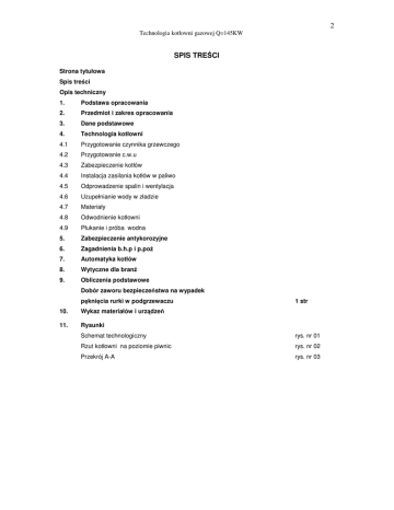 2 Technologia kotłowni gazowej Q=145KW SPIS TRE CI Strona tytułowa Spis tre ci Opis techniczny 1. Podstawa opracowania 2. Przedmiot i zakres opracowania 3. Dane podstawowe 4. Technologia kotłowni 4.1 Przygotowanie czynnika grzewczego 4.2 Przygotowanie c.w.u 4.3 Zabezpieczenie kotłów 4.4 Instalacja zasilania kotłów w paliwo 4.5 Odprowadzenie spalin i wentylacja 4.6 Uzupełnianie wody w zładzie 4.7 Materiały 4.8 Odwodnienie kotłowni 4.9 Płukanie i próba wodna 5. Zabezpieczenie antykorozyjne 6. Zagadnienia b.h.p i p.po 7. Automatyka kotłów 8. Wytyczne dla bran 9. Obliczenia podstawowe Dobór zaworu bezpiecze stwa na wypadek p kni cia rurki w podgrzewaczu 10. Wykaz materiałów i urz dze 11. Rysunki 1 str Schemat technologiczny rys. nr 01 Rzut kotłowni na poziomie piwnic rys. nr 02 Przekrój A-A rys. nr 03 3 Technologia kotłowni gazowej Q=145KW Opis techniczny 1. Podstawa opracowania - Zlecenie Inwestora - Dane Inwestora wielko ci zapotrzebowania ciepła - Uzgodnienia z Inwestorem - Normy i wytyczne projektowania kotłowni z kotłami gazowymi 2. Przedmiot i zakres opracowania. o Technologia kotłowni gazowej przygotowuj ca czynnik grzewczy ( woda 80/60 C ) dla celów centralnego ogrzewania i przygotowania c.w.u dla budynku administracyjno-socjalnego. Opracowanie zawiera opini do spraw b.h.p i p.po . 3. Dane podstawowe. Kotłownia zlokalizowana w wydzielonym pomieszczeniu na poziomie piwnic wytwarza o b dzie ciepło w postaci wody grzewczej o parametrach 80/60 C na potrzeby grzewcze budynku i przygotowania c.w.u. Moc kotłowni okre lona została na 145 KW. Dobrano kocioł wodny kondensacyjny o mocy 145 KW typu Module 145 firmy UNICAL w komplecie z palnikiem gazowym modulowanym wraz ze cie k gazow , zestawem poł czeniowym wraz z grup bezpiecze stwa ISPESL oraz sprz głem hydraulicznym. Sterowanie kotła za pomoc tablicy nakotłowej. Tablica wyposa ona jest w automatyk zabezpieczaj c , tzn. : - ogranicznik temperatury bezpiecze stwa - regulator temperatury Zastosowana automatyka zapewnia bezobsługow , bezpieczn i energooszcz dn prac kotłowni zgodnie z zadanym programem ogrzewania w tym : - sterowanie ogrzewaniem w zale no ci od temperatury zewn trznej, - sterowanie w zale no ci od zadanego programu czasowego praca w trybie „dziennym” i ”osłabienia nocnego”; - sygnalizacj stanów pracy i stanów awaryjnych - realizacj wszystkich funkcji kontrolno-zabezpieczaj cych. - sterowanie podgrzewaniem ciepłej wody u ytkowej wraz z funkcj ochrony przeciwbakteryjnej - prowadzenie kotłowni w trybie priorytetu c.w.u. Parametry techniczne kotła : - zakres mocy cieplnej kotła 12-145 KW - wytwarzanie kondensatu 8,9-25kg/h - temperatura spalin 30,4-47,2 C 0 4 Technologia kotłowni gazowej Q=145KW - dopuszczalna temperatura na zasilaniu 100oC - dopuszczalne ci nienie robocze 6 bary - rednica wylotu spalin DN 150 ci ar kotła 524 kg 4. Technologia kotłowni. 4.1 Przygotowanie czynnika grzewczego ródłem ciepła dla potrzeb cieplnych budynku wentylacji i przygotowania c.w.u jest kocioł wodny kondensacyjny o mocy 145 KW typu Module 145 firmy UNICAL kocioł typu z palnikiem modulowanym, pracuj cy w pełnej automatyce temperaturowej oraz wydajno ciowej w zale no ci od temperatury zewn trznej oraz potrzeb instalacji wewn trznych. Cało układu grzewczego podzielono na dwa niezale ne obiegi - obieg nr 1 pokrywa potrzeby cieplne budynku - obieg nr 2 zasila podgrzewacz zasobnikowy c.w.u Pompy obiegowe. Dla ka dego obiegu przewidziano pomp wymuszaj c obieg czynnika grzewczego. Zastosowano pompy Wilo Stratos charakteryzuj ce si cichobie no ci i oszcz dno ci energii elektrycznej oraz samonastawnym trybem pracy. Zawory mieszaj ce. Dla umo liwienia regulacji temperatury czynnika grzewczego w obiegu c.o. w zale no ci od temperatury zewn trznej , pory dnia oraz w dni wolne od pracy zainstalowano na przewodzie zasilaj cym zawór mieszaj cy firmy HONEYWELL. 4.2 Przygotowanie c.w.u Przygotowanie c.w.u zaprojektowano w zasobnikowym podgrzewaczu V=420l zasilanym wod grzewcz z kotła. Podgrzewanie wody odbywa b dzie si w nocy przez 1 godzin Zmagazynowana b dzie wtedy woda ciepła w ilo ci 420 l. Pozostała ilo wody zostanie podgrzana w czasie u ytkowania przy równoczesnym grzaniu pomieszcze Pompa cyrkulacyjna c.w.u. Celem zapewnienia stałej temperatury wody ciepłej w ruroci gu cyrkulacyjnym przewidziano pomp Wilo typu Z 4.3 Zabezpieczenie kotła. Dla zaprojektowanego układu kotła przyj to zabezpieczenie zgodne z norm PN - 91/B - 02414 w składzie : - zawór bezpiecze stwa ( dostawa kompletna z kotłem ) - naczynie wzbiorcze przeponowe, - rura wzbiorcza, - osprz t ( manometr , spust , zawory ). Dodatkowo dla podgrzewacza na ruroci gu wody zimnej przewidziano jako zabezpieczenie przed wzrostem ci nienia podczas pracy instalacji zawór bezpiecze stwa typu SYR 2115 . Technologia kotłowni gazowej Q=145KW 5 natomiast jako zabezpieczenie przed wzrostem obj to ci wody podczas podgrzewania naczynie wzbiorcze przeponowe. 4.4 Instalacja zasilania kotłów w paliwo. Paliwem do zastosowanego kotła jest : - gaz niskopr 3 ny w ilo ci max. 15,3 m /h. Doprowadzenie gazu do kotłów uj to w odr bnym opracowaniu. Kotłowni wyposa ono w system wykrywania wycieku gazu.( uj to w opracowaniu wewn trznej instalacji gazowej ) 4.5 Odprowadzenie spalin i wentylacja Odprowadzenie spalin z kotła odbywa si kanałem DN150 do istniej cego komina DN200 wyprowadzonego ponad dach poprzez kanał spalinowy DN150 zaizolowany cieplnie i wyposa ony w regulator ci gu spalin. Pomieszczenie kotłowni zaopatrzy w kanał nawiewny typu „Z” o wymiarach 300 × 350 mm zlokalizowany 0,50m nad posadzk kotłowni. Wywiew powietrza z pomieszczenia kotłowni poprzez istniej cy komin DN200 wyprowadzony ponad dach.. Uwaga : Zabrania si wyposa ania kanałów wentylacyjnych w elementy regulacyjne, umo liwiaj ce zmniejszenie powierzchni kanału. 4.6 Uzupełnianie wody w zładzie. Dla uzupełniania wody w instalacji przewidziano automatyczny zmi kcza