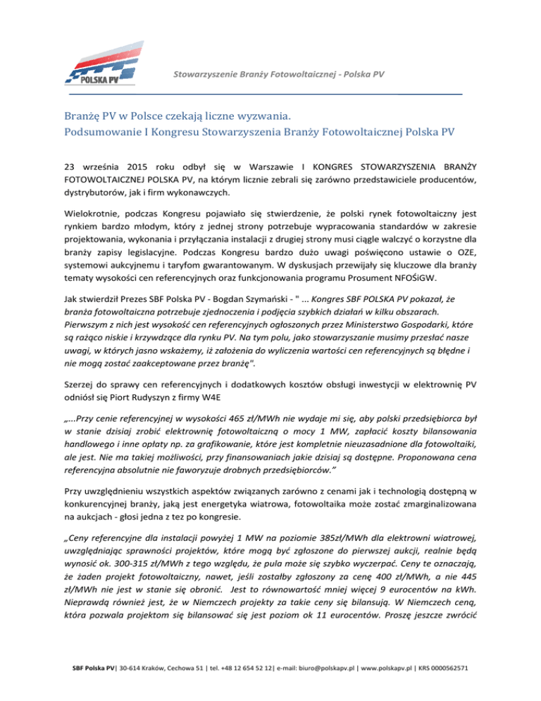 Stowarzyszenie Branży Fotowoltaicznej - Polska PV Branżę PV w Polsce czekają liczne wyzwania. Podsumowanie I Kongresu Stowarzyszenia Branży Fotowoltaicznej Polska PV 23 września 2015 roku odbył się w Warszawie I KONGRES STOWARZYSZENIA BRANŻY FOTOWOLTAICZNEJ POLSKA PV, na którym licznie zebrali się zarówno przedstawiciele producentów, dystrybutorów, jak i firm wykonawczych. Wielokrotnie, podczas Kongresu pojawiało się stwierdzenie, że polski rynek fotowoltaiczny jest rynkiem bardzo młodym, który z jednej strony potrzebuje wypracowania standardów w zakresie projektowania, wykonania i przyłączania instalacji z drugiej strony musi ciągle walczyć o korzystne dla branży zapisy legislacyjne. Podczas Kongresu bardzo dużo uwagi poświęcono ustawie o OZE, systemowi aukcyjnemu i taryfom gwarantowanym. W dyskusjach przewijały się kluczowe dla branży tematy wysokości cen referencyjnych oraz funkcjonowania programu Prosument NFOŚiGW. Jak stwierdził Prezes SBF Polska PV - Bogdan Szymański - " ... Kongres SBF POLSKA PV pokazał, że branża fotowoltaiczna potrzebuje zjednoczenia i podjęcia szybkich działań w kilku obszarach. Pierwszym z nich jest wysokość cen referencyjnych ogłoszonych przez Ministerstwo Gospodarki, które są rażąco niskie i krzywdzące dla rynku PV. Na tym polu, jako stowarzyszanie musimy przesłać nasze uwagi, w których jasno wskażemy, iż założenia do wyliczenia wartości cen referencyjnych są błędne i nie mogą zostać zaakceptowane przez branżę". Szerzej do sprawy cen referencyjnych i dodatkowych kosztów obsługi inwestycji w elektrownię PV odniósł się Piort Rudyszyn z firmy W4E „...Przy cenie referencyjnej w wysokości 465 zł/MWh nie wydaje mi się, aby polski przedsiębiorca był w stanie dzisiaj zrobić elektrownię fotowoltaiczną o mocy 1 MW, zapłacić koszty bilansowania handlowego i inne opłaty np. za grafikowanie, które jest kompletnie nieuzasadnione dla fotowoltaiki, ale jest. Nie ma takiej możliwości, przy finansowaniach jakie dzisiaj są dostępne. Proponowana cena referencyjna absolutnie nie faworyzuje drobnych przedsiębiorców.” Przy uwzględnieniu wszystkich aspektów związanych zarówno z cenami jak i technologią dostępną w konkurencyjnej branży, jaką jest energetyka wiatrowa, fotowoltaika może zostać zmarginalizowana na aukcjach - głosi jedna z tez po kongresie. „Ceny referencyjne dla instalacji powyżej 1 MW na poziomie 385zł/MWh dla elektrowni wiatrowej, uwzględniając sprawności projektów, które mogą być zgłoszone do pierwszej aukcji, realnie będą wynosić ok. 300-315 zł/MWh z tego względu, że pula może się szybko wyczerpać. Ceny te oznaczają, że żaden projekt fotowoltaiczny, nawet, jeśli zostałby zgłoszony za cenę 400 zł/MWh, a nie 445 zł/MWh nie jest w stanie się obronić. Jest to równowartość mniej więcej 9 eurocentów na kWh. Nieprawdą również jest, że w Niemczech projekty za takie ceny się bilansują. W Niemczech ceną, która pozwala projektom się bilansować się jest poziom ok 11 eurocentów. Proszę jeszcze zwrócić SBF Polska PV| 30-614 Kraków, Cechowa 51 | tel. +48 12 654 52 12| e-mail: [email protected] | www.polskapv.pl | KRS 0000562571 Stowarzyszenie Branży Fotowoltaicznej - Polska PV uwagę na to, że w Niemczech inwestor w ogóle nie ponosi kosztów przyłączenia do sieci, a w Polsce koszty związane z przyłączeniem do sieci wynoszą 20-30% całego projektu.” – dodaje Piotr Rudyszyn. Uczestnicy Kongresu jednoznacznie stwierdzili, że fotowoltaika ma szansę jedynie na aukcjach do 1MW, gdzie panuje mniejsza konkurencja ze strony technologii wiatrowych i biomasowych, jednak zgodnie z wyliczeniami Instytutu Energetyki Odnawialnej cena referencyjna powinna wynosić ponad 600 zł/MWh Sceptycznie do systemu aukcyjnego podchodzi Grzegorz Wiśniewski - prezes Instytutu Energetyki Odnawialnej – „System aukcyjny, w obecnej wersji, w przypadku fotowoltaiki jest wprowadzony zdecydowanie za szybko. W takim systemie fotowoltaika przegra cenowo z dużymi farmami wiatrowymi, współspalaniem i nowym graczem na rynku OZE – spalarniami odpadów. Ma jednak szansę w aukcjach poniżej 1 MW, o ile zdoła uzyskać warunki przyłączenia do sieci, gdzie konkurentem będą pojedyncze elektrownie wiatrowe i biogazownie oraz kogeneracja na biomasie. Warunkiem dopuszczenia do konkurencji pomiędzy technologiami OZE są ceny referencyjne - jeżeli dla fotowoltaiki będą za niskie, system aukcyjny wypchnie ją na margines aukcji i dalej będzie funkcjonowała w niszach. Koszty energii z fotowoltaiki przytoczone w obecnym projekcie rozporządzenia o cenach referencyjnych są za niskie, nie uwzględniają wszystkich składników kosztów i ryzyka, a wyprowadzone z nich ceny referencyjne w sposób szczególny dyskryminują fotowoltaikę.” W zakresie mikroinstalacji na Kongresie wiele uwagi poświęcono także funkcjonowaniu programu Prosument NFOŚiGW. "...Drugim obszarem, w jakim należy podjąć szybkie działania, jako stowarzyszenie, jest funkcjonowanie programu Prosument. Panel dyskusyjny poświęcony temu tematowi pokazał, że firmy, które wykonują instalacje w ramach programu Prosument z uwagi na opóźnienia w płatnościach zaczynają być zagrożone utratą płynności finansowej. W tej kwestii liczymy na współpracę z naszymi partnerami z BOŚ i NFOŚiGW, którym przekażemy nasze propozycje usprawnienia funkcjonowania programu." - twierdzi Bogdan Szymański Prezes SBF Polska PV. "...Program prosument jest bardzo dobrą ideą. Dla jego usprawnienia można byłoby zaimplementować pewne rozwiązania, które już funkcjonują w linii programu wdrażanej przez niektóre WFOŚiGW. Rozwiązaniem, które z pewnością pomogłoby branży to uproszczenie i skrócenie procedur a doraźnie częściowe zaliczkowanie wypłat.” - komentuje Łukasz Sajewicz z firmy Viessmann. Zgromadzeni na Kongresie przedstawiciele firm wykonawczych oraz dys