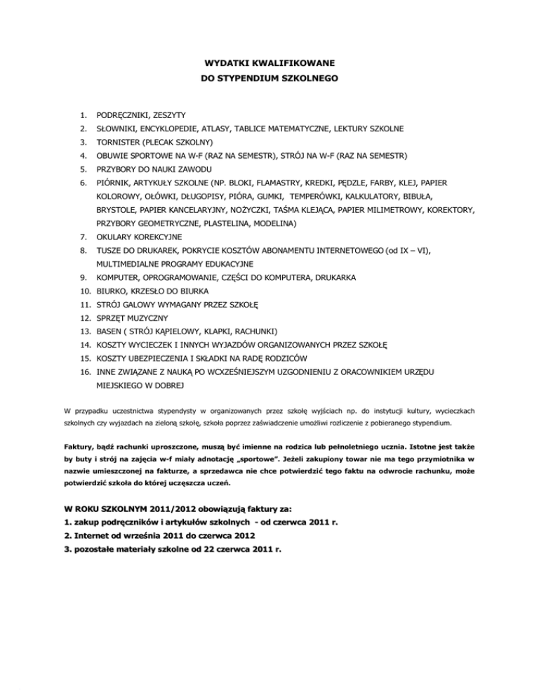 WYDATKI KWALIFIKOWANE DO STYPENDIUM SZKOLNEGO 1. PODRĘCZNIKI, ZESZYTY 2. SŁOWNIKI, ENCYKLOPEDIE, ATLASY, TABLICE MATEMATYCZNE, LEKTURY SZKOLNE 3. TORNISTER (PLECAK SZKOLNY) 4. OBUWIE SPORTOWE NA W-F (RAZ NA SEMESTR), STRÓJ NA W-F (RAZ NA SEMESTR) 5. PRZYBORY DO NAUKI ZAWODU 6. PIÓRNIK, ARTYKUŁY SZKOLNE (NP. BLOKI, FLAMASTRY, KREDKI, PĘDZLE, FARBY, KLEJ, PAPIER KOLOROWY, OŁÓWKI, DŁUGOPISY, PIÓRA, GUMKI, TEMPERÓWKI, KALKULATORY, BIBUŁA, BRYSTOLE, PAPIER KANCELARYJNY, NOŻYCZKI, TAŚMA KLEJĄCA, PAPIER MILIMETROWY, KOREKTORY, PRZYBORY GEOMETRYCZNE, PLASTELINA, MODELINA) 7. OKULARY KOREKCYJNE 8. TUSZE DO DRUKAREK, POKRYCIE KOSZTÓW ABONAMENTU INTERNETOWEGO (od IX – VI), MULTIMEDIALNE PROGRAMY EDUKACYJNE 9. KOMPUTER, OPROGRAMOWANIE, CZĘŚCI DO KOMPUTERA, DRUKARKA 10. BIURKO, KRZESŁO DO BIURKA 11. STRÓJ GALOWY WYMAGANY PRZEZ SZKOŁĘ 12. SPRZĘT MUZYCZNY 13. BASEN ( STRÓJ KĄPIELOWY, KLAPKI, RACHUNKI) 14. KOSZTY WYCIECZEK I INNYCH WYJAZDÓW ORGANIZOWANYCH PRZEZ SZKOŁĘ 15. KOSZTY UBEZPIECZENIA I SKŁADKI NA RADĘ RODZICÓW 16. INNE ZWIĄZANE Z NAUKĄ PO WCXZEŚNIEJSZYM UZGODNIENIU Z ORACOWNIKIEM URZĘDU MIEJSKIEGO W DOBREJ W przypadku uczestnictwa stypendysty w organizowanych przez szkołę wyjściach np. do instytucji kultury, wycieczkach szkolnych czy wyjazdach na zieloną szkołę, szkoła poprzez zaświadczenie umożliwi rozliczenie z pobieranego stypendium. Faktury, bądź rachunki uproszczone, muszą być imienne na rodzica lub pełnoletniego ucznia. Istotne jest także by buty i strój na zajęcia w-f miały adnotację „sportowe”. Jeżeli zakupiony towar nie ma tego przymiotnika w nazwie umieszczonej na fakturze, a sprzedawca nie chce potwierdzić tego faktu na odwrocie rachunku, może potwierdzić szkoła do której uczęszcza uczeń. W ROKU SZKOLNYM 2011/2012 obowiązują faktury za: 1. zakup podręczników i artykułów szkolnych - od czerwca 2011 r. 2. Internet od września 2011 do czerwca 2012 3. pozostałe materiały szkolne od 22 czerwca 2011 r.