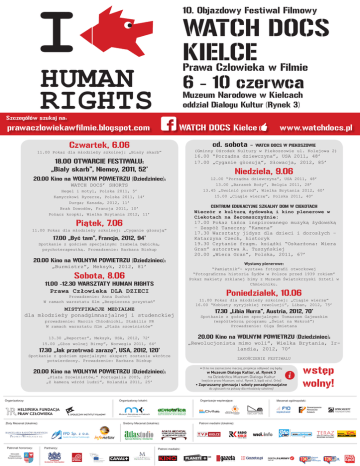 I 10. Objazdowy Festiwal Filmowy WATCH DOCS KIELCE Prawa Człowieka w Filmie HUMAN RIGHTS 6 - 10 czerwca Muzeum Narodowe w Kielcach oddział Dialogu Kultur (Rynek 3) Szczegółów szukaj na: prawaczlowiekawfilmie.blogspot.com WATCH DOCS Kielce Czwartek, 6.06 cd. sobota - WATCH DOCS W PIEKOSZOWIE 11.00 Pokaz dla młodzieży szkolnej: „Biały skarb” 18.00 OTWARCIE FESTIWALU: „Biały skarb”, Niemcy, 2011, 52’ 20.00 Kino na WOLNYM POWIETRZU (Dziedziniec): WATCH DOCS’ SHORTS Hegel i motyl, Polska 2011, 5’ Kamyczkowi Rycerze, Polska 2011, 14’ Durga; Kanada, 2012, 11’ Brak Dowodów, Francja 2011, 10’ Połącz kropki, Wielka Brytania 2012, 11’ (Gminny Ośrodek Kultury w Piekoszowie ul. Kolejowa 2) 16.00 “Porządna dziewczyna”, USA 2011, 48’ 17.00 „Cyganie głosują”, Słowacja, 2012, 85’ Niedziela, 9.06 12.00 “Porządna dziewczyna”, USA 2011, 48’ 13.00 „Baranek Boży”, Belgia 2011, 28’ 13.45 „Uwolnić poród”, Wielka Brytania 2012, 60’ 15.00 „Ciągle wierzę”, Polska 2011, 40’ CENTRUM EDUKACYJNE SZKALNY DOM W CIEKOTACH Piątek, 7.06 11.00 Pokaz dla młodzieży szkolnej: „Cyganie głosują” 17.00 „Być tam”, Francja, 2012, 94’ Spotkanie z gościem specjalnym: Izabelą Dębicką, psychoterapeutką. Prowadzenie: Barbara Biskup 20.00 Kino na WOLNYM POWIETRZU (Dziedziniec): „Burmistrz”, Meksyk, 2012, 81’ Sobota, 8.06 11.00 -12.30 WARSZTATY HUMAN RIGHTS Prawa Człowieka DLA DZIECI Wieczór z kulturą żydowską i kino plenerowe w Ciekotach na Żeromszczyźnie: 17.00 Pokaz tańca inspirowanego muzyką żydowską – Zespół Taneczny “Kamena” 17.30 Warsztaty jidysz dla dzieci i dorosłych – Katarzyna Czech, historyk 19.30 Czytanie fragm. książki “Oskarżona: Wiera Gran” autorstwa A. Tuszyńskiej 20.00 „Wiera Gran”, Polska, 2011, 67’ Wystawy plenerowe: “Pamiętnik”- wystawa fotografii otworkowej “Fotograficzna historia Żydów w Polsce przed 1939 rokiem” Pokaz makiety szklanej bimy z Muzeum Świętokrzyski Sztetl w Chmielniku. Poniedziałek, 10.06 Prowadzenie: Anna Suchoń W ramach warsztatu film „Bezpieczna przystań” MISTYFIKACJE MEDIALNE dla młodzieży ponadgimnazjalnej i studenckiej prowadzenie: Marcin Chłodnicki, Stabilis PR W ramach warsztatu film „Plaża szowinistów” 11.00 Pokaz dla młodzieży szkolnej: „Ciągle wierzę” 16.00 “Kobiety syryjskiej rewolucji”, Liban, 2012, 75’ 17.30 „Libia Hurra”, Austria, 2012, 70’ Spotkanie z gościem specjalnym: Tomaszem Gajewskim (współtwórcą programu „Świat na Wskroś”) Prowadzenie: Olga Śmietana 20.00 Kino na WOLNYM POWIETRZU (Dziedziniec): 13.30 „Reporter”, Meksyk, USA, 2012, 72’ 15.00 „Głos wolnej Birmy”, Norwegia 2011, 64’ 17.30 „Jak przetrwać zarazę”, USA, 2012, 120’ Spotkanie z gościem specjalnym: ekspert zostanie wkrótce potwierdzony. Prowadzenie: Barbara Biskup 20.00 Kino na WOLNYM POWIETRZU (Dziedziniec): „Plaża Szowinistów,” Portugalia 2005, 25’ „Z kamerą wśród ludzi”, Holandia 2011, 25’ „Rewolucjonista mimo woli”, Wielka Brytania, Irlandia, 2012, 70’ ZAKOŃCZENIE FESTIWALU • O ile nie zaznaczono inaczej, projekcje odbywać się będą: w Muzeum Dialogu Kultur, ul. Rynek 3 na Dziedzińcu Muzeum Dialogu Kultur (wejście przez Muzeum, od ul. Rynek 3, bądź od ul. Orlej) • Zapraszamy gimnazja i szkoły ponadgimnazjalne do zgłoszeń na pokazy dla młodzieży szkolnej! Organizatorzy: Organizatorzy lokalni: Złoty Mecenat (lokalnie): Patronat honorowy: Marszałek Województwa Świętokrzyskiego Organizacje wspierające: Srebrny Mecenat (lokalnie): Partnerzy: www.watchdocs.pl Patroni medialni: Patroni medialni (lokalnie): wstęp wolny! Mecenat ogólnopolski: