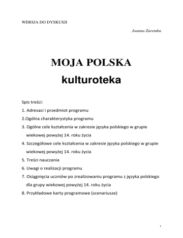 WERSJA DO DYSKUSJI Joanna Zaremba MOJA POLSKA kulturoteka Spis treści: 1. Adresaci i przedmiot programu 2.Ogólna charakterystyka programu 3. Ogólne cele kształcenia w zakresie języka polskiego w grupie wiekowej powyżej 14. roku życia 4. Szczegółowe cele kształcenia w zakresie języka polskiego w grupie wiekowej powyżej 14. roku życia 5. Treści nauczania 6. Uwagi o realizacji programu 7. Osiągnięcia uczniów po zrealizowaniu programu z języka polskiego dla grupy wiekowej powyżej 14. roku życia 8. Przykładowe karty programowe (scenariusze) 1 1. Adresaci i przedmiot programu Program MOJA POLSKA kulturoteka jest przeznaczony dla uczniów powyżej 14. roku życia uczących się szkołach polskich poza granicami kraju. Cele i treści nauczania języka polskiego oraz oczekiwane umiejętności są opisane zgodnie z zawartością Podstawy programowej dla dzieci polskich uczących się za granicą (Ministerstwo Edukacji Narodowej, Warszawa 2009). Program został przygotowany przez ekspertów Ministerstwa Edukacji Narodowej w ramach Projektu współfinansowanego ze środków Europejskiego Funduszu Społecznego Opracowanie i pilotażowe wdrożenie innowacyjnych programów nauczania dla dzieci obywateli polskich przebywających za granicą i był konsultowany z nauczycielami języka polskiego pracującymi w szkołach polskich na obczyźnie. Program przeznaczono dla uczniów powyżej 14. roku życia i objął on treści podstawy programowej dla uczniów znających polski na poziomie średnio zaawansowanym (B) i zaawansowanym (C). Zakładamy, że materiał może być wykorzystany także w nauczaniu młodzieży znającej język polski na poziomie podstawowym (A). Mimo że proponujemy również łatwiejsze zadania lub ćwiczenia, nauczycielowi pozostawiamy decyzję, jakie partie materiału wykorzysta w pracy z uczniami słabo posługującymi się polszczyzną, ponieważ jest bardzo prawdopodobne, że uczniowie ci mogą znacznie różnić się poziomem umiejętności w odniesieniu do poszczególnych sprawności językowych. Na ostatnim etapie edukacji w programie proponujemy zapoznanie ucznia z kulturą współczesną (XX i XXI wieku) oraz składającymi się na kod kulturowy młodego pokolenia Polaków tekstami z czasów dawniejszych (od XVI do XIX stulecia). Tematy dotyczące literatury i innych dziedzin twórczości uzupełniliśmy ćwiczeniami praktycznymi – słuchania i czytania oraz mówienia i pisania, wychodząc z założenia, że najważniejszym celem edukacji jest kształcenie umiejętności posługiwania się językiem. Chcemy pokazać młodym Polakom mieszkającym i uczącym się poza granicami kraju taką Polskę, z jaką codziennie spotykają się ich rówieśnicy żyjący w kraju. Dając im niezbędny zestaw tekstów kultury oraz źródeł informacji (rybę), wyposażamy ich jednocześnie w umiejętności pozwalające na samodzielne zdobywanie i pogłębianie wiedzy o kraju przodków (wędkę). Tytuł programu – MOJA POLSKA kulturoteka – jest zapisem naszego wyobrażenia polskiej półki w pokoju każdego ucznia. Półki, na której stoją polskie książki i płyty oraz 2 segregatory z notatkami, fotografiami i wydrukami. W naszym podręczniku znajdzie się: Moja Biblioteka, Moja Filmoteka, Moja Płytoteka oraz Mój Słownik. Na półce postawimy tymczasem niewielki zbiór na dobry początek, ale mamy nadzieję, że uczniowie wkrótce zgromadzą samodzielnie bogatą kolekcję. 2. Ogólna charakterystyka programu Program „Moja polska kulturoteka” zawiera 180 kart programowych. Przekładają one założenia podstawy programowej na praktykę lekcyjną. Zawierają materiał, który można zrealizować na jednej lub kilku lekcjach, zależnie od czasu, jakim dysponuje nauczyciel. Każda karta zawiera informacje o materiale i metodach nauczania oraz formach sprawdzania wiedzy i umiejętności ucznia. Mając świadomość wszelakiego rodzaju ograniczeń, staraliśmy się przygotować propozycje, które zaspokoją potrzeby nauczycieli pracujących w różnych warunkach. Prezentowane treści można realizować w dowolnej kolejności i w dowolnym czasie. Poetyka półki z tekstami kultury pozwala na sięganie do wybranych pozycji w dowolnym momencie. Staraliśmy się uzupełnić obowiązującą w Polsce podstawę programową o te treści i te teksty, które poznaje polski uczeń w codziennym, także pozaszkolnym kontakcie z kulturą i środkami masowego przekazu. Naszym zamierzeniem było wyposażenie młodego Polaka żyjącego za granicą w wiedzę i umiejętności umożliwiające komunikowanie się ze swoim rówieśnikiem funkcjonującym w ojczyźnie. Dlatego też położyliśmy szczególny nacisk na kulturę współczesną i odczytywanie przeszłości przez teraźniejszość. Założyliśmy, że uczeń uczęszczający do szkoły w kraju pobytu zdobywa wiedzę z zakresu historii i teorii literatury w zakresie wystarczającym do analizy polskich tekstów kultury. Uzupełniamy zatem treści nauczania wyłącznie o te elementy, które stanowią specyfikę naszego dorobku kulturowego. W nauczaniu języka polskiego zwracamy szczególną uwagę na formy wypowiedzi typowe dla polskiej praktyki edukacyjnej. Staramy się, by uczeń miał możliwość uzupełnienia wiedzy zdobytej w szkole kraju pobytu o treści edukacyjne polskiej szkoły na obczyźnie. Niezwykle istotne, tak w kraju, jak i za granicą, jest budowanie więzi pokoleniowej. Zachęcamy zatem w naszym programie do rozmawiania z rodzicami i dziadkami. Proponujemy rozmowy o przeszłości, o Polsce, jaką zapamiętali przodkowie, i o polskiej teraźniejszości, której doświadczają na co dzień, niezależnie od tego, gdzie mieszkają. 3 3. Ogólne cele kształcenia w zakresie języka polskiego w grupie wiekowej powyżej 14. roku życia Cele ogólne: (zadania szkoły i nauczyciela) 1. Kształtowanie tożsamości indywidualnej oraz rozwijanie poczucia związku ze wspólnotą narodową kraju przodków. 2. Zapoznanie z d
