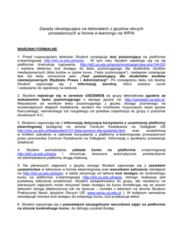Zasady obowiązujące na lektoratach z języków obcych prowadzonych w formie e-learningu na WPiA WARUNKI FORMALNE 1. Przed rozpoczęciem lektoratu Student rozwiązuje test poziomujący na platformie e-learningowej http://el2.us.edu.pl/spnjo . W tym celu Student rejestruje się na tej platformie (instrukcja logowania: http://el2.us.edu.pl/spnjo/mod/page/view.php?id=53) i wybiera właściwy kod dostępu do testu poziomującego dla studentów studiów niestacjonarnych (lista kodów w opisie kursu „Testy poziomujące”), następnie rozwiązuje test lub testy oznaczone jako „Test poziomujący dla studentów studiów niestacjonarnych Wydziału Prawa i Administracji”. Po rozwiązaniu testu lub testów Student zapoznaje się z informacją zwrotną, która zawiera wynik i wskazanie do rejestracji na lektorat. 2. Student rejestruje się w serwisie USOSWEB do grupy lektoratowej zgodnie ze wskazaniem testu poziomującego z danego języka na: http://usosweb.us.edu.pl. Niezależnie od wyników testu poziomującego z języka obcego poznanego na wcześniejszych etapach kształcenia, student ma możliwość rozpoczęcia nauki języka francuskiego, niemieckiego lub rosyjskiego od podstaw (rejestracja do grupy o poziomie docelowym A1). 3. Studenci zapoznają się z informacją dotyczącą korzystania z uczelnianej platformy elearningowej dostępnej na stronie Centrum Kształcenia na Odległość UŚ http://cko.us.edu.pl/faqstudent/101-lista-pomocy-dla-studenta.html oraz uczestniczą w krótkim szkoleniu w zakresie korzystania z platformy e-learningowej prowadzonym przez pracownika Centrum Kształcenia na Odległość. Informację o spotkaniu przekazuje dziekanat. 4. Student samodzielnie zakłada konto na platformie http://el2.us.edu.pl/wpia i otrzymuje stosowne automatyczne od administratora platformy drogą mailową. e-learningowej potwierdzenie 5. Na pierwszych zajęciach z języka obcego Student zapoznaje się z zasadami uczestnictwa w lektoracie w formie elearningowej oraz warunkami zaliczenia (dostępne na http://el2.us.edu.pl/wpia), a także otrzymuje od lektora kod dostępu do konkretnego kursu na platformie e-learningowej http://el2.us.edu.pl/wpia, którego realizacja jest podstawą zaliczenia przedmiotu. Student zarejestrowany do grupy, ale nieobecny na pierwszych zajęciach może otrzymać hasło dostępu do kursu kontaktując się ze swoim lektorem (drogą elektroniczną lub na dyżurze – kontakt z lektorem na stronie Studium Praktycznej Nauki Języków Obcych UŚ: www.spnjo.us.edu.pl ). W kolejnym semestrze obowiązuje również kod dostępu do kolejnego kursu, kod przekazuje lektor. 6. Student zapoznaje się z pozostałymi szczególnymi warunkami zajęć na platformie na stronie konkretnego kursu, do którego uzyskał dostęp. PRACA NA PLATFORMIE 1. Student korzysta z kursu e-learningowego obowiązującego w danym semestrze. Materiał umieszczony na platformie jest podzielony na części, które są dostępne w określonych terminach. W trakcie realizacji materiału na platformie student ma zapewnione wsparcie lektora w różnej formie: synchronicznie, podczas czatów na platformie w wyznaczonym terminie oraz podczas zajęć (plan zajęć na stronie www.wpia.us.edu.pl) i dyżurów (aktualne dyżury lektorów na stronie www.spnjo.us.edu.pl), oraz asynchronicznie korzystając z wewnętrznego komunikatora na platformie „Wiadomości” lub za pomocą poczty elektronicznej (adres poczty w profilu uczestnika kursu na platformie). 2. Wyznaczone przez lektora terminy wykonania zadań lub dostępu do poszczególnych części kursu muszą być przestrzegane. W przypadku studentów, którzy nie zalogują się lub nie wykonają zadań na platformie w wyznaczonych terminach, tracą możliwość zdobycia za nie punktów przed terminem zaliczenia (ostatnie zajęcia w semestrze). W uzasadnionych przypadkach dopuszcza się możliwość nadrobienia zaległości (patrz „Warunki zaliczenia” punkt 4 i 5). 3. Pozostałe warunki uczestnictwa w lektoracie określają Zasady uczestnictwa w lektoracie, dostępne na stronie www.spnjo.us.edu.pl. WARUNKI ZALICZENIA 1. Warunkiem uzyskania zaliczenia jest realizacja kursu e-learningowego, oraz wynik kolokwium zaliczeniowego. 2. Student otrzymuje ocenę pozytywną po uzyskaniu minimum 51% wszystkich punktów za realizację kursu e-learningowego na platformie, a także minimum 51% z kolokwium zaliczeniowego w formie testu końcowego na ostatnich zajęciach. Warunkiem przystąpienia do kolokwium zaliczeniowego jest uzyskanie nie mniej niż 40% punktów za pracę w ramach kursu e-learningowego. Końcową oceną jest średnia arytmetyczna z obu tych składowych. 3. W przypadku uzyskania wyniku na poziomie 40-50% za pracę na platformie dopuszcza się możliwość zaliczania zajęć według szczególnych warunków ustalonych przez lektora. Natomiast osoby, które uzyskały wynik poniżej 40%, muszą zaliczyć dodatkowy kurs e-learningowy (kurs bis) oraz test końcowy w czasie sesji poprawkowej na warunkach określonych w punkcie 4 i 5. 4. Niezrealizowanie lub zrealizowanie kursu e-learningowego poniżej wymaganego minimum 40% za pracę na platformie skutkuje uzyskaniem oceny niedostatecznej z pierwszego terminu zaliczenia. Jednakże na podstawie § 20 p. 4 Regulaminu studiów w UŚ osoba przeprowadzająca weryfikację efektów kształcenia albo dziekan w uzasadnionych przypadkach może przywrócić studentowi termin zaliczenia. 5. Zarówno student, który uzyskał z pierwszego terminu zaliczenia ocenę niedostateczną, jak i korzystający z przywrócenia terminu uczestniczy w dodatkowym kursie e-learningowym (kurs bis), który zostanie otwarty w czasie trwania sesji zaliczeniowej i/lub sesji poprawkowej. Szczegółowy tryb realizacji kursu bis, w tym szczegóły dotyczące dostępu do kursu, określa lektor.