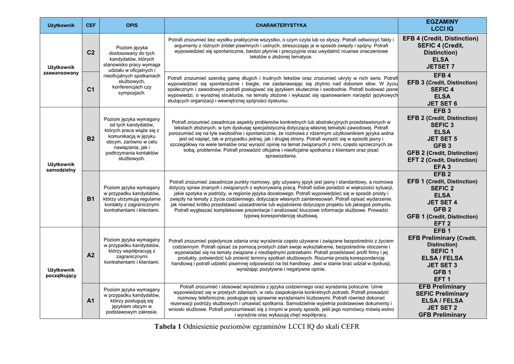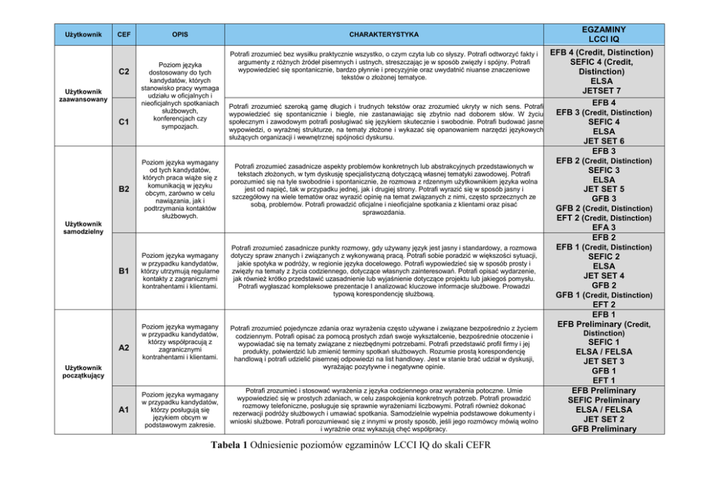 Tabela 1 Odniesienie poziomów egzaminów LCCI IQ do skali CEFR