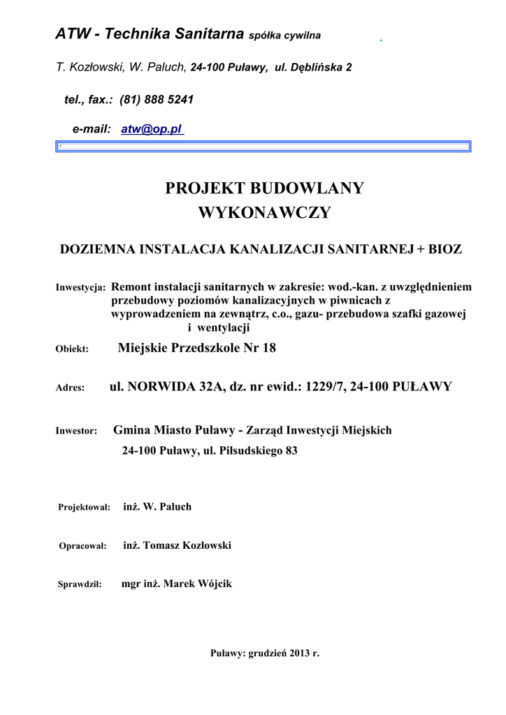 ATW - Technika Sanitarna spółka cywilna T. Kozłowski, W. Paluch, 24-100 Puławy, ul. Dęblińska 2 tel., fax.: (81) 888 5241 e-mail: [email protected] PROJEKT BUDOWLANY WYKONAWCZY DOZIEMNA INSTALACJA KANALIZACJI SANITARNEJ + BIOZ Inwestycja: Remont instalacji sanitarnych w zakresie: wod.-kan. z uwzględnieniem przebudowy poziomów kanalizacyjnych w piwnicach z wyprowadzeniem na zewnątrz, c.o., gazu- przebudowa szafki gazowej i wentylacji Miejskie Przedszkole Nr 18 Obiekt: Adres: ul. NORWIDA 32A, dz. nr ewid.: 1229/7, 24-100 PUŁAWY Inwestor: Gmina Miasto Puławy - Zarząd Inwestycji Miejskich 24-100 Puławy, ul. Piłsudskiego 83 Projektował: inż. W. Paluch Opracował: inż. Tomasz Kozłowski Sprawdził: mgr inż. Marek Wójcik Puławy: grudzień 2013 r. ZAWARTOŚĆ PROJEKTU I. Część opisowa: 1. Opis techniczny 2. Załączniki II. Część rysunkowa: skala: rys. nr: 1. Plan realizacyjny – doziemna inst. kanalizacji sanitarnej 1:500 1/4. 2. Profile doziemnej inst. kanalizacji sanitarnej 2/4. 1:100/100 3. Studnia betonowa Dn 1200 --- 3/4. 4. Studnia inspekcyjna np. Tegra 425 --- 4/4. 2 OPIS TECHNICZNY 1. Przedmiot opracowania Przedmiotem opracowania jest projekt budowlany wykonawczy doziemnej instalacji kanalizacji sanitarnej dla budynku Miejskiego Przedszkola Nr 18 przy ul. C. K. Norwida 32 A, dz. nr ewid: 1229/7 w Puławach. Inwestor przedsięwzięcia: Gmina Miasto Puławy - Zarząd Inwestycji Miejskich 24-100 Puławy, ul. Piłsudskiego 83 2. Podstawa opracowania - Umowa z Inwestorem. - Notatka służbowa z dnia 19.11.2013 r. spisana w MPWiK „Wodociągi Puławskie” Sp. z o.o. W Puławach. - Mapa do celów projektowych w skali 1:500. - Opinia ZUD NR: 813/2013 z dnia 25.11.2013 wydana przez Starostwo Powiatowe w Puławach. - Obowiązujące normy i przepisy. - Inwentaryzacja do celów projektowych. 3. Dane ogólne 3.1. Lokalizacja Budynek Miejskiego Przedszkola Nr 14 zlokalizowany jest na osiedlu „NORWIDA” przy ulicy C.K. NORWIDA 32A, dz. nr ewid.: 1229/7 w Puławach. 3.2. Ogólna charakterystyka budynku Budynek o konstrukcji żelbetowej prefabrykowanej, dwu kondygnacyjny w całości podpiwniczony. Miejskie Przedszkole Nr 18 posiada czynne przyłącza sanitarne: wodociągowe, kanalizacji sanitarnej, kanalizacji deszczowej, gazu n.c., ciepłownicze wysokich parametrów. Budynek wyposażono w następujące instalacje sanitarne: c.o., wod.- kan., c.w., gaz, wentylację, klimatyzację. 3.3. Stan istniejący Budynek przedszkola w wodę do celów socjalnych zaopatrywany jest przyłączem wodociągowym o średnicy 50 mm. Ścieki sanitarne z budynku przedszkola odprowadzane są jednym przewodem odpływowym wykonanym z rur żeliwnych kanalizacyjnych o średnicy Dn 150 mm do studni betonowej o średnicy 1200 mm i rzędnych: 132,11/140,23. Z powyższej studni ścieki odprowadzane są przyłączem (przykanalikiem) o średnicy Dn 150 mm do kolejnej studni o rzędnej 142,67/139,47 znajdującej się przy budynku mieszkanym przy ul. Wojska Polskiego 17. Istniejący przewód odpływowy z budynku przedszkola w złym stanie technicznymi. W przedszkolu wymieniona będzie instalacja wewnętrzna wod.-kan.,c.w. I p.poż. 4. Opis rozwiązań technicznych W związku z remontem kanalizacji sanitarnej w budynku przedszkola zaprojektowano dwa nowe przewody odpływowe: 1. Przewód odpływowy ścieków socjalnych z sanitariatów. 2. Przewód odpływowy ścieków technologicznych z kuchni. Ścieki z obydwu przewodów odpływowych odprowadzane będą do projektowanej studni rewizyjnej, betonowej o średnicy Dn 1200 mm oznaczonej S2 o rzędnych:143,20/141,46. 3 Studnia S2 połączona będzie z istniejącą studnią Si1 o rzędnych:143,11/140,44 za pomocą kaskady zewnętrznej. Wloty kaskady do studni Si1 zaprojektowano o następujących średnicach i rzędnych: - górny: Dz 110 mm, rzędna spodu rury: 141,44 m n.p.m., - dolny: Dz 160 mm, rzędna spodu rury: 140,44 m n.p.m. Istniejący wlot kanalizacji sanitarnej do studni Si1 po wykonaniu nowych należy zabetonować. Przewód odpływowy ścieków socjalnych na odcinku: budynek - studnia S2 o długości L = 7,4 m łącznie z odcinkiem wewnętrznym o długości 0,6 m wykonać z rur kanalizacyjnych PVC-U, SN 8 z litą ścianką o średnicy Dy x e = 160 x 4,7 mm. Przewód odpływowy ścieków technologicznych z kuchni wykonać: na odcinku: budynek - wlot do separatora z rur kanalizacyjnych PVC-U, SN 8 z litą ścianką o średnicy Dy x e = 110 x 3,2 mm o długości L = 1,2 m , na odcinku: wylot z separatora – studnia S2 o długości L = 18,7 m wykonać z rur kanalizacyjnych PVC-U, SN 8 z litą ścianką o średnicy Dy x e = 160 x 4,7 mm. Do studni S2 obydwa przewody wprowadzić o rzędnej o wysokości: 141,65 i zakończyć klapami zwrotnymi skośnymi (montowanymi na bosy koniec rury) o średnicy Dn 160 mm z PEHD wysokiej gęstości które stanowić będą zabezpieczenie przeciw zalewowe. Na przewodzie odpływowym ścieków technologicznych z kuchni zaprojektowano: separator tłuszczu i studnię inspekcyjną z tworzywa o średnicy Dn 425 mm. 4.1. Wyposażenie techniczne doziemnej instalacji kanalizacji sanitarnej 4.1.1. Separator tłuszczu Zaprojektowano separator tłuszczu typ np. STV 031 charakteryzujący się małą szerokością. Charakterystyka techniczna separatora: • przepływ nominalny 3,0 l/s • powierzchnia czynna 0,84 m2 • objętość całkowita 1036 dm3 • objętość osadnika 300 dm3 • objętość magazynowania tłuszczu 120 dm3 • wymiary separatora: długość L=1500 mm, szerokość W=600 mm, wysokość korpusu H=1535 mm, • średnice króćców: wlot/wylot Dn 100 mm • wysokość nadstawki HN=1000 mm • włazy klasy B 125 Korpus separatora wykonany jbędzie ze stali St3S, oczyszczony do stopnia czystości Sa 2,5 i pokryty specjalnymi powłokami antykorozyjnymi które zapewniają długą żywotność. Zastosować można separator równorzędny o podobnej charakterystyce technicznej. Do wentylowania separatora zaprojektowano przewó