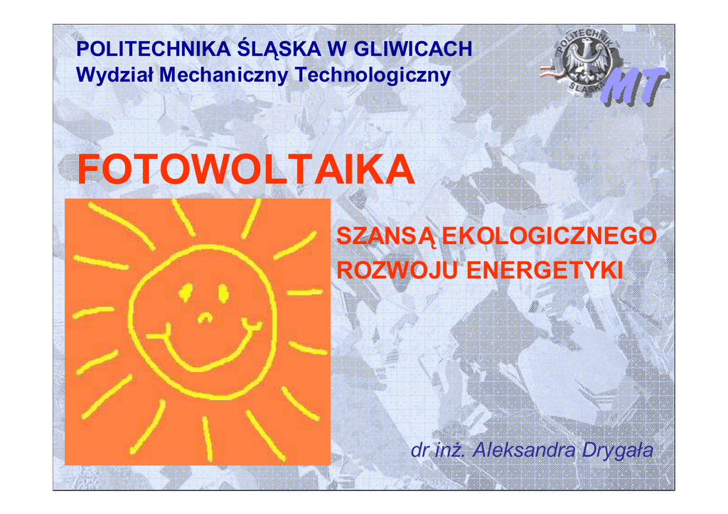POLITECHNIKA ŚLĄSKA W GLIWICACH Wydział Mechaniczny Technologiczny FOTOWOLTAIKA SZANSĄ EKOLOGICZNEGO ROZWOJU ENERGETYKI dr inŜ. Aleksandra Drygała ZANIECZYSZCZENIE ŚRODOWISKA śródło:http://i mages.google.pl/i mages ?hl=pl&lr=&um=1&q=zani ecz yszczenie+rzek&s a=N&start=147&nds p=21 2 KONWENCJONALNE ŹRÓDŁA ENERGII Woda zanieczyszczona prze z ropę naftową i oleje napędowe śródło:http://i mages.google.pl/i mages ?hl=pl&lr=&um=1&s a=1&q=ROPA+NAFTOWA&btnG=Szukaj+obraz%C 3%B3w&aq=f&oq= 3 • • • • • • dwutlenek węgla ozon freon metan podtlenek azotu para wodna GAZY CIEPLARNIANE Źródło: http://images.google.pl/ images?hl=pl&lr=&um=1&sa=1&q=gazy+cieplarniane&aq=f&oq 4 EFEKT CIEPLARNIANY Źródło: http://images.google.pl/images?hl=pl&q=efekt+cieplarniany&lr=&um=1&ie=UTF-8&ei=Y8TtSY6xFMewAaCp9y0Dw&sa=X&oi=image_result_group&resnum=4&ct=title 5 Aleksandra Drygała FOTOWOLTAIKA szansą ekologicznego rozwoju energetyki Najwięksi producenci energii elektrycznej w UE Kraj TWh 1. Niemcy 635,8 2. Francja 571,1 3. Wielka Brytania 398,7 4. Hiszpania 302,7 5. Włochy 315 6. Polska 161,9 7. Szwecja 144,3 8. Norwegia 121,7 9. Holandia 98,6 10. Belgia i Luksemburg 92,8 11. Czechy 84,3 12. Grecja 65,6 13. Austria 63,4 14. Rumunia 62,2 15. Portugalia 53,0 16. Dania 45,6 Najwięksi producenci energii elektrycznej w Europie poza UE Kraj TWh 1. Rosja 992,5 2. Ukraina 192,1 3. Turcja 176,0 Najwięksi producenci energii elektrycznej na świecie Kraj TWh 1. USA 4254 2. Chiny 2834,4 3. Japonia 1150,3 4. Rosja 992,5 5. Indie 726,7 Źródło: " Energia Gigawat" - lipiec 2007 6 FOTOWOLTAIKA szansą ekologicznego rozwoju energetyki Aleksandra Drygała Światowe zasoby paliw pierwotnych [lata] węgiel brunatny węgiel kamienny gaz ziemny ropa narftowa 0 Źródło: "Energetyka Cieplna i Zawodowa" - nr 3/2008) 50 100 150 200 250 300 350 7 Od źródeł energii zaleŜy Ŝycie na Ziemi i poziom rozwoju cywilizacji. Źródło: http://images .google.pl/images?hl=pl&lr=&um=1&sa=1&q=odnawi alne+%C5%BAr%C3% B3d%C5% 82a+energii&aq=0&oq=odnawialne 8 Aleksandra Drygała FOTOWOLTAIKA szansą ekologicznego rozwoju energetyki Produkcja energii elektrycznej Olej 10% 9 Aleksandra Drygała FOTOWOLTAIKA szansą ekologicznego rozwoju energetyki Produkcja energii elektrycznej z odnawialnych źródeł energii w Polsce 3% 2% 1% 34% 60% węgiel kamienny węgiel brunatny gaz Odnawialne Źródła Energii elektrownie szczytowo-pompowe 10 Aleksandra Drygała FOTOWOLTAIKA szansą ekologicznego rozwoju energetyki SŁOŃCE 11 Aleksandra Drygała FOTOWOLTAIKA szansą ekologicznego rozwoju energetyki Energia promieniowania słonecznego ENERGIA WIĄZAŃ CHEMICZNYCH CIEPŁO ENERGIA ELEKTRYCZNA 12 Aleksandra Drygała FOTOWOLTAIKA szansą ekologicznego rozwoju energetyki FOTOWOLTAIKA Energia promieniowania słonecznego Ogniwo fotowoltaiczne Energia elektryczna 13 Aleksandra Drygała FOTOWOLTAIKA szansą ekologicznego rozwoju energetyki HISTORIA FOTOWOLTAIKI IV w. pne po raz pierwszy uŜyto szkła powiększającego do rozniecenia ognia; III w. pne Grecja, Rzym – uŜywanie luster do rozpalania pochodni w obrzędach religijnych; 212r. pne zogniskowanie promieni słonecznych przez Archimedesa; wykorzystanie zwierciadeł z brązu; I-IV w. ne budowa łaźni rzymskich z oknami wychodzącymi na południe; IV w. ne „słoneczne pokoje” w prywatnych domach 1839r. obserwacja zjawiska fotoelektrycznego przez Francuza Edmunda Becquerela 1843r. pierwsze ogniwo słoneczne cynowo-selenowe wytworzone przez Fritts’a; 1918r. hodowla kryształów krzemowych metodą Czochralskiego; 1954r. odkrycie krzemowego ogniwa fotowoltaicznego przez D.Chapina, C. Fullera, G. Pearsona o sprawności wynoszącej 6%; 14 Aleksandra Drygała FOTOWOLTAIKA szansą ekologicznego rozwoju energetyki 15 Aleksandra Drygała FOTOWOLTAIKA szansą ekologicznego rozwoju energetyki Planowany udział procentowy energii elektrycznej wytworzonej z wykorzystaniem odnawialnych źródeł energii w całkowitym krajowym zuŜyciu energii elektrycznej Rok Udział energii elektrycznej z OZE, % 2001 1,9 2002 2,0 2003 2,2 2004 2,3 2005 2,5 2006 3,0 2007 3,9 2008 5,0 2009 6,2 2010 7,5 16 Aleksandra Drygała FOTOWOLTAIKA szansą ekologicznego rozwoju energetyki Koszt energii elektrycznej wytworzonej z wykorzystaniem ogniw słonecznych Wraz z postępem technologii i wzrostem produkcji ogniw słonecznych spadają ceny energii . W roku 1970 cena 1 kWh energii z paneli słonecznych wynosiła 8 dolarów, w roku 2001 było to juŜ 40 centów, a w 2007 cena spadła do poziomu 20-25 centów. 17 Aleksandra Drygała FOTOWOLTAIKA szansą ekologicznego rozwoju energetyki 18 Aleksandra Drygała FOTOWOLTAIKA szansą ekologicznego rozwoju energetyki Podział ogniw słonecznych ze względu na rodzaj zastosowanego materiału bazowego 19 Aleksandra Drygała FOTOWOLTAIKA szansą ekologicznego rozwoju energetyki Krzem wytwarza się w trzech róŜnych postaciach: • monokrystalicznej, • polikrystalicznej, • amorficznej. a) b) c) Budowa sieci: a) krystalicznej monokryształu, b) krystalicznej polikryształu, c) ciała amorficznego 20 Aleksandra Drygała FOTOWOLTAIKA szansą ekologicznego rozwoju energetyki Krzem polikrystaliczny 21 Aleksandra Drygała FOTOWOLTAIKA szansą ekologicznego rozwoju energetyki Budowa ogniw słonecznych 22 Aleksandra Drygała FOTOWOLTAIKA szansą ekologicznego rozwoju energetyki Przednia i tylna powierzchnia ogniwa słonecznego 23 Aleksandra Drygała FOTOWOLTAIKA szansą ekologicznego rozwoju energetyki Jedno ogniwo słoneczne, zaleŜnie od jego typu i warunków pracy, moŜe osiągnąć moc w granicach 1÷1,5 W. W praktycznych zastosowaniach potrzebne są wyŜsze napięcia i moce. Dzięki temu, Ŝe ogniwa są źródłem prądu stałego, moŜliwe jest ich łączenie na trzy sposoby: • szeregowo, • równolegle, • szeregowo-równolegle. 24 Aleksandra Drygała FOTOWOLTAIKA szansą ekologicznego rozwoju energetyki Połączenie szeregowe ogniw słonecznych Połączenie szereg