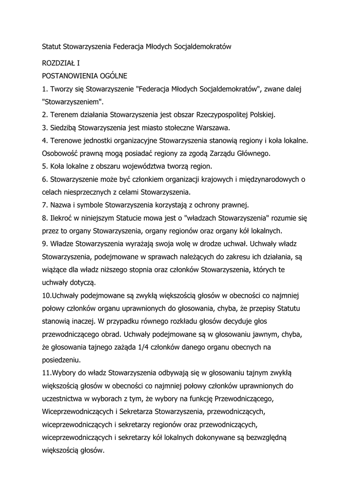 Statut Stowarzyszenia Federacja Młodych Socjaldemokratów ROZDZIAŁ I POSTANOWIENIA OGÓLNE 1. Tworzy się Stowarzyszenie "Federacja Młodych Socjaldemokratów", zwane dalej "Stowarzyszeniem". 2. Terenem działania Stowarzyszenia jest obszar Rzeczypospolitej Polskiej. 3. Siedzibą Stowarzyszenia jest miasto stołeczne Warszawa. 4. Terenowe jednostki organizacyjne Stowarzyszenia stanowią regiony i koła lokalne. Osobowość prawną mogą posiadać regiony za zgodą Zarządu Głównego. 5. Koła lokalne z obszaru województwa tworzą region. 6. Stowarzyszenie może być członkiem organizacji krajowych i międzynarodowych o celach niesprzecznych z celami Stowarzyszenia. 7. Nazwa i symbole Stowarzyszenia korzystają z ochrony prawnej. 8. Ilekroć w niniejszym Statucie mowa jest o "władzach Stowarzyszenia" rozumie się przez to organy Stowarzyszenia, organy regionów oraz organy kół lokalnych. 9. Władze Stowarzyszenia wyrażają swoja wolę w drodze uchwał. Uchwały władz Stowarzyszenia, podejmowane w sprawach należących do zakresu ich działania, są wiążące dla władz niższego stopnia oraz członków Stowarzyszenia, których te uchwały dotyczą. 10.Uchwały podejmowane są zwykłą większością głosów w obecności co najmniej połowy członków organu uprawnionych do głosowania, chyba, że przepisy Statutu stanowią inaczej. W przypadku równego rozkładu głosów decyduje głos przewodniczącego obrad. Uchwały podejmowane są w głosowaniu jawnym, chyba, że głosowania tajnego zażąda 1/4 członków danego organu obecnych na posiedzeniu. 11.Wybory do władz Stowarzyszenia odbywają się w głosowaniu tajnym zwykłą większością głosów w obecności co najmniej połowy członków uprawnionych do uczestnictwa w wyborach z tym, że wybory na funkcję Przewodniczącego, Wiceprzewodniczących i Sekretarza Stowarzyszenia, przewodniczących, wiceprzewodniczących i sekretarzy regionów oraz przewodniczących, wiceprzewodniczących i sekretarzy kół lokalnych dokonywane są bezwzględną większością głosów. 12.Do wyborów uzupełniających do władz Stowarzyszenia pkt. 11 Statutu stosuje się odpowiednio. 13.Członkowie władz Stowarzyszenia mogą być odwołani przez organ, który dokonał ich wyboru lub powołania. Wniosek o odwołanie może być zgłoszony przez co najmniej 1/3 statutowego składu organu lub przez jego przewodniczącego. Odwołanie członków władz następuje w głosowaniu tajnym bezwzględną większością głosów, w obecności co najmniej połowy uprawnionych. Odwołanie z funkcji delegata na Zjazd Delegatów lub zjazd regionalny jest niedopuszczalne. 14.Nie można być jednocześnie członkiem organu uchwałodawczego, rewizyjnego lub sądowego tego samego szczebla. 15.Kadencja członków władz Stowarzyszenia trwa od dnia wyboru do dnia wyboru członków następnej kadencji. ROZDZIAŁ II CELE STOWARZYSZENIA I SPOSOBY ICH REALIZACJI 16.Celami Stowarzyszenia są: a. propagowanie wśród młodzieży idei socjaldemokratycznych, wolności, równości i sprawiedliwości społecznej, b. działanie na rzecz zwiększenia udziału ludzi młodych w życiu publicznym, c. pomoc w zdobywaniu wiedzy i kwalifikacji umożliwiających ludziom młodym spełnianie funkcji społecznych i zawodowych w społeczeństwie, d. upowszechnianie postaw proeuropejskich wśród ludzi młodych, e. inspirowanie młodych do podejmowania działalności gospodarczej i promocja przedsiębiorczości, f. ułatwianie młodym kontaktów z instytucjami i organizacjami międzynarodowymi, g. promocja kultury, w szczególności tworzonej przez ludzi młodych i do nich adresowanej, h. ochrona praw człowieka, i. propagowanie idei samorządności wśród ludzi młodych, j. promocja ekologii i ochrony środowiska, k. promocja kultury fizycznej, sportu i turystyki, szczególnie wśród ludzi młodych, 17.Stowarzyszenie realizuje swoje cele w szczególności poprzez: a. organizowanie spotkań, szkoleń, seminariów oraz innych form poszerzania wiedzy służących promocji programu Stowarzyszenia; b. gromadzenie środków finansowych na cele statutowe stowarzyszenia; c. aktywne uczestnictwo w życiu publicznym RP, we współpracy z organizacjami realizującymi zbliżone cele; d. prowadzenie działalności wydawniczej; e. organizację wymiany międzynarodowej ludzi młodych; f. współpracę i uczestnictwo w organizacjach krajowych, zagranicznych i międzynarodowych; g. promocję młodych, wykwalifikowanych kadr wśród instytucji i osób zainteresowanych tworzeniem socjaldemokratycznego porządku państwa; h. podejmowanie inicjatyw mających na celu ochronę i propagowanie praw człowieka i obywatela. ROZDZIAŁ III CZŁONKOWIE, ICH PRAWA I OBOWIĄZKI 18.Członkami Stowarzyszenia są: a. członkowie zwyczajni, b. członkowie wspierający, c. członkowie honorowi, 19.Członkami Stowarzyszenia mogą być obywatele Rzeczypospolitej Polskiej i cudzoziemcy. 20.Członkiem zwyczajnym Stowarzyszenia może być osoba w wieku od 16 do 30 lat. 21.Przyjęcie członka zwyczajnego do Stowarzyszenia następuje po złożeniu prawidłowo wypełnionej i podpisanej deklaracji członkowskiej oraz rekomendacji pisemnej co najmniej jednego członka. Uchwałę w sprawie przyjęcia w poczet członków podejmuje zarząd właściwego koła lokalnego w terminie miesiąca od złożenia deklaracji. Brak podjęcia uchwały uznaje się za zgodę ws. przyjęcia w poczet członków. Decyzja odmawiająca przyjęcia w poczet członków Stowarzyszenia musi zawierać adnotację o możliwości odwołania się do zarządu regionu. 22.Od uchwały zarządu koła lokalnego odmawiającej przyjęcia w poczet członków przysługuje odwołanie do zarządu regionu w terminie 14 dni od doręczenia decyzji zarządu koła lokalnego. Odwołanie to musi być rozpatrzone w ciągu miesiąca od dnia jego złożenia. 23.Uchwałę w sprawie przyjęcia nowych członków tworzących nowe koło lokalne podejmuje zarząd regionu. 24.Członkiem wspie