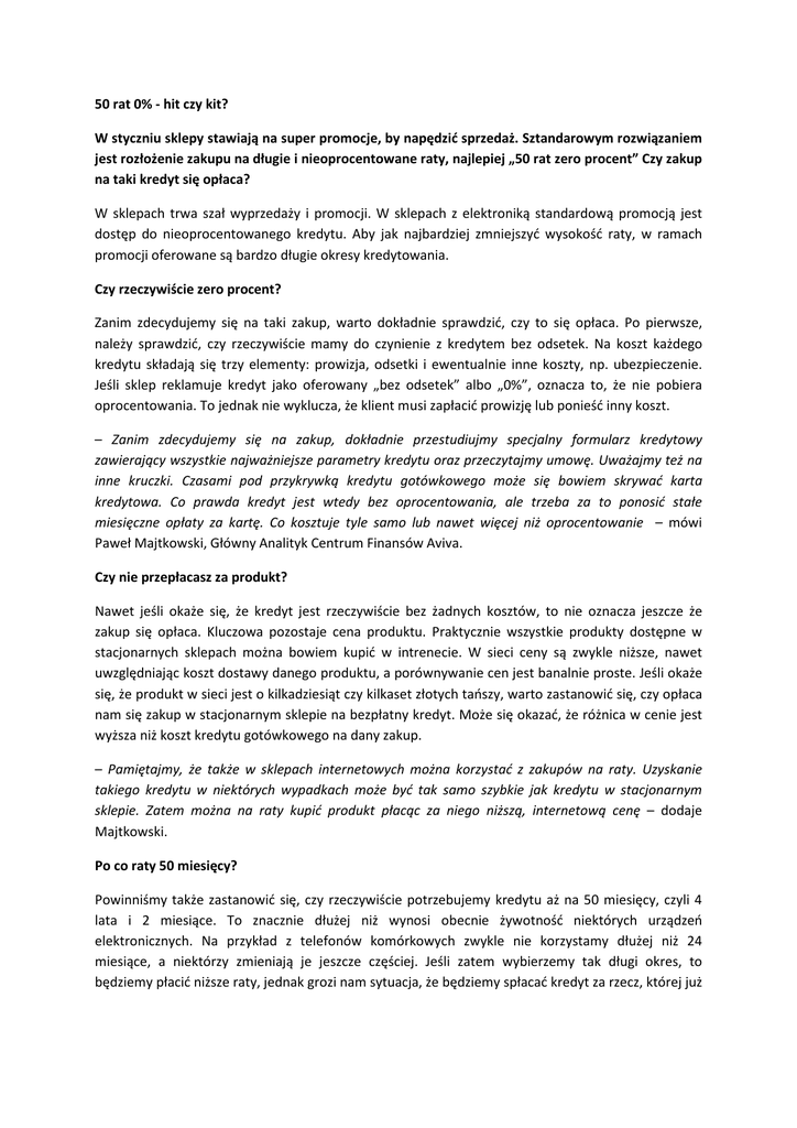 50 rat 0% - hit czy kit? W styczniu sklepy stawiają na super promocje, by napędzić sprzedaż. Sztandarowym rozwiązaniem jest rozłożenie zakupu na długie i nieoprocentowane raty, najlepiej „50 rat zero procent” Czy zakup na taki kredyt się opłaca? W sklepach trwa szał wyprzedaży i promocji. W sklepach z elektroniką standardową promocją jest dostęp do nieoprocentowanego kredytu. Aby jak najbardziej zmniejszyć wysokość raty, w ramach promocji oferowane są bardzo długie okresy kredytowania. Czy rzeczywiście zero procent? Zanim zdecydujemy się na taki zakup, warto dokładnie sprawdzić, czy to się opłaca. Po pierwsze, należy sprawdzić, czy rzeczywiście mamy do czynienie z kredytem bez odsetek. Na koszt każdego kredytu składają się trzy elementy: prowizja, odsetki i ewentualnie inne koszty, np. ubezpieczenie. Jeśli sklep reklamuje kredyt jako oferowany „bez odsetek” albo „0%”, oznacza to, że nie pobiera oprocentowania. To jednak nie wyklucza, że klient musi zapłacić prowizję lub ponieść inny koszt. – Zanim zdecydujemy się na zakup, dokładnie przestudiujmy specjalny formularz kredytowy zawierający wszystkie najważniejsze parametry kredytu oraz przeczytajmy umowę. Uważajmy też na inne kruczki. Czasami pod przykrywką kredytu gotówkowego może się bowiem skrywać karta kredytowa. Co prawda kredyt jest wtedy bez oprocentowania, ale trzeba za to ponosić stałe miesięczne opłaty za kartę. Co kosztuje tyle samo lub nawet więcej niż oprocentowanie – mówi Paweł Majtkowski, Główny Analityk Centrum Finansów Aviva. Czy nie przepłacasz za produkt? Nawet jeśli okaże się, że kredyt jest rzeczywiście bez żadnych kosztów, to nie oznacza jeszcze że zakup się opłaca. Kluczowa pozostaje cena produktu. Praktycznie wszystkie produkty dostępne w stacjonarnych sklepach można bowiem kupić w intrenecie. W sieci ceny są zwykle niższe, nawet uwzględniając koszt dostawy danego produktu, a porównywanie cen jest banalnie proste. Jeśli okaże się, że produkt w sieci jest o kilkadziesiąt czy kilkaset złotych tańszy, warto zastanowić się, czy opłaca nam się zakup w stacjonarnym sklepie na bezpłatny kredyt. Może się okazać, że różnica w cenie jest wyższa niż koszt kredytu gotówkowego na dany zakup. – Pamiętajmy, że także w sklepach internetowych można korzystać z zakupów na raty. Uzyskanie takiego kredytu w niektórych wypadkach może być tak samo szybkie jak kredytu w stacjonarnym sklepie. Zatem można na raty kupić produkt płacąc za niego niższą, internetową cenę – dodaje Majtkowski. Po co raty 50 miesięcy? Powinniśmy także zastanowić się, czy rzeczywiście potrzebujemy kredytu aż na 50 miesięcy, czyli 4 lata i 2 miesiące. To znacznie dłużej niż wynosi obecnie żywotność niektórych urządzeń elektronicznych. Na przykład z telefonów komórkowych zwykle nie korzystamy dłużej niż 24 miesiące, a niektórzy zmieniają je jeszcze częściej. Jeśli zatem wybierzemy tak długi okres, to będziemy płacić niższe raty, jednak grozi nam sytuacja, że będziemy spłacać kredyt za rzecz, której już nie mamy lub przestała działać. Nawet zatem jeśli wybieramy kredyt na 50 rat, lepiej spłacić go w krótszym czasie dostosowanym do żywotności. Czy naprawdę potrzebujesz danej rzeczy? I na koniec zawsze warto dokładnie zastanowić się, czy potrzebujemy rzeczy, którą chcemy kupić na kredyt. Przy okazji promocji szczególnie często podejmujemy decyzje pod wpływem impulsu. Warto unikać takich sytuacji, a na podjęcie decyzji o zakupie i zadłużeniu się dać sobie trochę więcej czasu.