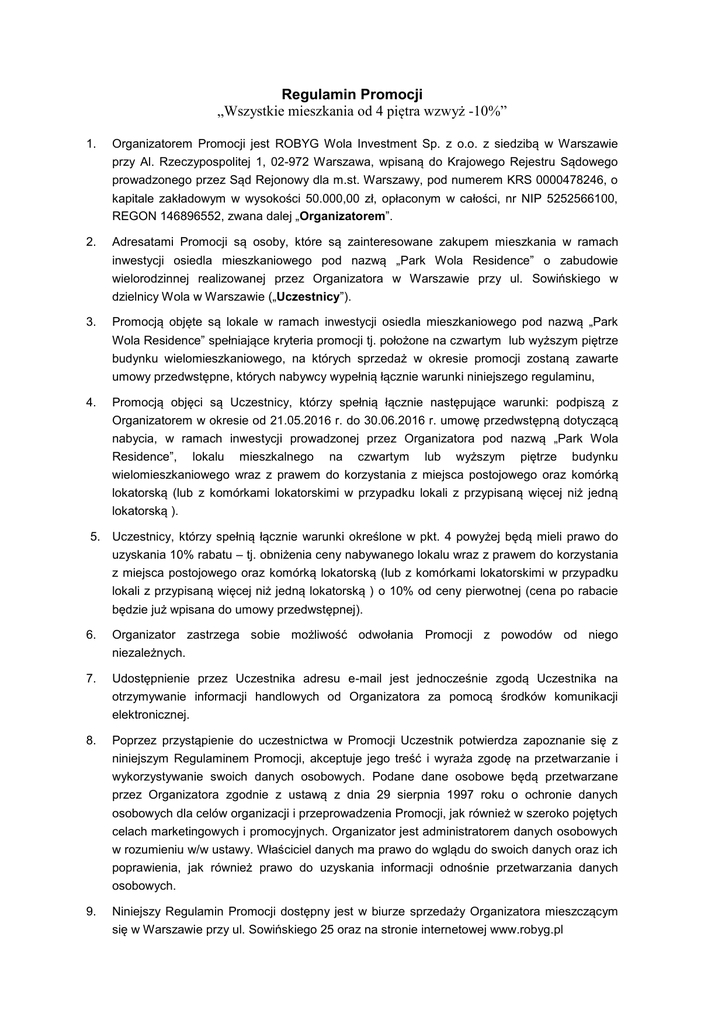 Regulamin Promocji „Wszystkie mieszkania od 4 piętra wzwyż -10%” 1. Organizatorem Promocji jest ROBYG Wola Investment Sp. z o.o. z siedzibą w Warszawie przy Al. Rzeczypospolitej 1, 02-972 Warszawa, wpisaną do Krajowego Rejestru Sądowego prowadzonego przez Sąd Rejonowy dla m.st. Warszawy, pod numerem KRS 0000478246, o kapitale zakładowym w wysokości 50.000,00 zł, opłaconym w całości, nr NIP 5252566100, REGON 146896552, zwana dalej „Organizatorem”. 2. Adresatami Promocji są osoby, które są zainteresowane zakupem mieszkania w ramach inwestycji osiedla mieszkaniowego pod nazwą „Park Wola Residence” o zabudowie wielorodzinnej realizowanej przez Organizatora w Warszawie przy ul. Sowińskiego w dzielnicy Wola w Warszawie („Uczestnicy”). 3. Promocją objęte są lokale w ramach inwestycji osiedla mieszkaniowego pod nazwą „Park Wola Residence” spełniające kryteria promocji tj. położone na czwartym lub wyższym piętrze budynku wielomieszkaniowego, na których sprzedaż w okresie promocji zostaną zawarte umowy przedwstępne, których nabywcy wypełnią łącznie warunki niniejszego regulaminu, 4. Promocją objęci są Uczestnicy, którzy spełnią łącznie następujące warunki: podpiszą z Organizatorem w okresie od 21.05.2016 r. do 30.06.2016 r. umowę przedwstępną dotyczącą nabycia, w ramach inwestycji prowadzonej przez Organizatora pod nazwą „Park Wola Residence”, lokalu mieszkalnego na czwartym lub wyższym piętrze budynku wielomieszkaniowego wraz z prawem do korzystania z miejsca postojowego oraz komórką lokatorską (lub z komórkami lokatorskimi w przypadku lokali z przypisaną więcej niż jedną lokatorską ). 5. Uczestnicy, którzy spełnią łącznie warunki określone w pkt. 4 powyżej będą mieli prawo do uzyskania 10% rabatu – tj. obniżenia ceny nabywanego lokalu wraz z prawem do korzystania z miejsca postojowego oraz komórką lokatorską (lub z komórkami lokatorskimi w przypadku lokali z przypisaną więcej niż jedną lokatorską ) o 10% od ceny pierwotnej (cena po rabacie będzie już wpisana do umowy przedwstępnej). 6. Organizator zastrzega sobie możliwość odwołania Promocji z powodów od niego niezależnych. 7. Udostępnienie przez Uczestnika adresu e-mail jest jednocześnie zgodą Uczestnika na otrzymywanie informacji handlowych od Organizatora za pomocą środków komunikacji elektronicznej. 8. Poprzez przystąpienie do uczestnictwa w Promocji Uczestnik potwierdza zapoznanie się z niniejszym Regulaminem Promocji, akceptuje jego treść i wyraża zgodę na przetwarzanie i wykorzystywanie swoich danych osobowych. Podane dane osobowe będą przetwarzane przez Organizatora zgodnie z ustawą z dnia 29 sierpnia 1997 roku o ochronie danych osobowych dla celów organizacji i przeprowadzenia Promocji, jak również w szeroko pojętych celach marketingowych i promocyjnych. Organizator jest administratorem danych osobowych w rozumieniu w/w ustawy. Właściciel danych ma prawo do wglądu do swoich danych oraz ich poprawienia, jak również prawo do uzyskania informacji odnośnie przetwarzania danych osobowych. 9. Niniejszy Regulamin Promocji dostępny jest w biurze sprzedaży Organizatora mieszczącym się w Warszawie przy ul. Sowińskiego 25 oraz na stronie internetowej www.robyg.pl 10. Wszelkie reklamacje dotyczące Promocji powinny być zgłoszone w formie pisemnej wraz z uzasadnieniem na adres: Al. Rzeczypospolitej 1 Warszawa 02-972 Warszawa w terminie do 23 grudnia 2016 roku. 11. Organizator zobowiązany jest rozpatrzyć reklamację w terminie 14 dni od daty jej otrzymania. 12. Reklamacja sprzeczna z niniejszym Regulaminem Promocji, w szczególności z pkt. 10 podlega odrzuceniu. 13. Wszelkie spory powstałe na tle Promocji będą rozpatrywane przez właściwy sąd powszechny. 14. Promocja nie dotyczy obecnych pracowników i współpracowników Organizatora. 15. Promocja objęta niniejszym regulaminem nie łączy się z innymi promocjami przeprowadzanymi przez Organizatora i spółki z grupy ROBYG. Udział w promocji jest dobrowolny.