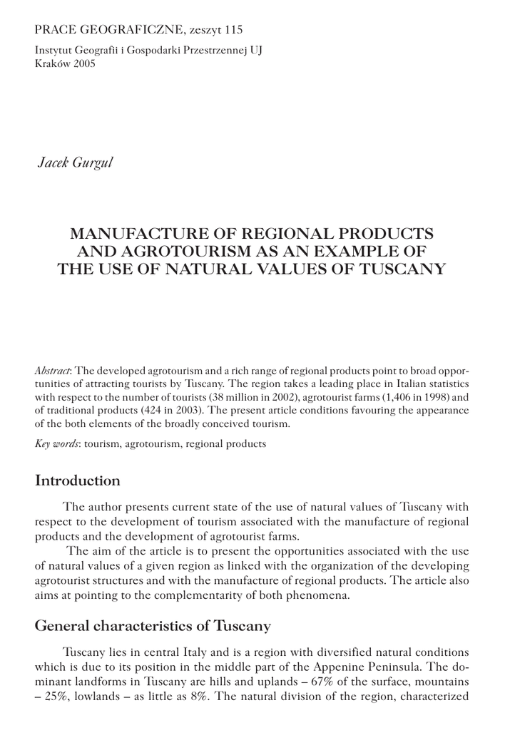 PRACE GEOGRAFICZNE, zeszyt 115 Instytut Geografii i Gospodarki Przestrzennej UJ Kraków 2005 Jacek Gurgul MANUFACTURE OF REGIONAL PRODUCTS AND AGROTOURISM AS AN EXAMPLE OF THE USE OF NATURAL VALUES OF TUSCANY Abstract: The developed agrotourism and a rich range of regional products point to broad opportunities of attracting tourists by Tuscany. The region takes a leading place in Italian statistics with respect to the number of tourists (38 million in 2002), agrotourist farms (1,406 in 1998) and of traditional products (424 in 2003). The present article conditions favouring the appearance of the both elements of the broadly conceived tourism. Key words: tourism, agrotourism, regional products Introduction The author presents current state of the use of natural values of Tuscany with respect to the development of tourism associated with the manufacture of regional products and the development of agrotourist farms. The aim of the article is to present the opportunities associated with the use of natural values of a given region as linked with the organization of the developing agrotourist structures and with the manufacture of regional products. The article also aims at pointing to the complementarity of both phenomena. General characteristics of Tuscany Tuscany lies in central Italy and is a region with diversified natural conditions which is due to its position in the middle part of the Appenine Peninsula. The dominant landforms in Tuscany are hills and uplands – 67% of the surface, mountains – 25%, lowlands – as little as 8%. The natural division of the region, characterized 116 PRACE GEOGRAFICZNE, ZESZYT 115 by the predominance of hills and uplands in the south of the region, of lowlands in central-western part of the region and of mountains in the north, involves different conditions for the development of agriculture and tourism. Tuscany lies within the reach of Mediterranean climate. The region displays a natural cover in the form of mountains in the north which protect it against cold northerly winds. The influence of the sea is smoothed by winter periods. The precipitation in Tuscany is lowest in the whole region of the Tyrrhenian Sea and differs depending on the terrain; some 1,500 mm per year in the Appenines and some 600 mm in the south-west of the region. The region displays precipitation regime of Mediterranean type with a maximum of precipitation in the period of autumn-winter and a minimum in summer months (Barbieri 1972). Tuscany is marked by an unrepeatable and unique landscape. It includes hills covered by broad-leaved trees, meadows with strong shade of green and the alleys of cypress trees along the roads leading to few properties located on the hills. The landscape adds to the development of tourism and in particular of agrotourism. Agrotourism Agrotourism conceived as a payable sojourn, offered by an agricultural farm, began to appear in the Tuscany region in the 1960s when the first symptoms of tourist interest in farm accommodation had been recorded. In Tuscany as in the whole Italy the phenomenon of agrotourism appeared with some delay. In 1965 a National Association of Agriculture and Tourism (Associazione Nazionale Agricoltura e Turismo) was created but it was only in the period of 1965-1975, called the “decade of experimentation” in the field of agrotourism, that this sector could develop. It was then in 1978, that the above-mentioned association took the name of Agriturist (Telleschi 1992). The 1980s were a flowering period of the agrotourist activities in Italy. Agrotourism, according to the Act nr 730 of December 5th 1985 of the Italian Republic is meant exclusively as “activities consisting in the reception of persons and the provision of lodgings by farmers and their family members who employ for this purpose their own farm where agrotourist activities are performed according to the principle of complementarity with respect to arable farming, forestry or cattle raising, which must remain however chief activities with respect to agrotourism”. This means that the income from agrotourism as well as the time devoted to carry out such activities must be lesser than the income from agriculture itself and from the time spent on farming works. In the framework of agrotourist activities it is possible to distinguish periodical provision of lodgings in open spaces e.g. on campings, offering food services based on produce from one’s own farm as well as organizating reacreational and cultural activities within one’s own farm. These activities predominantly met the demand for alien tourists who visited Tuscan villages. Tuscany owing to its history, orography and the culture of hospitality was capable of creating good conditions for the development of agrotourism. Also its landscape, rural architecture and interesting traditions have their own contribution. Agrotourism in Tuscany became the basic element of the development of farming and tourism in MANUFACTURE OF REGIONAL PRODUCTS AND AGROTOURISM AS AN EXAMPLE.. 117 rural regions. The development of that activity is regulated by the regional act No 730/85. The act is implemented by regional programmes such as Regional Development Programme. The principle assumptions of the programme relate to: promotion of social integration, favouring the combining of income from many sources of earning for those living in the country and facilitating the development of enterprise among young people. Agrotourism plays a significant part in the protection of landscape and in consolidating human presence in rural areas considered as marginal and in most cases “hostile” to farming activities. Agrotourism is also appreciated for its role in the encouraging a renewed use of village buildings, frequently degraded owing to which the buildings become revitalized and are used according to their basic function. The renewed buildings, to be found in the unpopulated areas or far from other buildings, become a driving force of