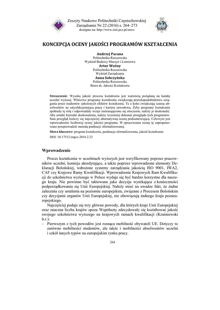 Andrzej Pacana, Artur Woźny,Częstochowskiej Anna Sobczyńska Zeszyty Naukowe Politechniki Zarządzanie Nr 22 (2016) s. 264–273 dostępne na: http://www.zim.pcz.pl/znwz KONCEPCJA OCENY JAKOŚCI PROGRAMÓW KSZTAŁCENIA Andrzej Pacana Politechnika Rzeszowska Wydział Budowy Maszyn i Lotnictwa Artur Woźny Politechnika Rzeszowska Wydział Zarządzania Anna Sobczyńska Politechnika Rzeszowska Biuro ds. Jakości Kształcenia Streszczenie: Wysoka jakość procesu kształcenia jest wartością pożądaną na każdej uczelni wyższej. Właściwe programy kształcenia zwiększają prawdopodobieństwo osiągania przez studentów założonych efektów kształcenia. Te z kolei zwiększają szansę absolwentów na satysfakcjonującą pracę i karierę zawodową. Żeby programy kształcenia spełniały tę rolę i odpowiadały wciąż zmieniającemu się otoczeniu, należy je doskonalić. Aby ustalić kierunki doskonalenia, należy wcześniej dokonać przeglądu tych programów. Sam przegląd kończy się najczęściej alternatywną oceną podsumowującą. Celowym jest wprowadzenie liczbowej oceny jakości programu. W opracowaniu ocenę tę zaproponowano przeprowadzić metodą punktacji sformalizowanej. Słowa kluczowe: program kształcenia, punktacja sformalizowana, jakość kształcenia DOI: 10.17512/znpcz.2016.2.23 Wprowadzenie Proces kształcenia w uczelniach wyższych jest weryfikowany poprzez pracowników uczelni, komisje akredytujące, a także poprzez wprowadzone elementy Deklaracji Bolońskiej, wdrożone systemy zarządzania jakością ISO 9001, IWA2, CAF czy Krajowe Ramy Kwalifikacji. Wprowadzenie Krajowych Ram Kwalifikacji do szkolnictwa wyższego w Polsce wydaje się być bardzo korzystne dla naszego kraju. Nie powinno być taktowane jako decyzja wynikająca z konieczności podporządkowania się Unii Europejskiej. Należy mieć na uwadze fakt, że żadne zalecenia czy ustalenia na poziomie europejskim, związane z Procesem Bolońskim czy decyzjami organów Unii Europejskiej, nie obowiązują żadnego kraju pozaeuropejskiego. Najczęściej podaje się trzy główne powody, dla których kraje Unii Europejskiej oraz znaczna liczba krajów spoza Wspólnoty zdecydowały się kształtować jakość swojego szkolnictwa wyższego na krajowych ramach kwalifikacji (Kraśniewski b.r.): – Pierwszym z tych powodów jest rosnąca mobilność obywateli UE. Dotyczy to zarówno mobilności studentów, ale także i mobilności absolwentów uczelni i szkół innych typów na europejskim rynku pracy. 264 Koncepcja oceny jakości programów kształcenia – Drugim istotnym powodem stosowania ram kwalifikacji jest coraz wyraźniej rysująca się potrzeba uwzględnienia perspektywy uczenia się przez całe życie. Ciągłe kształcenie powodować będzie konieczność wielokrotnego powrotu wielu osób (absolwentów) do systemu edukacji, w celu poszerzenia (ewentualnie wzbogacenia) swoich kwalifikacji. – Trzecim ważnym powodem jest umasowienie w Polsce kształcenia na poziomie wyższym – w ostatnich latach liczba studentów wzrosła niemal pięciokrotnie; obecnie więcej niż co drugi młody człowiek w wieku od 19 do 24 lat studiuje. Jest to zmiana znacząca, zważywszy, że jeszcze niedawno studiowało zaledwie około 10% najzdolniejszych młodych ludzi z każdego rocznika. Zjawisko to, niezwykle pochlebnie komentowane w świecie, ma swoje istotne konsekwencje dla procesu kształcenia i jego rezultatów. Realizacja procesu kształcenia w poprzedniej formule – tak, jakby się nic nie zmieniło – nie doprowadzi do oczekiwanych wyników. Istotne są w tym działaniu dwa występujące łącznie elementy: programy kształcenia i efekty kształcenia. Program kształcenia to opis określonych przez uczelnię spójnych efektów kształcenia, zgodny z Krajowymi Ramami Kwalifikacji dla Szkolnictwa Wyższego, oraz opis procesu kształcenia, prowadzącego do osiągnięcia tych efektów, wraz z przypisanymi do poszczególnych modułów tego procesu punktami ECTS. Wspomniane w definicji programów kształcenia efekty nauczania, rozumiane jako zasób wiedzy, umiejętności i kompetencji społecznych uzyskanych w procesie kształcenia przez osobę uczącą się, powinny być traktowane jako nadrzędne wobec programu studiów. Program studiów, obejmujący m.in. plan studiów i opis poszczególnych modułów kształcenia, powinien być tworzony w oparciu o uprzednio zdefiniowane efekty kształcenia. Działania na rzecz jakości kształcenia są niezwykle istotne, z punktu widzenia prowadzonych procesów dydaktycznych, które nieco inaczej wyglądają na studiach stacjonarnych, niestacjonarnych, doktoranckich czy podyplomowych. Aby ewentualnym problemom związanym z jakością kształcenia stawić czoło, trzeba obiektywnie ocenić aktualny sposób realizacji programów kształcenia (Pacana, Ostasz 2015, s. 146-157). Stąd jednym z zadań jednostki prowadzącej studia jest stosowanie odpowiednich mechanizmów (procedur) oceny, czy i w jakim stopniu założone efekty kształcenia są osiągane. Ocenę taką można wykonać w różny sposób. Częstym przypadkiem jest przegląd i ocena programów kształcenia, która powinna objąć dwa podstawowe elementy programu kształcenia, tj. efekty kształcenia i proces kształcenia prowadzący do uzyskania tych efektów. Odbywa się ona zwyczajowo po zakończonym roku akademickim i łączona jest z weryfikacją zakładanych efektów kształcenia w wybranych modułach kształcenia analizowanego programu (ZatwarnickaMadura 2011). Stosowane często oceny opisowe i opisowe podsumowania nie pozwalają na konkretną ocenę liczbową planów kształcenia. Nie dają również możliwości porównywania jakości planów. Rozwiązaniem może być tutaj wprowadzenie oceny liczbowej planów kształcenia. Ocenę taką można poprowadzić np. z wykorzystaniem zasad stosowanych przy ocenie zwanej punktacją sformalizowaną. Zastosowanie tej metody pozwoliłoby na zrealizowanie celu opraco