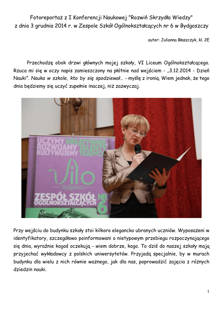 Fotoreportaż z I Konferencji Naukowej "Rozwiń Skrzydła Wiedzy" z dnia 3 grudnia 2014 r. w Zespole Szkół Ogólnokształcących nr 6 w Bydgoszczy autor: Julianna Błaszczyk, kl. 2E Przechodzę obok drzwi głównych mojej szkoły, VI Liceum Ogólnokształcącego. Rzuca mi się w oczy napis zamieszczony na płótnie nad wejściem - „3.12.2014 - Dzień Nauki”. Nauka w szkole, kto by się spodziewał… - myślę z ironią. Wiem jednak, że tego dnia będziemy się uczyć zupełnie inaczej, niż zazwyczaj. Przy wejściu do budynku szkoły stoi kilkoro elegancko ubranych uczniów. Wyposażeni w identyfikatory, szczegółowo poinformowani o nietypowym przebiegu rozpoczynającego się dnia, wyraźnie kogoś oczekują - wiem dobrze, kogo. To dziś do naszej szkoły mają przyjechać wykładowcy z polskich uniwersytetów. Przyjadą specjalnie, by w murach budynku dla wielu z nich równie ważnego, jak dla nas, poprowadzić zajęcia z różnych dziedzin nauki. 1 Długie oczekiwanie przerywa przybycie pierwszego wykładowcy, doktora Bogdana Małkowskiego, absolwenta naszego liceum. Powoli zjawiają się kolejni profesorowie, specjaliści z dziedziny fizyki, astrofizyki, biologii, historii, geografii, literatury, chemii i innych. Łącznie siedemnastu wykładowców. 2 W naszej szkole znajdują się klasy o różnych profilach, tematy zajęć zostały jednak zaplanowane w taki sposób, by każdy uczeń mógł uczestniczyć w interesujących go wykładach. Nie wszystkie tematy są ściśle związane z profilami, jakie wybrali uczniowie uczestniczę w zajęciach na temat chemii w kosmosie oraz fizyki strunowych instrumentów muzycznych, ale także na temat cyborgizacji w kulturze i sztuce, podróży edukacyjnych i tatuaży więziennych. 3 Wślizguję się na wykład o obliczach fantastyki dra Mirosława Gołuńskiego, odprowadzam koleżankę na rozmowę o falsyfikatach dzieł sztuki z mgr Agnieszką Markowską, a po drodze mijam przechodzącą korytarzem orkiestrę mającą wykonać pokazy na żywo do wykładu na temat ewolucji muzyki od średniowiecza do czasów współczesnych mgr Agnieszki Więckiewicz. Dla chętnych odbywają się nawet spotkania w językach obcych, które poprowadzili dr Wojciech Wachowski, inż. Christelle Langrand oraz dr Monika Izbaner. 4 Niektóre klasy mają możliwość uczestniczenia w warsztatach z matematyki i fizyki z pokazami interaktywnymi. Zajęcia wielu z nas zaskakują - włączamy się w rozmowy z prowadzącymi, zadajemy pytania, śmiejemy się z nimi. Choć o wiele od nas mądrzejsi, dostosowują formę swoich prezentacji do potrzeb gimnazjalistów oraz licealistów. 5 Czy wykłady jako forma nauki w szkole to dobry pomysł? „Uczniowie mogą więcej wynieść z wykładów, niż z kolejnych lekcji” - stwierdza zaproszony przez nas dr Wojciech Wachowski, który przedstawia wykład pt. „Języki w językach, czyli język polski i angielski znany i mniej znany”” Po skończonych zajęciach na szkolnym korytarzu rozbrzmiewają rozmowy - wychwytuję z nich strzępki ożywionych dyskusji na temat zajęć, potwierdzających opinię dra Wachowskiego. Nagle zdaję sobie sprawę z tego, że na jeden dzień to nasza szkoła stała się uniwersytetem, a przyjechali do nas goście z uczelni, na których wielu z nas chciałoby studiować. Poczuliśmy, że dzięki ciężkiej pracy możemy zrobić wiele i być może po latach odkryć coś, czym sami będziemy mogli pochwalić się przed młodzieżą zafascynowaną niezwykłością nauki. Projekt był pewnego rodzaju eksperymentem, ale spotkał się z aprobatą uczestników. „Sądzę, że to trafiony pomysł, który warto kontynuować!” - stwierdził absolwent naszej szkoły, prof. dr hab. Rufin Makarewicz. 6 Dzięki zaangażowaniu całej szkolnej społeczności, grudniowa I Konferencja Naukowa "Rozwiń Skrzydła Wiedzy" stała się sukcesem. Ciekawe, przygotowane dla nas wykłady profesorów pozostawiły niezapomniane wrażenia i zasiały w nas potrzebę dalszego naukowego rozwoju. Z niecierpliwością czekamy na kolejny Dzień Nauki za rok! 7