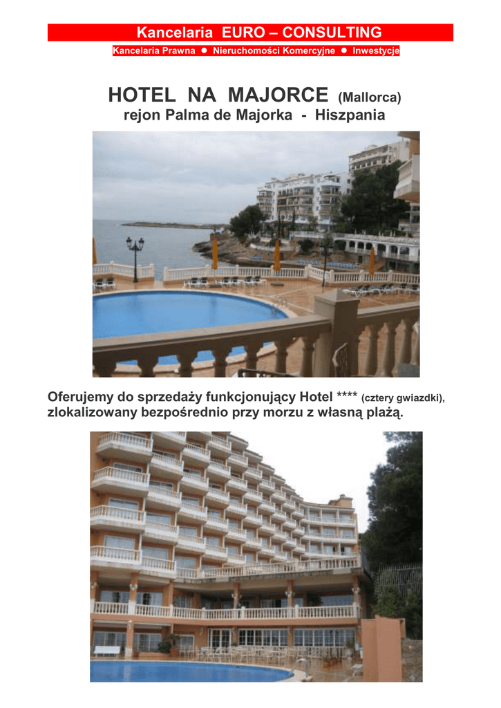 Kancelaria EURO – CONSULTING Kancelaria Prawna Nieruchomości Komercyjne Inwestycje HOTEL NA MAJORCE (Mallorca) rejon Palma de Majorka - Hiszpania Oferujemy do sprzedaŜy funkcjonujący Hotel **** (cztery gwiazdki), zlokalizowany bezpośrednio przy morzu z własną plaŜą. k KANCELARIA EURO - CONSULTING DORADZTWO PRAWNE NIERUCHOMOŚCI INWESTYCJE PL 04 - 730 WARSZAWA, Al. Dzieci Polskich 11 _____________________________________________________________________________________________________________2 Lokalizacja: Ilość pokoi: przedmieście Palmy de Mallorca, 2 km autostrada, 17 km lotnisko, pola golfowe ok. 1 km 159 (dwuosobowe – komfortowe, klimatyzacja, telewizja, telefon, itd.) Hotel posiada swoją nieduŜą własną plaŜę, ok. 60 m długości – zdjęcie widoczne powyŜej KANCELARIA EURO - CONSULTING DORADZTWO PRAWNE NIERUCHOMOŚCI INWESTYCJE PL 04 - 730 WARSZAWA, Al. Dzieci Polskich 11 _____________________________________________________________________________________________________________3 Nowoczesne windy, sala konferencyjna na 80 osób, własne parkingi, wynajem samochodów, basen, restauracja, bar. Oczekiwana cena: 25,5 mln EURO. Projekt sprzedaŜy prowadzi Kancelaria EURO – CONSULTING, która jako kancelaria prawna specjalizuje się w nieruchomościach komercyjnych. Kancelaria EURO-CONSULTING pracuje nad tym projektem od dłuŜszego czasu i ma podpisaną Umowę Zlecenia z właścicielem. Jesteśmy w kaŜdej chwili do Państwa dyspozycji. Wszelkie informacje uzyskacie Państwo pod nr 22 - 812 67 47, lub 601 - 355 041. E-mail: [email protected] 812 67 57