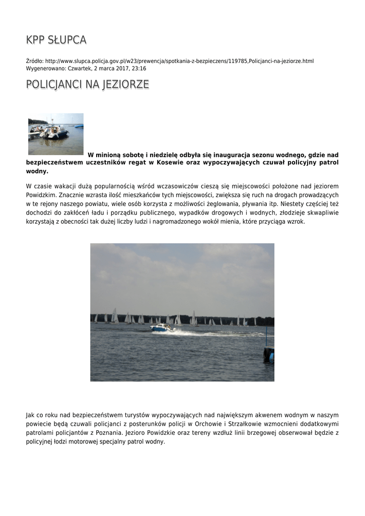 KPP SŁUPCA Źródło: http://www.slupca.policja.gov.pl/w23/prewencja/spotkania-z-bezpieczens/119785,Policjanci-na-jeziorze.html Wygenerowano: Czwartek, 2 marca 2017, 23:16 POLICJANCI NA JEZIORZE W minioną sobotę i niedzielę odbyła się inauguracja sezonu wodnego, gdzie nad bezpieczeństwem uczestników regat w Kosewie oraz wypoczywających czuwał policyjny patrol wodny. W czasie wakacji dużą popularnością wśród wczasowiczów cieszą się miejscowości położone nad jeziorem Powidzkim. Znacznie wzrasta ilość mieszkańców tych miejscowości, zwiększa się ruch na drogach prowadzących w te rejony naszego powiatu, wiele osób korzysta z możliwości żeglowania, pływania itp. Niestety częściej też dochodzi do zakłóceń ładu i porządku publicznego, wypadków drogowych i wodnych, złodzieje skwapliwie korzystają z obecności tak dużej liczby ludzi i nagromadzonego wokół mienia, które przyciąga wzrok. Jak co roku nad bezpieczeństwem turystów wypoczywających nad największym akwenem wodnym w naszym powiecie będą czuwali policjanci z posterunków policji w Orchowie i Strzałkowie wzmocnieni dodatkowymi patrolami policjantów z Poznania. Jezioro Powidzkie oraz tereny wzdłuż linii brzegowej obserwował będzie z policyjnej łodzi motorowej specjalny patrol wodny. W Kosewie i Powidzu na okres wakacji będą utworzone Sezonowe Posterunki Policji. Ocena: 0/5 (0) Tweetnij