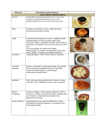 Potrawa Charakterystyka potrawy KUCHNIA ROSYJSKA kawior solona ikra ryb jesiotrowatych (kawior czarny lub rosyjski), łososiowatych (kawior czerwony), dorszowatych (kawior norweski) lub innych ryb. bliny drożdżowe naleśniki z ciasta z mąki gryczanopszennej lub gryczano-żytniej ołady smażone placki przygotowywane z rzadkiego ciasta sporządzonego na bazie pszennej mąki, jajek, kwaśnego mleka z dodatkiem drożdży lub proszku do pieczenia, ewentualnie sody oczyszczonej oraz cukru i soli. Do ciasta dodaje się czasem tarte jabłko. Ołady podaje się zwykle z bitą śmietaną, kawiorem lub na słodko: z miodem, powidłami, konfiturą rodzaj pierogów z dość luźnym farszem mięsnym. pielmieni wareniki (pierogi) potrawa wykonana z ciasta gotowanego, pieczonego lub smażonego na głębokim tłuszczu, uprzednio cienko rozwałkowanego i wypełnionego różnorodnymi nadzieniami kulebiak duży, pieczony pieróg nadziewany farszem z mięsa (czasem z ryb) z dodatkiem jarzyn, ryżu i przypraw Boeuf Stroganow pocięta na długie i cienkie paski polędwica wołowa smażona z cebulką i pieczarkami, które następnie dusi się w bulionie koncentratem pomidorowym, doprawiona śmietaną kwas chlebowy napój klasyfikowany jako bezalkoholowy, mimo niewielkiej zawartości alkoholu, wytwarzany przez fermentację chleba kumys napój ze sfermentowanego mleka klaczy; mleczny napój alkoholowy powstający w wyniku fermentacji alkoholowej cukru mlecznego ucha zawiesista zupa rybna przyrządzana z kilku gatunków ryb słodkowodnych, z których sporządza się bulion ( z dodatkiem warzyw i przypraw) szczi (kapuśniak) zupa z warzyw liściastych, z dodatkiem mięsa, grzybów lub ryb. W zależności od zastosowanego wywaru, szczi może być swoistym kapuśniakiem, zupą grzybową lub rybną, przy czym kapusta pozostaje składnikiem niezmiennym. okroszka popularna rosyjska zupa przyrządzana z żółtek, musztardy, kwasu chlebowego, ogórków, zieleniny oraz z pieczonej cielęciny i szynki; jest spożywana na zimno z dodatkiem śmietany herbata po rosyjsku herbata z samowara podana w szklance z koszyczkiem z cukrem w kostkach, cytryną, konfiturami i rumem watruszki słodkie okrągłe pierogi z ciasta drożdżowego, z nadzieniem z sera, owoców lub cebuli i twarogu kurnik pieróg weselny – kilka warstw naleśników przełożonych dżemem kulicz drożdżowa baba z bakaliami ze słodką polewą, posypana orzechami kotlet pożarski panierowany kotlet mielony z mięsa kurzego lub mieszanego kurzego i cielęcego bitki Skoboliewa małe okrągłe kotlety z mięsa wołowego (mielonego) i cielęcego (siekanego) podawane z sosem z szynki, ozorków i prawdziwków pascha tradycyjna potrawa wielkanocna przygotowywana z twarogu lub z mleka, śmietany, masła, zwykle z dodatkiem żółtek, cukru, wanilii i bakalii; zwykle bardzo słodka, podawana zazwyczaj w postaci ściętej piramidki ozdobionej rodzynkami i skórką pomarańczową barszcz (ukraiński, moskiewski, syberyjski, połtawski) zupa zaprawiana, w której skład wchodzą buraki, kapusta świeża oraz ziemniaki pokrojone w słupki; może zawierać kawałki gotowanego mięsa solanka gęsta zupa, ugotowana na mięsnym, rybnym bądź grzybowym rosole z dodatkiem aromatycznych przypraw ziołowych. Łączy w sobie cechy szczi i zupy ogórkowej. rosolnik (ogórkowa) rodzaj zupy ogórkowej, opartej na gotowanych nerkach cielęcych z dodatkiem pietruszki, poru, selera, cebuli i szczawiu oraz ziemniaków. Zupa powinna być klarowna. Zamiast nerek możliwe jest użycie podrobów kurzych. kotlet de volaille (kotlet po kijowsku) kotlet panierowany w jajku i bułce tartej, smażony na głębokim oleju sporządzony z roztłuczonej piersi kurczaka nadziewanej masłem i przyprawami. chołodeć ugotowane świńskie golonki w galarecie, podawane jako zimne zakąski razem z musztardą lub chrzanem kisiel zestalana na zimno potrawa o konsystencji gęstego żelu, podawana z bitą śmietanką lub słodkim mlekiem suszki, baranki i bubliki tradycyjnych rosyjskich wypieków o charakterze obwarzanków