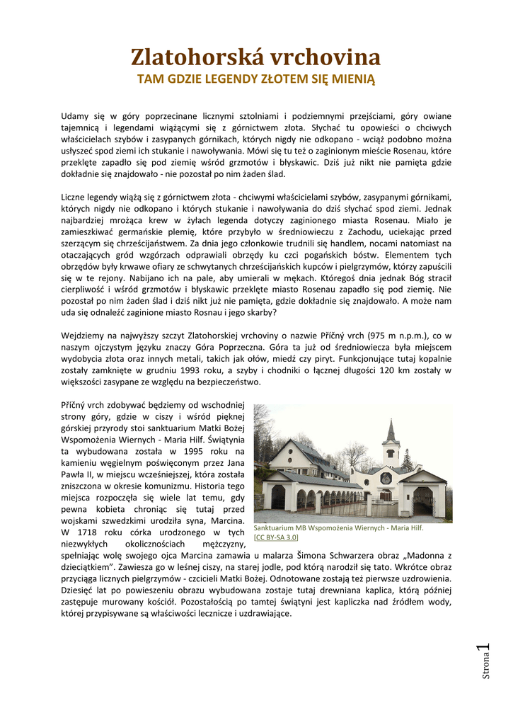 Zlatohorská vrchovina TAM GDZIE LEGENDY ZŁOTEM SIĘ MIENIĄ Udamy się w góry poprzecinane licznymi sztolniami i podziemnymi przejściami, góry owiane tajemnicą i legendami wiążącymi się z górnictwem złota. Słychać tu opowieści o chciwych właścicielach szybów i zasypanych górnikach, których nigdy nie odkopano - wciąż podobno można usłyszeć spod ziemi ich stukanie i nawoływania. Mówi się tu też o zaginionym mieście Rosenau, które przeklęte zapadło się pod ziemię wśród grzmotów i błyskawic. Dziś już nikt nie pamięta gdzie dokładnie się znajdowało - nie pozostał po nim żaden ślad. Liczne legendy wiążą się z górnictwem złota - chciwymi właścicielami szybów, zasypanymi górnikami, których nigdy nie odkopano i których stukanie i nawoływania do dziś słychać spod ziemi. Jednak najbardziej mrożąca krew w żyłach legenda dotyczy zaginionego miasta Rosenau. Miało je zamieszkiwać germańskie plemię, które przybyło w średniowieczu z Zachodu, uciekając przed szerzącym się chrześcijaństwem. Za dnia jego członkowie trudnili się handlem, nocami natomiast na otaczających gród wzgórzach odprawiali obrzędy ku czci pogańskich bóstw. Elementem tych obrzędów były krwawe ofiary ze schwytanych chrześcijańskich kupców i pielgrzymów, którzy zapuścili się w te rejony. Nabijano ich na pale, aby umierali w mękach. Któregoś dnia jednak Bóg stracił cierpliwość i wśród grzmotów i błyskawic przeklęte miasto Rosenau zapadło się pod ziemię. Nie pozostał po nim żaden ślad i dziś nikt już nie pamięta, gdzie dokładnie się znajdowało. A może nam uda się odnaleźć zaginione miasto Rosnau i jego skarby? Wejdziemy na najwyższy szczyt Zlatohorskiej vrchoviny o nazwie Příčný vrch (975 m n.p.m.), co w naszym ojczystym języku znaczy Góra Poprzeczna. Góra ta już od średniowiecza była miejscem wydobycia złota oraz innych metali, takich jak ołów, miedź czy piryt. Funkcjonujące tutaj kopalnie zostały zamknięte w grudniu 1993 roku, a szyby i chodniki o łącznej długości 120 km zostały w większości zasypane ze względu na bezpieczeństwo. Strona 1 Příčný vrch zdobywać będziemy od wschodniej strony góry, gdzie w ciszy i wśród pięknej górskiej przyrody stoi sanktuarium Matki Bożej Wspomożenia Wiernych - Maria Hilf. Świątynia ta wybudowana została w 1995 roku na kamieniu węgielnym poświęconym przez Jana Pawła II, w miejscu wcześniejszej, która została zniszczona w okresie komunizmu. Historia tego miejsca rozpoczęła się wiele lat temu, gdy pewna kobieta chroniąc się tutaj przed wojskami szwedzkimi urodziła syna, Marcina. Sanktuarium MB Wspomożenia Wiernych - Maria Hilf. W 1718 roku córka urodzonego w tych [CC BY-SA 3.0] niezwykłych okolicznościach mężczyzny, spełniając wolę swojego ojca Marcina zamawia u malarza Šimona Schwarzera obraz „Madonna z dzieciątkiem”. Zawiesza go w leśnej ciszy, na starej jodle, pod którą narodził się tato. Wkrótce obraz przyciąga licznych pielgrzymów - czcicieli Matki Bożej. Odnotowane zostają też pierwsze uzdrowienia. Dziesięć lat po powieszeniu obrazu wybudowana zostaje tutaj drewniana kaplica, którą później zastępuje murowany kościół. Pozostałością po tamtej świątyni jest kapliczka nad źródłem wody, której przypisywane są właściwości lecznicze i uzdrawiające. Podczas tej wędrówki zaglądniemy oczywiście do miasteczka o bogatej tradycjach górniczych, gdzie odbywały się nawet mistrzostwa świata w płukaniu złota. Nazywa się ono Zlaté Hory, czyli po polsku Złote Góry. Nieopodal niego nasza wycieczka nabędzie walorów poznawczoedukacyjnych, bowiem zwiedzając skansen górniczy zobaczymy jak dawniej obrabiano złotą rudę dla uzyskania najcenniejszego kruszcu. Hornický skanzen - Zlatorudné mlýny czynne: maj-sierpień od Pn do Nd w godz. 10.00-17.00 przewodnik: Karel Kozluk, tel. +420 721 930 684 bilety: dorośli 30,- Kč, dzieci 20,- Kč Zlatorudné mlýny. [CC BY-SA 3.0] Zdobywany podczas wędrówki szczyt Zlatohorskiej vrchoviny zaliczany jest do dwóch górskich koron: Příčný vrch (975 m n.p.m.) Korona Sudetów Korona Sudetów Czeskich Ponadto na trasie będziemy mieli kilka punktów kontrolnych do odznaki „111”: Sanktuarium Matki Bożej Wspomożenia Wiernych - Maria Hilf (1 pkt) Skansen „Zlatorudné mlýny” - Zlaté Hory (1 pkt) Muzeum Górnictwa - Zlaté Hory (1 pkt) PRZEBIEG I CHARAKTERYSTYKA TRASY: suma szlak/długość Sanktuarium MB Wspomożenia Wiernych - Maria Hilf (730 m n.p.m.) podejść zejść czas [gg:mm] czerwony 1.9 km 225 m 1m 1:00 czerwony 2.4 km 21 m 0m 0:40 czerwony 2.4 km 0m 21 m 0:35 czerwony 1.9 km 1m 225 m 0:30 8,6 km 247 m 247 m 2:45 Nr grupy górskiej Punkty GOT Kostel Panny Marie Pomocné - Maria Hilf (730 m n.p.m.) – Příčný vrch (975 m n.p.m.) CZECHY 6 Příčný vrch (975 m n.p.m.) – Kostel Panny Marie Pomocné - Maria Hilf (730 m n.p.m.) CZECHY 4 Hřeben, rozc. (954 m n.p.m.) Příčný vrch (975 m n.p.m.) Hřeben, rozc. (954 m n.p.m.) Sanktuarium MB Wspomożenia Wiernych - Maria Hilf (730 m n.p.m.) RAZEM ROZPIS TRASY DO KSIĄŻECZKI GOT 10 2 RAZEM Strona Trasa wycieczki