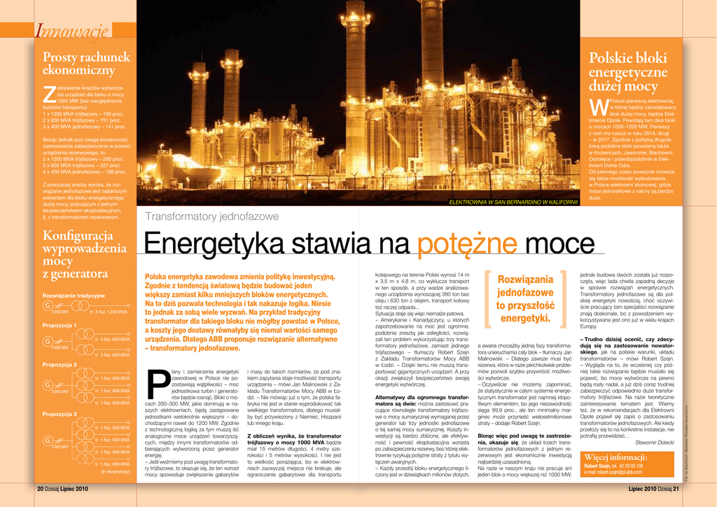 Innowacje Polskie bloki energetyczne dużej mocy Prosty rachunek ekonomiczny Z estawienie kosztów wytworzenia urządzeń dla bloku o mocy 1000 MW (bez uwzględnienia kosztów transportu): 1 x 1200 MVA trójfazowy – 100 proc. 2 x 600 MVA trójfazowy – 151 proc. 3 x 400 MVA jednofazowy – 141 proc. W Biorąc jednak pod uwagę konieczność zastosowania zabezpieczenia w postaci urządzenia rezerwowego, to: 2 x 1200 MVA trójfazowy – 200 proc. 3 x 600 MVA trójfazowy – 227 proc. 4 x 400 MVA jednofazowy – 188 proc. Konfiguracja wyprowadzenia mocy z generatora G 1000 MV tr 3-faz. 1200 MVA Propozycja 1 G tr 3-faz. 600 MVA 1000 MV tr 3-faz. 600 MVA Propozycja 2 G tr 1-faz. 400 MVA 1000 MV tr 1-faz. 400 MVA tr 1-faz. 400 MVA Propozycja 3 tr 1-faz. 400 MVA G tr 1-faz. 400 MVA 1000 MV tr 1-faz. 400 MVA tr 1-faz. 400 MVA (tr rezerwowy) 20 Dzisiaj Lipiec 2010 Elektrownia w San Bernardino w Kalifornii Transformatory jednofazowe Energetyka stawia na potężne moce Polska energetyka zawodowa zmienia politykę inwestycyjną. Zgodnie z tendencją światową będzie budować jeden większy zamiast kilku mniejszych bloków energetycznych. Na to dziś pozwala technologia i tak nakazuje logika. Niesie to jednak za sobą wiele wyzwań. Na przykład tradycyjny transformator dla takiego bloku nie mógłby powstać w Polsce, a koszty jego dostawy równałyby się niemal wartości samego urządzenia. Dlatego ABB proponuje rozwiązanie alternatywne – transformatory jednofazowe. P lany i zamierzenia energetyki zawodowej w Polsce nie pozostawiają wątpliwości – moc jednostkowa turbin i generatorów będzie rosnąć. Bloki o mocach 200–300 MW, jakie dominują w naszych elektrowniach, będą zastępowane jednostkami wielokrotnie większymi – dochodzącymi nawet do 1200 MW. Zgodnie z technologiczną logiką za tym muszą iść analogiczne moce urządzeń towarzyszących, między innymi transformatorów odbierających wytworzoną przez generator energię. – Jeśli weźmiemy pod uwagę transformatory trójfazowe, to okazuje się, że ten wzrost mocy spowoduje zwiększenie gabarytów i masy do takich rozmiarów, że pod znakiem zapytania staje możliwość transportu urządzenia – mówi Jan Malinowski z Zakładu Transformatorów Mocy ABB w Łodzi. – Nie mówiąc już o tym, że polska fabryka nie jest w stanie wyprodukować tak wielkiego transformatora, dlatego musiałby być przywieziony z Niemiec, Hiszpanii lub innego kraju. Z obliczeń wynika, że transformator trójfazowy o mocy 1000 MVA będzie miał 15 metrów długości, 4 metry szerokości i 5 metrów wysokości. I nie jest to wielkość porażająca, bo w elektrowniach zazwyczaj miejsca nie brakuje, ale ograniczenie gabarytowe dla transportu kolejowego na terenie Polski wynosi 14 m x 3,5 m x 4,8 m, co wyklucza transport w ten sposób, a przy wadze analizowanego urządzenia wynoszącej 390 ton bez oleju i 630 ton z olejem, transport kołowy też raczej odpada... Sytuacja staje się więc niemalże patowa. – Amerykanie i Kanadyjczycy, u których zapotrzebowanie na moc jest ogromne, podobnie zresztą jak odległości, rozwiązali ten problem wykorzystując trzy transformatory jednofazowe, zamiast jednego trójfazowego – tłumaczy Robert Szejn z Zakładu Transformatorów Mocy ABB w Łodzi. – Dzięki temu nie muszą transportować gigantycznych urządzeń. A przy okazji zwiększyli bezpieczeństwo swojej energetyki wytwórczej. Alternatywy dla ogromnego transformatora są dwie: można zastosowć pracujące równolegle transformatory trójfazowe o mocy sumarycznej wymaganej przez generator lub trzy jednostki jednofazowe o tej samej mocy sumarycznej. Koszty inwestycji są bardzo zbliżone, ale efektywność i pewność eksploatacyjna wzrasta po zabezpieczeniu rezerwy, bez której elektrownie ryzykują potężne straty z tytułu wyłączeń awaryjnych. – Każdy przestój bloku energetycznego liczony jest w dziesiątkach milionów złotych, Rozwiązania jednofazowe to przyszłość energetyki. a awaria chociażby jednej fazy transformatora unieruchamia cały blok – tłumaczy Jan Malinowski. – Dlatego zawsze musi być rezerwa, która w razie jakichkolwiek problemów pozwoli szybko przywrócić możliwości wytwórcze. – Oczywiście nie możemy zapominać, że statystycznie w całym systemie energetycznym transformator jest najmniej kłopotliwym elementem, bo jego niezawodność sięga 99,9 proc., ale ten minimalny margines może przynieść wielosetmilionowe straty – dodaje Robert Szejn. Biorąc więc pod uwagę te zastrzeżenia, okazuje się, że układ trzech transformatorów jednofazowych z jednym rezerwowym jest ekonomicznie inwestycją najbardziej uzasadnioną. Na razie w naszym kraju nie pracuje ani jeden blok o mocy większej niż 1000 MW, jednak budowa dwóch została już rozpoczęta, więc lada chwila zapadną decyzje w sprawie rozwiązań energetycznych. Transformatory jednofazowe są dla polskiej energetyki nowością, choć oczywiście pracujący tam specjaliści rozwiązanie znają doskonale, bo z powodzeniem wykorzystywane jest ono już w wielu krajach Europy. – Trudno dzisiaj ocenić, czy zdecydują się na zastosowanie nowatorskiego, jak na polskie warunki, układu transformatorów – mówi Robert Szejn. – Wygląda na to, że wcześniej czy później takie rozwiązanie będzie musiało się pojawić, bo moce wytwórcze na pewno będą rosły nadal, a już dziś coraz trudniej zabezpieczyć odpowiednio duże transformatory trójfazowe. Na razie teoretyczne zainteresowanie tematem jest. Wiemy też, że w rekomendacjach dla Elektrowni Opole pojawił się zapis o zastosowaniu transformatorów jednofazowych. Ale kiedy przełoży się to na konkretne instalacje, nie potrafię przewidzieć... Sławomir Dolecki Więcej informacji: Robert Szejn, tel. 42 29 93 108 e-mail: [email protected] Lipiec 2010 Dzisiaj 21 Fot. na kolumnach: Alexander Khodarev/www.sxc.hu Z powyższej analizy wynika, że rozwiązanie jednofazowe j