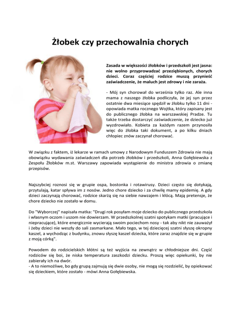 Żłobek czy przechowalnia chorych Zasada w większości żłobków i przedszkoli jest jasna: nie wolno przyprowadzać przeziębionych, chorych dzieci. Coraz częściej rodzice muszą przynieść zaświadczenie, że maluch jest zdrowy i nie zaraża. - Mój syn chorował do września tylko raz. Ale inna mama z naszego żłobka podliczyła, że jej syn przez ostatnie dwa miesiące spędził w żłobku tylko 11 dni opowiada matka rocznego Wojtka, który zapisany jest do publicznego żłobka na warszawskiej Pradze. Tu także trzeba dostarczyć zaświadczenie, że dziecko już wyzdrowiało. Kobieta za każdym razem przynosiła więc do żłobka taki dokument, a po kilku dniach chłopiec znów zaczynał chorować. W związku z faktem, iż lekarze w ramach umowy z Narodowym Funduszem Zdrowia nie mają obowiązku wydawania zaświadczeń dla potrzeb żłobków i przedszkoli, Anna Gołębiewska z Zespołu Żłobków m.st. Warszawy zapowiada wystąpienie do ministra zdrowia o zmianę przepisów. Najszybciej roznosi się w grupie ospa, bostonka i rotawirusy. Dzieci często się dotykają, przytulają, katar spływa im z nosów. Jedno chore dziecko i za chwilę mamy epidemię. A gdy dzieci zaczynają chorować, rodzice skarżą się na siebie nawzajem i kłócą. Mają pretensje, że chore dziecko nie zostało w domu. Do "Wyborczej" napisała matka: "Drugi rok posyłam moje dziecko do publicznego przedszkola i własnym oczom i uszom nie dowierzam. W przedszkolnej szatni spotykam matki (pracujące i niepracujące), które energicznie wycierają swoim pociechom nosy - tak aby nikt nie zauważył i żeby dzieci nie weszły do sali zasmarkane. Mało tego, w tej dziecięcej szatni słyszę okropny kaszel, a wychodząc z budynku, znowu słyszę kaszel dziecka, które zaraz znajdzie się w grupie z moją córką". Powodem do rodzicielskich kłótni są też wyjścia na zewnątrz w chłodniejsze dni. Część rodziców się boi, że niska temperatura zaszkodzi dziecku. Proszą więc opiekunki, by nie zabierały ich na dwór. - A to niemożliwe, bo gdy grupą zajmują się dwie osoby, nie mogą się rozdzielić, by opiekować się dzieckiem, które zostało - mówi Anna Gołębiewska. Piotr Stasiak, współwłaściciel niepublicznego przedszkola Jagódka w Warszawie, potwierdza: - Rodzice spierają się ze sobą, czasem wprowadzają nas w błąd. A przecież to, że rodzic płaci nam za opiekę, nie znaczy, że możemy przymykać oczy na choroby zakaźne. Jesteśmy przedszkolem, nie przychodnią. Dlatego jeśli dziecko choruje, przedszkole dzwoni po rodziców i prosi o odebranie dziecka. Stasiak opowiada, że niedawno po tygodniu choroby przyszedł do przedszkola chłopiec. Minęły dwa dni i infekcja wróciła: - Wezwaliśmy ojca. Przyznał, że mały dostał antybiotyk na dwa tygodnie, ale rodzice musieli wrócić po tygodniu do pracy, chłopiec poszedł więc wcześniej do przedszkola. - Czasem rodzice zarzekają się, że dziecko jest już zdrowe, po czym maluch siada na nocnik i wypada mu czopek przeciwgorączkowy. Tłumaczenie zawsze jest to samo: nie było go z kim zostawić - mówi Gołębiewska. Rodzice pracują do późna, opiekunki są drogie, dziadkowie mieszkają w innej części Polski, a szef krzywo patrzy na częste zwolnienia. Ostatnio przekonała się o tym samotna matka z Warszawy, pracownica firmy autobusowej, która - też w liście do "Wyborczej" - napisała, że została zwolniona z pracy, bo w ciągu roku spędziła 22 dni na zwolnieniu lekarskim, opiekując się trzyletnią córką. Ale dzieci tak łatwo przenoszą między sobą choroby nie tylko dlatego, że rodzice przyprowadzają je z objawami infekcji. - To nieuniknione - dzieci będą się od siebie zarażać. Najłatwiej o to w sytuacji, gdy choroba dopiero się rozwija. Objawów jeszcze nie ma, ale dziecko może już przenosić infekcję - mówi dr Paweł Szwedowicz, otolaryngolog z warszawskiej kliniki Optimum. Wirus może zaatakować grupę dzieci, nawet gdy żadne z podopiecznych nie wygląda na chore. Niniejszy materiał został opracowany na podstawie artykułu autorstwa Anity Karwowskiej, który ukazał się w Gazecie Wyborczej 05.11.2014r.