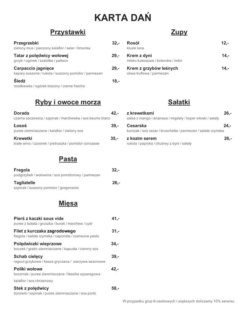 KARTA DAŃ Przystawki Zupy Przegrzebki 32, Rosół 12, zielony mus / pieczony kalafior / seler / limonka kluski lane Tatar z polędwicy wołowej 29, Krem z dyni 14, grzyb / ogórek / szalotka / patison mleko kokosowe / kolendra / imbir Carpaccio jagnięce 29, Krem z grzybów leśnych 14, kapary suszone / rukola / suszony pomidor / parmezan oliwa truflowa / parmezan Śledź 18, rzodkiewka / ogórek kiszony / creme fraiche Ryby i owoce morza Sałatki Dorada 42, z krewetkami 26, czarna soczewica / szpinak / marchewka / sos beurre blanc salsa z mango i ananasa / migdały / koper włoski / sałaty Łosoś 39, puree ziemniaczane / kalafior / zielony sos Cesarska 24, Krewetki 35, z kozim serem 26, białe wino / czosnek / pietruszka / pomidor concasse rukola / papryka / chutney z dyni / sałaty Pasta Fregola 32, podgrzybek / wołowina / sos pomidorowy / parmezan kurczak / sos cezar / bruschetta / parmezan / sałata rzymska Tagliatelle 26, szpinak / suszony pomidor / gorgonzola Mięsa Pierś z kaczki sous vide 41, puree z batata / gruszka / burak / marchew / cydr Filet z kurczaka zagrodowego 31, fregola / sałata rzymska / caponata / czerwone pesto Polędwiczki wieprzowe 34, boczek / gratin ziemniaczane / kapusta / ciemny sos Schab cielęcy 39, ragout grzybowe / kasza gryczana / warzywa sezonowe Poliki wołowe 42, boczniak / puree ziemniaczane / fasolka szparagowa kalafior / sos chrzanowy Stek z polędwicy 58, borowik / szpinak / puree ziemniaczane / sos porto W przypadku grup 6osobowych i większych doliczamy 10% serwisu Desery Kawa i herbata Panna cotta 13, espresso 6, marakuja / lody czekoladowe podwójne espresso 8, Torcik bezowy 15, cappuccino 8, owoce / mus orzechowy / sorbet truskawkowy americano 8, Mille feuille 15, latte 10, ciasto francuskie / krem z białej czekolady / owoce mokka 12, Deser lodowy 15, irish coffee 19, owoce / bita śmietana kawa mrożona 12, herbata w imbryczku 7, herbata mrożona 14, Koktajle 10, / 14, Lemoniady 12, 200 ml / 375 ml 250 ml arbuz / mięta 1 arbuz / limonka 2 arbuz / truskawka 3 melon / mango 4 melon / mango / jagoda 5 melon / banan / limonka 6 truskawka / mleko kokosowe / banan 7 truskawka / pomarańcza / banan 8 ananas / pomarańcza / banan 9 ananas / grejpfrut / imbir 10 ananas / malina 11 pomarańcza / wiśnie / limonka 12 pomarańcza / liczi / mango / malina 13 pomarańcza / trawa cytrynowa / chili / limonka 14 jabłko / arbuz 15 jabłko / melon / spirulina / mięta 16 jabłko / goji / jagody / maliny / jeżyny 17 limoniada tajska limoniada cytrynada Świeże soki 12, 250 ml sok pomarańczowy sok grejpfrutowy sok pomarańcz / grejpfrut sok pomarańcz / mięta sok jabłko / mięta sok jabłkowy Napoje zimne Piwa pepsi, pepsi light, 7up, mirinda 6, orkiszowe z miodem 10, 200 ml Jasne 5,1% 500ml sok yoga 7, pomarańczowy, gruszkowy, ananasowy, 200 ml warmińskie rewolucje 11, Lager jasny 5,2% 500ml brzoskwiniowy, pomidorowy wiśnia w piwie 10, woda surgiva 7, Piwo o smaku wiśniowym 5,2% 500ml gazowana, niegazowana 250 ml kormoran ciemny 10, woda surgiva 14, gazowana, niegazowana 750 ml Ciemne 4,5% 500ml żywiec 8, Jasne 5,5% 500ml