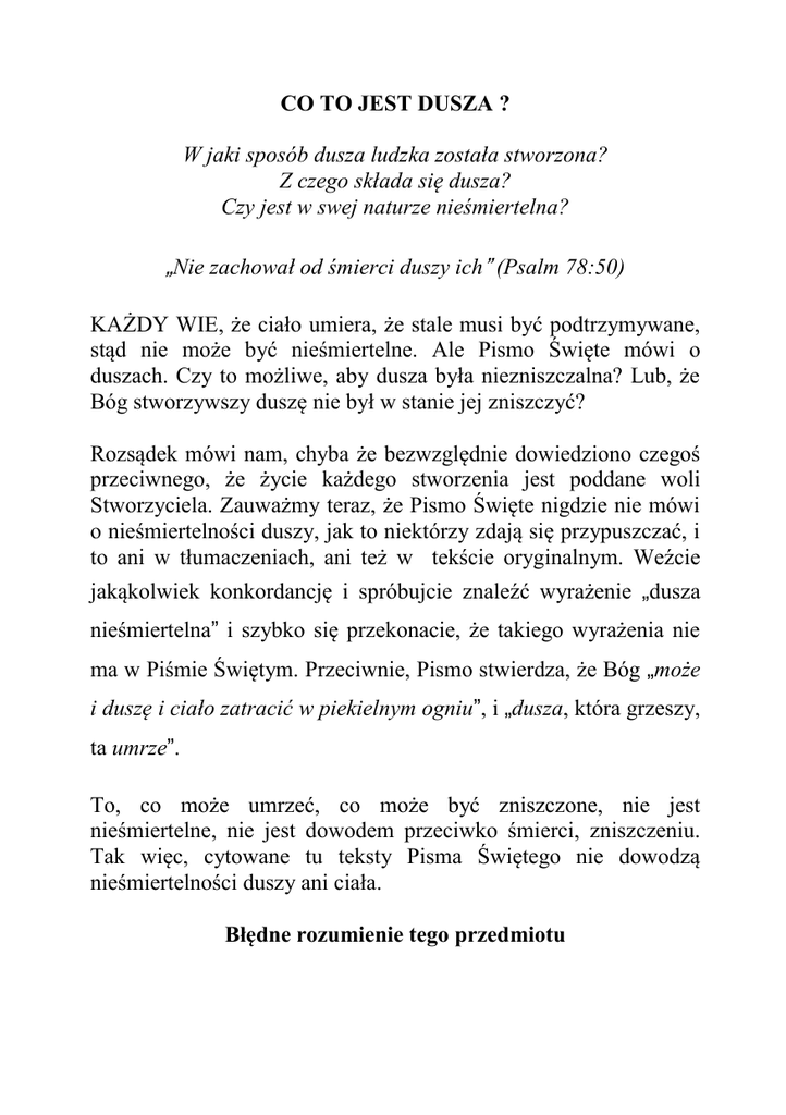CO TO JEST DUSZA ? W jaki sposób dusza ludzka została stworzona? Z czego składa się dusza? Czy jest w swej naturze nieśmiertelna? „Nie zachował od śmierci duszy ich” (Psalm 78:50) KAŻDY WIE, że ciało umiera, że stale musi być podtrzymywane, stąd nie może być nieśmiertelne. Ale Pismo Święte mówi o duszach. Czy to możliwe, aby dusza była niezniszczalna? Lub, że Bóg stworzywszy duszę nie był w stanie jej zniszczyć? Rozsądek mówi nam, chyba że bezwzględnie dowiedziono czegoś przeciwnego, że życie każdego stworzenia jest poddane woli Stworzyciela. Zauważmy teraz, że Pismo Święte nigdzie nie mówi o nieśmiertelności duszy, jak to niektórzy zdają się przypuszczać, i to ani w tłumaczeniach, ani też w tekście oryginalnym. Weźcie jakąkolwiek konkordancję i spróbujcie znaleźć wyrażenie „dusza nieśmiertelna” i szybko się przekonacie, że takiego wyrażenia nie ma w Piśmie Świętym. Przeciwnie, Pismo stwierdza, że Bóg „może i duszę i ciało zatracić w piekielnym ogniu”, i „dusza, która grzeszy, ta umrze”. To, co może umrzeć, co może być zniszczone, nie jest nieśmiertelne, nie jest dowodem przeciwko śmierci, zniszczeniu. Tak więc, cytowane tu teksty Pisma Świętego nie dowodzą nieśmiertelności duszy ani ciała. Błędne rozumienie tego przedmiotu Czymże więc jest dusza? Ogólne pojęcie o duszy określa ją jako coś nieokreślonego, co jest w nas, ale tylko niewielu próbuje wyjaśnić co to takiego i gdzie jest umiejscowione. Niektórzy twierdzą, że to nieznane coś jest rzeczywistą, inteligentną istotą, podczas gdy ciało jest po prostu jej mieszkaniem lub narzędziem. Pewien biskup metodysta określił kiedyś duszę w następujący sposób: „Nie ma ona ani wnętrza ani zewnętrza, nie posiada ciała, kształtu lub części, i milion dusz można umieścić w łupinie orzecha”. Można by rzec, że jest to bardzo dobra definicja niczego. Ciało nie jest duszą, jak to niektórzy utrzymują. Dowodzi tego Jezus, kiedy stwierdza, że Bóg „może i duszę i ciało, zatracić w piekielnym ogniu”. W świetle tego, jeśli wyzwolimy nasze umysły od uprzedzeń, powinniśmy być w stanie nauczyć się czegoś więcej w tym względzie badając natchniony opis stworzenia człowieka. Jak została stworzona dusza ludzka Udając się do 1 Mojż. 2:7 czytamy: „Stworzył tedy Pan Bóg człowieka z prochu ziemi, i natchnął [hebr. dmuchnął] w oblicze jego dech [hebr. wiatr, moc] żywota [hebr. życia, l. mn., to znaczy, że życie jako takie było wspólne wszystkim żywym stworzeniom]. I stał się człowiek duszą żywiącą [to jest, istotą czującą]”. Opis ten pokazuje, że najpierw zostało stworzone ciało, ale zanim nastąpiło ożywienie, nie był to człowiek, dusza lub istota. To ciało miało oczy, ale nic nie widziało, uszy, ale nic nie słyszało, usta, ale nic nie mówiło, język, ale nie czuło smaku, nozdrza, ale nie znało woni, serce, które nie pulsowało, krew, która była zimna, pozbawiona życia, płuca, które nie pracowały. Nie był to człowiek, ale zwłoki, nieożywione ciało. Drugi krok w procesie stwarzania człowieka stanowiło obdarzenie żywotnością właściwie „uformowanego” i pod każdym względem przygotowanego ciała. To jest opisane w słowach: „i tchnął w oblicze [nozdrza] jego dech żywota”. Gdy zdrowa osoba utonie i jej życie jest całkowicie zawieszone w swych funkcjach, przywrócenie do przytomności następuje przez poruszanie ramionami tak, by płuca pracowały jak miechy i stopniowo ustalało się oddychanie nosem. W przypadku Adama nie wymagało to oczywiście żadnego pracochłonnego wysiłku ze strony Stwórcy powodującego, by doskonały, stworzony przez Niego organizm zaczął oddychać życiodajnym tlenem atmosfery. Gdy ożywcze powietrze dostało się do płuc, nastąpiło ich rozszerzenie, cząsteczki krwi utleniły się i przesunęły się do serca, a ten organ przekazał je z kolei do każdej części ciała, budząc wszystkie przygotowane, ale dotychczas nie reagujące nerwy do energii i odczuwania. W jednej chwili energia dotarła do mózgu rozpoczynając proces myślenia, postrzegania, rozumowania, patrzenia, dotykania, odczuwania smaku, czucia i powonienia. To co było ludzkim organizmem pozbawionym życia, stało się człowiekiem, istotą czującą, osiągnięty został stan „duszy żywiącej” [żyjącej], o którym wspomina tekst. Innymi słowy termin „dusza żywiąca” oznacza ni mniej ni więcej tylko tyle co „istota czująca”, to znaczy istota zdolna do odczuwania, postrzegania i myślenia. Co więcej, chociaż Adam miał doskonały organizm, podtrzymywanie życia, duszy lub istoty czującej przez spożywanie owoców drzew żywota było dla niego niezbędne. A gdy zgrzeszył, Bóg wypędził go z ogrodu „by snać nie ściągnął ręki swej, i nie wziął z drzewa [l. mn., z drzew lub z sadu] żywota i nie jadł, i żyłby na wieki [tzn. stale spożywając z nich]” (1 Mojż. 3:22). O jakże rozprasza się mgła i tajemnica w świetle prawdy, która bije ze Słowa Bożego! Niższe zwierzęta są także duszami Tak więc zobaczymy jak to się dzieje, że Pismo Święte mówi o „duszy” w odniesieniu do niższych zwierząt. Podobnie jak człowiek, są one istotami czującymi lub istotami inteligentnymi, jednakże niższych rodzajów. Podobnie jak człowiek, mogą widzieć, słyszeć, czuć, odczuwać smak i mieć powonienie. I każde też może rozumować odpowiednio do poziomu swego własnego organizmu, chociaż żadne nie umie wnioskować w sposób zawiły, lub na tak wysokim poziomie jak człowiek. Różnica ta nie jest wynikiem posiadania przez człowieka innego rodzaju życia niż to, jakie posiadają niższe zwierzęta, wszyscy bowiem posiadają podobne siły witalne, z tego samego źródła lub fontanny życia, tego samego Stwórcy. Wszyscy podtrzymują życie w ten sam sposób, przez trawienie podobn