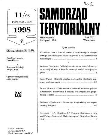 ISSN 0Rfi7 - Ml7:~ 1998 Miesięcznik Rok VIII Warszawa listopad 1998 Spis Mirosław Redaktor Naczelny Leon Kieres Stec - treści Podział zadań i kompetencji w nowym ustroju terytorialnym Polski (kryteria i ich normatywna realizacja) .......... ................... .. ............. .......... .. .......... ......... .. 3 ~·: * Sekretarz Redakcji Alicja Leszin Andrzej Sztando - Oddziaływanie samorządu na rozwój lokalny w świetle lokalnego ewolucji modeli ustmjowych gmin ....... .... ...... .... ............. ........... .................. ........ ........... .... 12 * Opracowanie graficzne Jerzy Burski ArturMyna - Rozwój lokalny, regionalne strategie roz- woju, regionalizacja ............... ... ... ... .... ..... ....................... ... 30 Paweł Roman - Zastosowania mikroekonomicznych in- strumentów planowania i analizy w darką lokalną Elżbieta czesnej zarządzaniu gospo- ..... .............. .. ............... ..... ....... .. ............ ....... . 49 Samorząd terytorialny we współ................... ........ ...... .. .......... ............. ..... ... 66 Pioskowik - Bułgarii Recenzje - S.A. Shapiro, J.P. Tomain: Regulatory Law and Policy. Cases and Materials (prof. Zbigniew Kmieciak) ......................... .................... ..... .. ............. ............ ....... . 77 Skład i łamanie: "Municipium" SA Druk i oprawa: lnterGraf Rada naukowa "Samorządu Terytorialnego'\ Barbara Adamiak, Antoni Agopszowicz, Janusz Borkowski, Piotr Buczkowski, Roman Chalirnoniuk, Teresa Dębowska-Romanowska, Tornasz Dybowski, Zyta Gitowska, Hubert Izdebski, Jan Jeżewski, Zbigniew Leoński, Zygmunt Niewiadomski, Eugeniusz Ochendowski, Karol Podgórski, Stanisław Prutis, Teresa Rabska, Joanna Regulska, Jerzy Regulski, Czesława Rudzka-Lorentz, Mirosław Stec, Jerzy Stępień, Andrzej Wasilewski, Aleksandra Wiktorowska, Elżbieta Wysocka ©for "Samorząd Terytorialny" All rights reserved Wydawca: Międzykomunalna Spółka Akcyjna "Municipium", ul. Marszałkowska 82, 00-517 Warszawa, konto: Bank Inicjatyw Gospodarczych SA, lO/Warszawa, nr - 11601029-9032001. Adres Redakcji: ul. Marszałkowska 82, 00-517 Warszawa, te!. 625-23-32, 628-77-68, 625-22-96. Andrzej Sztando Oddziaływanie samorządu lokalnego na rozwój lokalny w świetle ewolucji modeli ustrojowych gmin Za przykład może tu posłużyć definicja, której autorem jest R. Rezsohazy. Określa on rozwój lokalny jako "zharmonizowane i systematyczne działanie , prowadzone w społeczności lokalnej, z udziałem zainteresowanych, którego rezultaty służą zaspokajaniu potrzeb społecznych miejscowej ludności i przyczyniają się do ogólnego postę pu"3. Społeczność lokalna pojawia się również w innych ujęciach rozwoju lokalnego. Z rozwojem lokalnym wiąże ją również J. Parysek, dla którego rozwój lokalny to "prowadzenie działań na rzecz rozwoju gospo" darczego i społecznego danej jednostki terytorialnej (miasta, gminy) z wykorzystaniem jej zasobów, uwzględnieniem potrzeb mieszkańców oraz przy ich udziale w podejmowanych działaniach" oraz R. Broi, traktujący rozwój lokalny jako "zharmonizowane i systematyczne działanie społeczności lokalnej, władzy lokalnej oraz pozostałych podmiotów funkcjonujących w gminie zmierzające do kreowania nowych i poprawy istniejących walorów użytkowych gminy, twoI'zenia korzystnych warunków dla lokalnej gospodarki oraz zapewnienia ładu przestrzennego i ekologicznego" 5 . 4 1. Rozwój lokalny Wielokrotnie podejmowana w literaturze ekonomicznej problematyka rozwoju jest bardzo rozległa i złożona. Powszechna jest jednak zgodność opinii, że pojęcie rozwoju powinno być zawsze kojarzone z pożądany mi, pozytywnymi przeobrażeniami ilościo wych, jakościowych i strukturalnych właści wości danego układu. Jeśli będzie nim wyodrębniona struktura społeczno-terytorial na, posiadająca zbiór charakterystycznych dla siebie cech gospodarczych, przestrzennych i kulturowych, wyrażająca własne potrzeby oraz hierarchię wartości, wtedy bę dziemy mieli do czynienia z rozwojem w skali lokalnej'. Liczne określenia pojawiające się w literaturze przedmiotu, mimo niezbędnych uproszczeń, wydają się w precyzyjny sposób wyjaśniać jego istotę . Prezentują bowiem zarówno lokalność rozwoju, jak i jego skutki oraz czynniki o nim decydujące2 . 2. Podmiotowość lokalnych Analizując publikacje poświęcone omawianej problematyce, łatwo dojść do wniosku, iż podmiotowość społeczności lokalnych znajduje swój wyraz we wszystkich charakterystykach rozwoju lokalnego. Jaka jest tego przyczyna? Otóż społeczność lokalna, mimo iż składa się z różnorodnych gn1p ludzkich, posiada bardzo ważną cechę , którą jest " R. Rczsuhazy: Le dćvcloppcm c nl des commuCIACO Editcur, Louvain-la-Ncuvc 1988. 'J. Parysck: Rola samorządu l cryto1·ialn cgo w rozwoju lokalnym , (w:) Rozwój lokalny: zagospodarowanie przestrzenne i nisze atrakcyjno ś ci gospodarczej , PWN, Warszawa 1995, s. 37 . 5 R. Broi : Rozwój lokalny- nowa logika rozwoju gospodarczego, (w:) Guspodarka lokalna w teorii i w pt·aktyce, PN AE we Wrocławiu m· 785, Wrocław 1998, s. 11. nautćs , ' Por.: L. Wojtasicwicz: Czynniki i bariery rozwoju lokalnego w aktualnej polityce gospodarczej Polski, (w:) Gospodarka lokalna w teorii i w praktyce, PN AE we Wrocławiu m· 734, Wrocław 1996, s. 14. 2 D. Śnicgowska: Samorząd terytorialny a rozwój gospodarki lokalnej, (w:) Gospodarka lokalna w warunkach samorządno śc i, ZN AE w Poznaniu nr 205, Poznań 1992, s. 87. społeczności Andrzej Sztando, Oddziaływanie samorządu szczególny stosunek do zamieszkiwanego terytorium. Jest ono dla niej zawsze jakąś wartością- emocjonalną, kulturową, tradycyjną, ekonomiczną, przyrodniczą czy jeszcze inną 6 • Badania socjologiczne dowodzą, iż więzi łą czące członków społeczności lokalnej wywoz potrzeby rozwiązywania wspólnych, lokalnych problemów. Dzieje się tak dlatego, ż