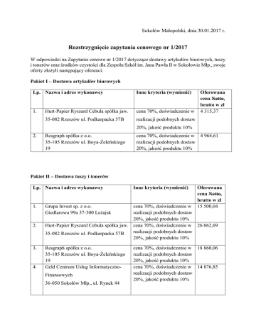 Rozstrzygnięcie zapytania cenowego nr 1/2017