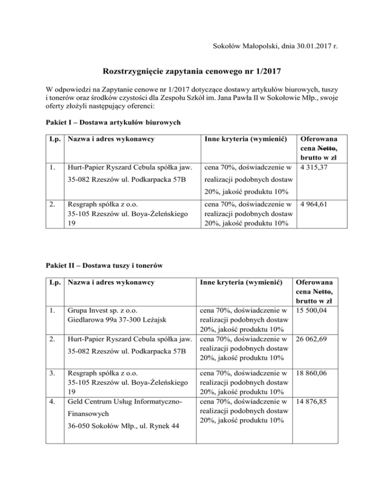 Sokołów Małopolski, dnia 30.01.2017 r. Rozstrzygnięcie zapytania cenowego nr 1/2017 W odpowiedzi na Zapytanie cenowe nr 1/2017 dotyczące dostawy artykułów biurowych, tuszy i tonerów oraz środków czystości dla Zespołu Szkół im. Jana Pawła II w Sokołowie Młp., swoje oferty złożyli następujący oferenci: Pakiet I – Dostawa artykułów biurowych Lp. Nazwa i adres wykonawcy 1. Inne kryteria (wymienić) Hurt-Papier Ryszard Cebula spółka jaw. cena 70%, doświadczenie w 35-082 Rzeszów ul. Podkarpacka 57B realizacji podobnych dostaw Oferowana cena Netto, brutto w zł 4 315,37 20%, jakość produktu 10% 2. Resgraph spółka z o.o. 35-105 Rzeszów ul. Boya-Żeleńskiego 19 cena 70%, doświadczenie w 4 964,61 realizacji podobnych dostaw 20%, jakość produktu 10% Pakiet II – Dostawa tuszy i tonerów Lp. Nazwa i adres wykonawcy 1. 2. 3. 4. Inne kryteria (wymienić) Oferowana cena Netto, brutto w zł 15 500,04 cena 70%, doświadczenie w realizacji podobnych dostaw 20%, jakość produktu 10% Hurt-Papier Ryszard Cebula spółka jaw. cena 70%, doświadczenie w 26 062,69 realizacji podobnych dostaw 35-082 Rzeszów ul. Podkarpacka 57B 20%, jakość produktu 10% Grupa Invest sp. z o.o. Giedlarowa 99a 37-300 Leżajsk Resgraph spółka z o.o. 35-105 Rzeszów ul. Boya-Żeleńskiego 19 Geld Centrum Usług InformatycznoFinansowych 36-050 Sokołów Młp., ul. Rynek 44 cena 70%, doświadczenie w 18 860,06 realizacji podobnych dostaw 20%, jakość produktu 10% cena 70%, doświadczenie w 14 876,85 realizacji podobnych dostaw 20%, jakość produktu 10% Pakiet III – Dostawa środków czystości Lp. Nazwa i adres wykonawcy 1. 2. 3. 4. Inne kryteria (wymienić) Ania sp. z o.o. 35-011 Rzeszów ul. Józefa Sondeja 13 Oferowana cena Netto, brutto w zł 33 771,76 cena 70%, doświadczenie w realizacji podobnych dostaw 20%, jakość produktu 10% Resgraph spółka z o.o. cena 70%, doświadczenie w 42 697,71 35-105 Rzeszów ul. Boya-Żeleńskiego realizacji podobnych dostaw 19 20%, jakość produktu 10% Hurt-Papier Ryszard Cebula spółka jaw. cena 70%, doświadczenie w 31 605,08 realizacji podobnych dostaw 35-082 Rzeszów ul. Podkarpacka 57B 20%, jakość produktu 10% F. H Soft spółka jaw. 35-021 Rzeszów ul. Prof. L. Chmaja 4 cena 70%, doświadczenie w 37 336,05 realizacji podobnych dostaw 20%, jakość produktu 10% W związku z tym, że wszyscy dostawcy zaproponowali oryginalne produkty, wykazali się doświadczeniem w realizacji podobnych dostaw typując dostawcę kierowano się najniższą ceną za pakiet. W związku z tym wybiera się następujących dostawców: Pakiet I – Dostawa artykułów biurowych Hurt-Papier Ryszard Cebula spółka jaw. 35-082 Rzeszów ul. Podkarpacka 57B Pakiet II – Dostawa tuszy i tonerów Geld Centrum Usług Informatyczno-Finansowych 36-050 Sokołów Młp., ul. Rynek 44 Pakiet III – Dostawa środków czystości Hurt-Papier Ryszard Cebula spółka jaw. 35-082 Rzeszów ul. Podkarpacka 57B Umowy zostaną zawarte zgodnie z art. 4 pkt. 8 ustawy Prawo Zamówień Publicznych. Dziękujemy wszystkim za złożenie ofert.