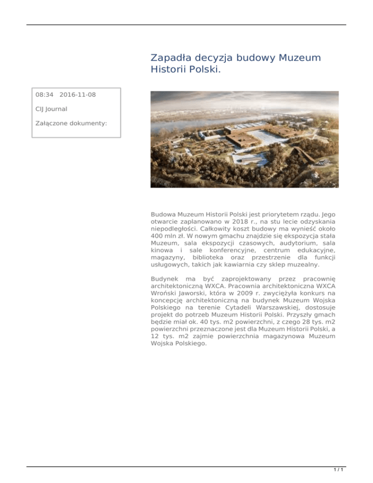 Zapadła decyzja budowy Muzeum Historii Polski. 08:34 2016-11-08 CIJ Journal Załączone dokumenty: Budowa Muzeum Historii Polski jest priorytetem rządu. Jego otwarcie zaplanowano w 2018 r., na stu lecie odzyskania niepodległości. Całkowity koszt budowy ma wynieść około 400 mln zł. W nowym gmachu znajdzie się ekspozycja stała Muzeum, sala ekspozycji czasowych, audytorium, sala kinowa i sale konferencyjne, centrum edukacyjne, magazyny, biblioteka oraz przestrzenie dla funkcji usługowych, takich jak kawiarnia czy sklep muzealny. Budynek ma być zaprojektowany przez pracownię architektoniczną WXCA. Pracownia architektoniczna WXCA Wroński Jaworski, która w 2009 r. zwyciężyła konkurs na koncepcję architektoniczną na budynek Muzeum Wojska Polskiego na terenie Cytadeli Warszawskiej, dostosuje projekt do potrzeb Muzeum Historii Polski. Przyszły gmach będzie miał ok. 40 tys. m2 powierzchni, z czego 28 tys. m2 powierzchni przeznaczone jest dla Muzeum Historii Polski, a 12 tys. m2 zajmie powierzchnia magazynowa Muzeum Wojska Polskiego. 1/1