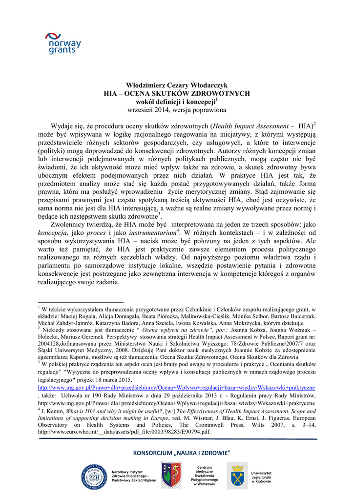 Włodzimierz Cezary Włodarczyk HIA – OCENA SKUTKÓW ZDROWOTNYCH wokół definicji i koncepcji1 wrzesień 2014, wersja poprawiona Wydaje się, że procedura oceny skutków zdrowotnych (Health Impact Assessment – HIA)2 może być wpisywana w logikę racjonalnego reagowania na inicjatywy, z którymi występują przedstawiciele różnych sektorów gospodarczych, czy usługowych, a które to interwencje (polityki) mogą doprowadzać do konsekwencji zdrowotnych. Autorzy różnych koncepcji zmian lub interwencji podejmowanych w różnych politykach publicznych, mogą często nie być świadomi, że ich aktywność może mieć wpływ także na zdrowie, a skutek zdrowotny bywa ubocznym efektem podejmowanych przez nich działań. W praktyce HIA jest tak, że przedmiotem analizy może stać się każda postać przygotowywanych działań, także forma prawna, która ma posłużyć wprowadzeniu życie merytorycznej zmiany. Stąd zajmowanie się przepisami prawnymi jest często spotykaną treścią aktywności HIA, choć jest oczywiste, że sama norma nie jest dla HIA interesującą, a ważne są realne zmiany wywoływane przez normę i będące ich następstwem skutki zdrowotne3. Zwolennicy twierdzą, że HIA może być interpretowana na jeden ze trzech sposobów: jako koncepcja, jako proces i jako instrumentarium4. W różnych kontekstach – i w zależności od sposobu wykorzystywania HIA – nacisk może być położony na jeden z tych aspektów. Ale warto też pamiętać, że HIA jest praktycznie zawsze elementem procesu politycznego realizowanego na różnych szczeblach władzy. Od najwyższego poziomu władztwa rządu i parlamentu po samorządowe instytucje lokalne, wszędzie postawienie pytania i zdrowotne konsekwencje jest postrzegane jako zewnętrzna interwencja w kompetencje któregoś z organów realizującego swoje zadania. 1 W tekście wykorzystałem tłumaczenia przygotowane przez Członkinie i Członków zespołu realizującego grant, w składzie: Maciej Rogala, Alicja Domagała, Beata Piórecka, Malinowska-Cieślik, Monika Ścibor, Bartosz Balcerzak, Michał Zabdyr-Jamróz, Katarzyna Badora, Anna Szetela, Iwona Kowalska, Anna Mokrzycka, którym dziekuj,e 2 Niekiedy stosowane jest tłumaczenie “ Ocena wpływu na zdrowie”, por.: Joanna Kobza, Joanna Woźniak – Holecka, Mariusz Geremek Perspektywy stosowania strategii Health Impact Assessment w Polsce, Raport grant nr: 2004128,dofinansowana przez Ministerstwo Nauki i Szkolnictwa Wyższego: 78/Zdrowie Publiczne/2007/7 oraz Śląski Uniwersytet Medyczny, 2008. Dziękuję Pani doktor nauk medycznych Joannie Kobzie za udostępnienie egzemplarza Raportu, możliwe są też tłumaczenia: Ocena Skutku Zdrowotnego, Ocena Skutków dla Zdrowia 3 W polskiej praktyce rządzenia ten aspekt ocen jest brany pod uwagę w procedurze i praktyce „ Oceniania skutków regulacji” "Wytyczne do przeprowadzania oceny wpływu i konsultacji publicznych w ramach rządowego procesu legislacyjnego" projekt 18 marca 2015, http://www.mg.gov.pl/Prawo+dla+przedsiebiorcy/Ocena+Wplywu+regulacji+baza+wiedzy/Wskazowki+praktyczne , także: Uchwała nr 190 Rady Ministrów z dnia 29 października 2013 r. - Regulamin pracy Rady Ministrów, http://www.mg.gov.pl/Prawo+dla+przedsiebiorcy/Ocena+Wplywu+regulacji+baza+wiedzy/Wskazowki+praktyczne 4 J. Kemm, What is HIA and why it might be useful?, [w:] The Effectiveness of Health Impact Assessment. Scope and limitations of supporting decision making in Europe, red. M. Wismar, J. Blau, K. Ernst, J. Figueras, European Observatory on Health Systems and Policies, The Crommwell Press, Wilts 2007, s. 3–14, http://www.euro.who.int/__data/assets/pdf_file/0003/98283/E90794.pdf. KONSORCJUM „NAUKA I ZDROWIE” Narodowy Instytut Zdrowia Publicznego – Państwowy Zakład Higieny Centrum Medyczne Kształcenia Podyplomowego w Warszawie Uniwersytet Jagielloński w Krakowie Polityczny kontekst Możliwość zaistnienia konsekwencji zdrowotnych musi być często ujawniana autorom interwencji przez zewnętrzny podmiot, świadomy tego rodzaju zagrożeń i rola taka wielokrotnie przypada przedstawicielowi resortu zdrowia. Ponieważ jednak pozycja Ministerstw Zdrowia jest często słaba w stosunku do pozycji i siły innych ministerstw, co ma miejsce nie tylko w naszym kraju, samo ostrzeżenie, czy wezwania do czujności, nie zawsze bywa skuteczne. Stąd znacznie większe prawdopodobieństwo uzyskania pozytywnego rezultatu, jeśli ostrzeżenie o zdrowotnym zagrożeniu jest wynikiem sformalizowanego postępowania, takiego jak HIA. Nie zawsze jednak, naturalnie, uboczne efekty zdrowotne różnych interwencji są negatywne. Może być tak, że wiele działań, takich jak rozbudowa komunikacji, zmiany zabudowy, aktywność opiekuńcza, pomoc udzielana rodzinom, czy zmiany podatkowe prowadzą do pozytywnych zmian zdrowotnych, Zatem HIA nie służy wyłącznie ostrzeganiu, choć ten aspekt jej stosowania jest z pewnością bardzo ważny, a dla osób uznających priorytetową wartość zdrowia szczególnie atrakcyjny. Ustalenia HIA mogą przyczyniać się do ujawniania skutków pozytywnych, co w politycznych procesach decyzyjnych staje się dodatkowym argumentem podkreślającym walory rozpatrywanego przedsięwzięcia. Podkreślanie uwikłania, czy powiązania procedury HIA z procesem politycznym nie jest formą krytyki, ale stwierdzeniem istnienia tej cechy. Mimo pozoru koncentrowania się na merytorycznych sprawach związanych ze zdrowiem, jest ciągiem zdarzeń, które bardzo głęboko penetrują sferę władzy. Jeśli przyjmuje się, że HIA jest stosowane wobec zamierzeń wynikających z aktywności różnych resortów, to zwykle każdy z nich czuje się suwerennym autorem, czy wręcz właścicielem prezentowanych pomysłów. Wątpliwości zgłaszane przez zewnętrzny podmiot, nawet w najbardziej szlachetnej intencji – jak zdrowie – może być łatwo postrzegane jako głos niekompetentnego intruza. Może to prowadzić do sporu o granice k